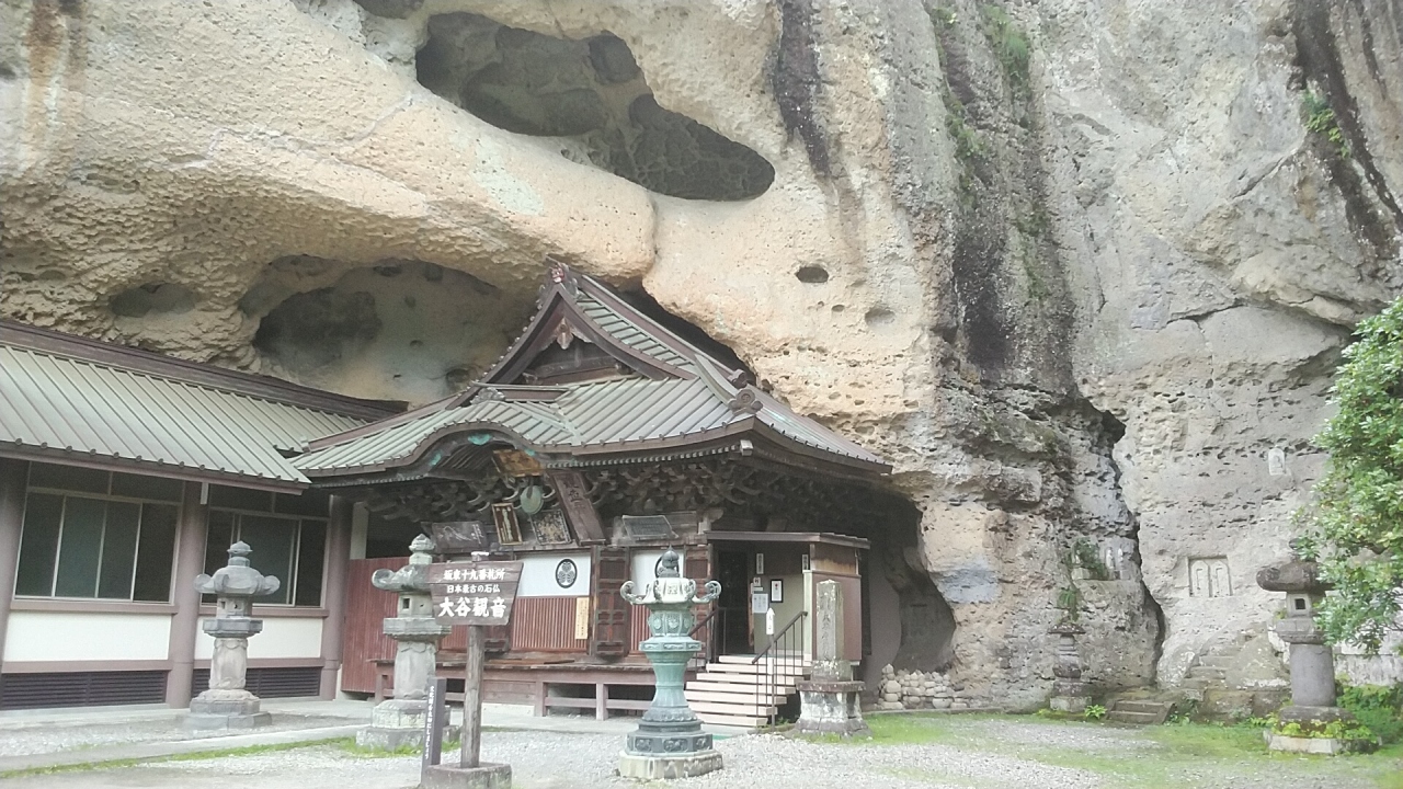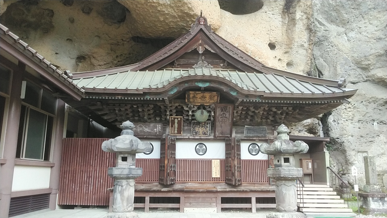 大谷寺本堂と、千手観音などが彫られた壁面(観音様は建物内)