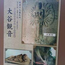日本最古の石窟仏で、弘法大師の作ともいわれている千手観音立像。本堂内には、千手観音とともに、釈迦三尊、薬師三尊、阿弥陀三尊が配置され、その十体を総称して大谷崖窟仏と呼ばれており、国の特別史跡重要文化財の二重指定を受けている。