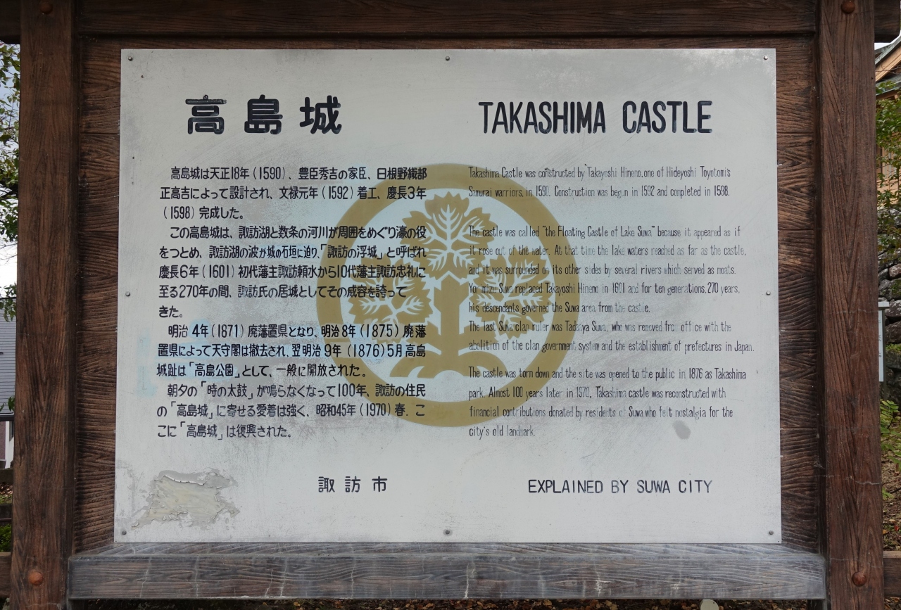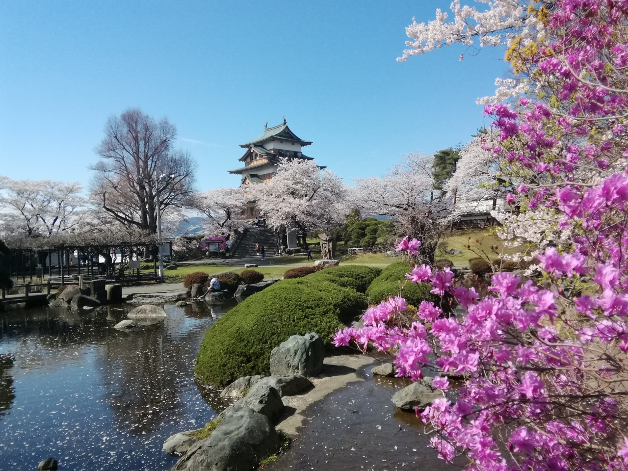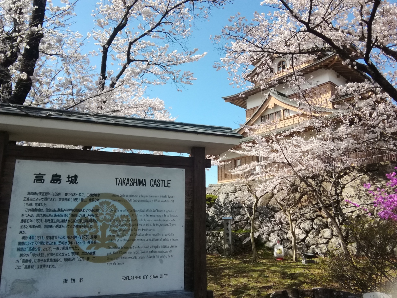 約400年前に築城された高島城。築城当時、諏訪湖の水が城際まで迫り、諏訪湖上に浮いているように見えることから、別名「諏訪の浮城」と呼ばれていました。現在の天守閣は昭和45年に復興されたものです。 本丸跡は公園となっており、春には桜、夏には藤、秋には紅葉が楽しめます。
