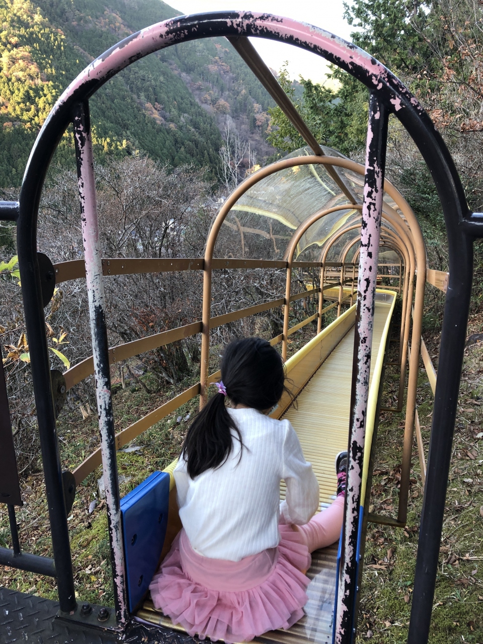 子どもは合掌造りなど興味ないので、滑り台にまっしぐら。