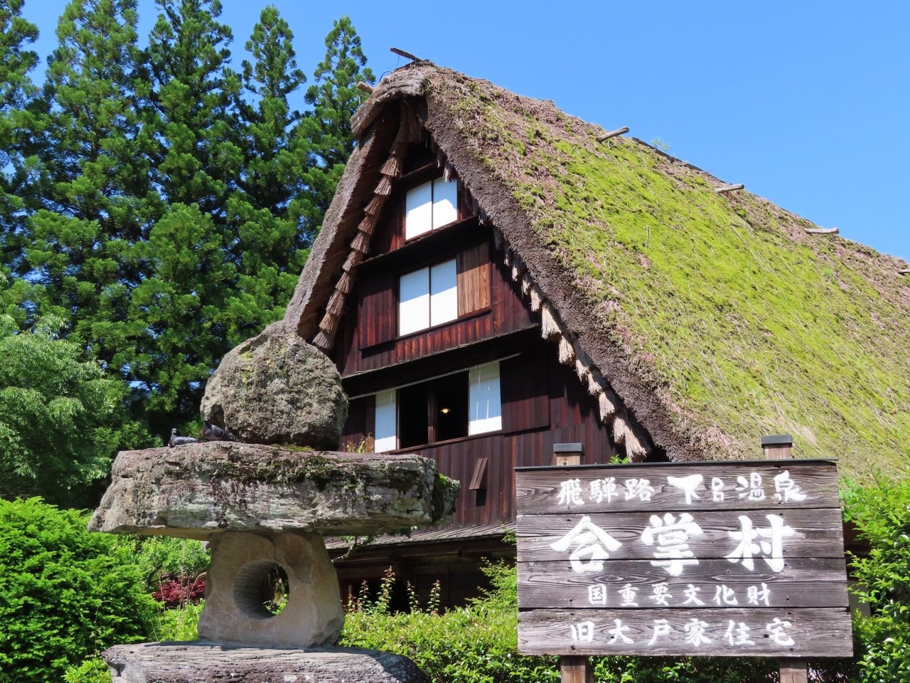下呂温泉合掌村は、国指定重要有形民俗文化財「旧大戸家住宅」をはじめ、白川郷などから移築した10棟の合掌造りからなる博物館です。村内では、合掌造りの内部を見学できるほか、陶芸や和紙の絵漉きができる体験工房、昔懐かしい里山を再現した「歳時記の森」などがあります。