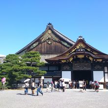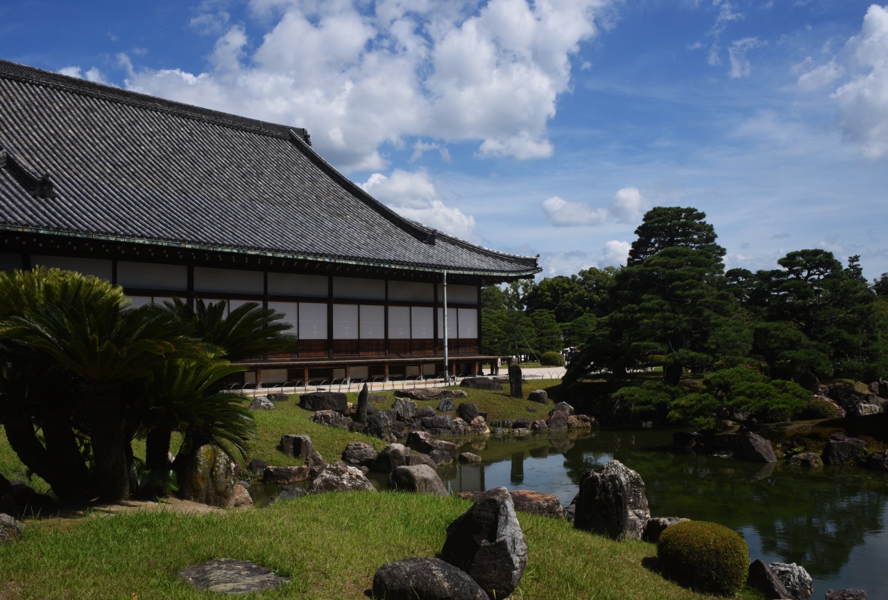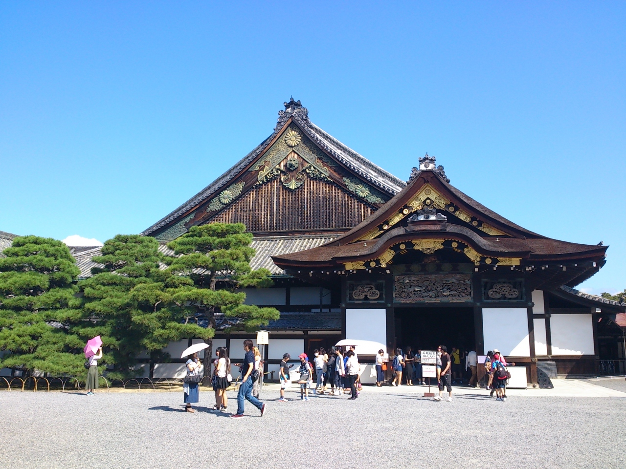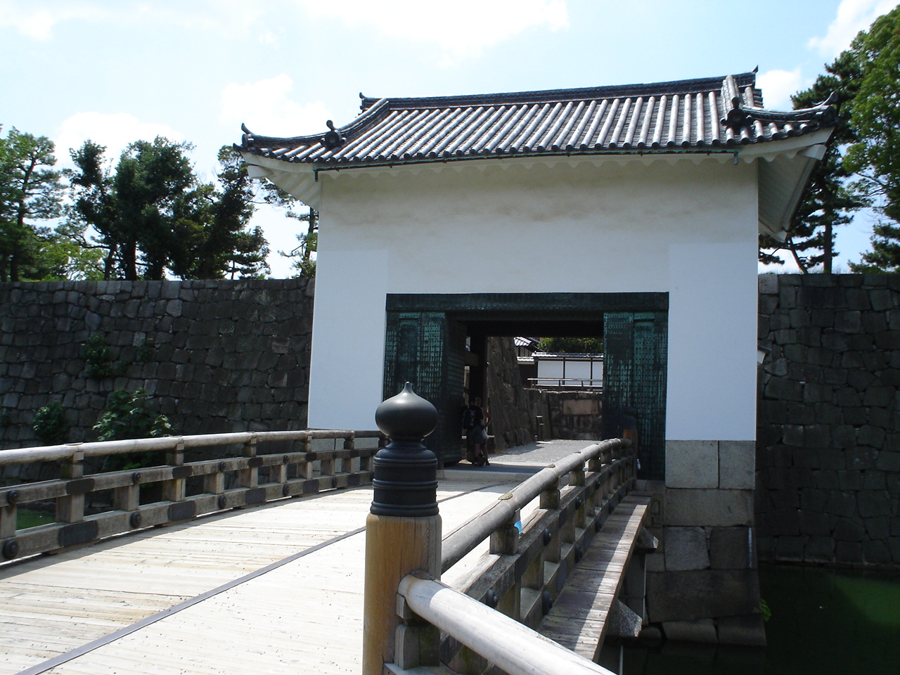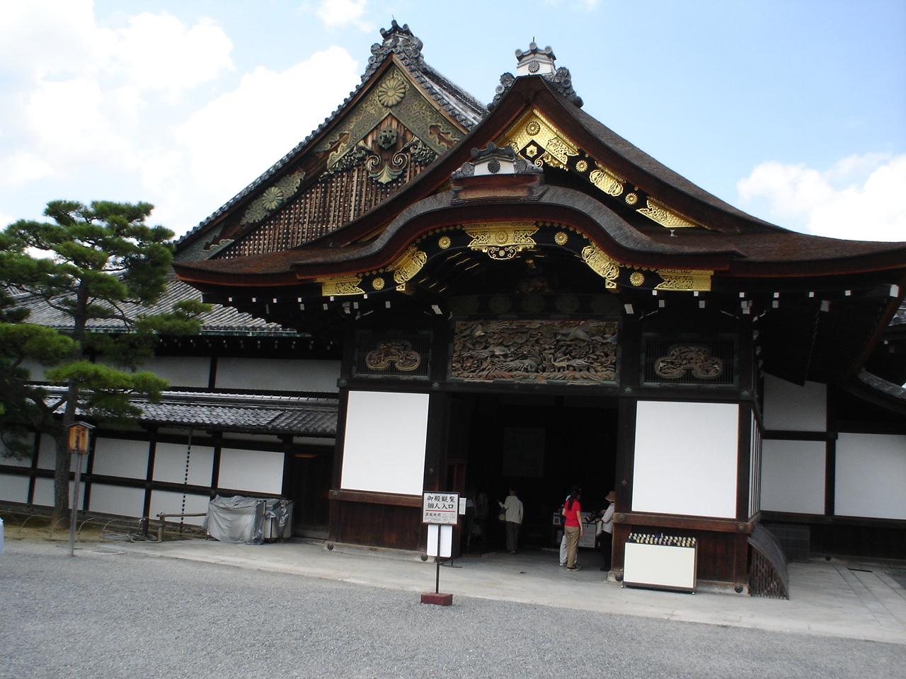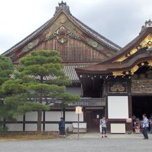 徳川家康が上洛時の宿舎として築城。家康と秀頼の二条城会見、慶喜の大政奉還の発表が行われた。二の丸御殿は、武家風書院造の代表的な建築で、各部屋の襖絵は狩野派の作品。廊下は鶯張りといわれ、各所に施された欄間彫刻、飾金具などの装飾が華麗な桃山文化を伝える。二の丸庭園は豪壮な石組みの書院造庭園。本丸御殿は明治中期に京都御所の旧桂宮御殿を移した公家風の瀟洒な建物で、本丸庭園は、芝庭風築山式庭園になっている。