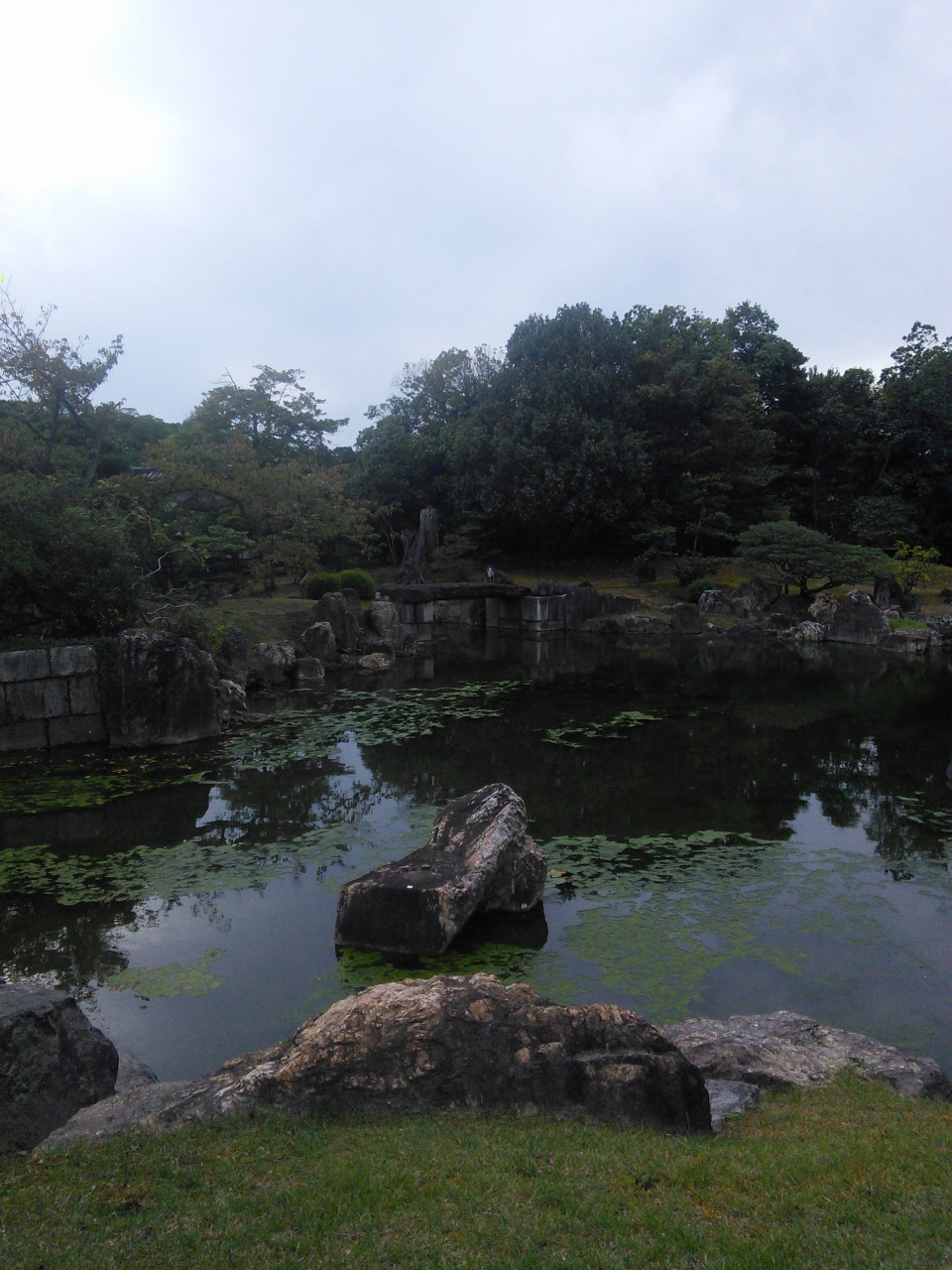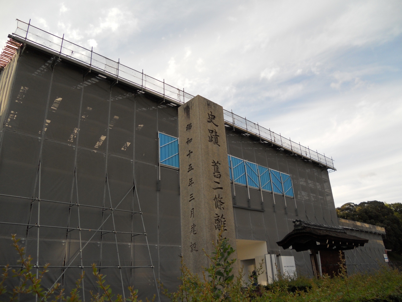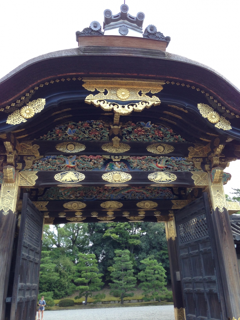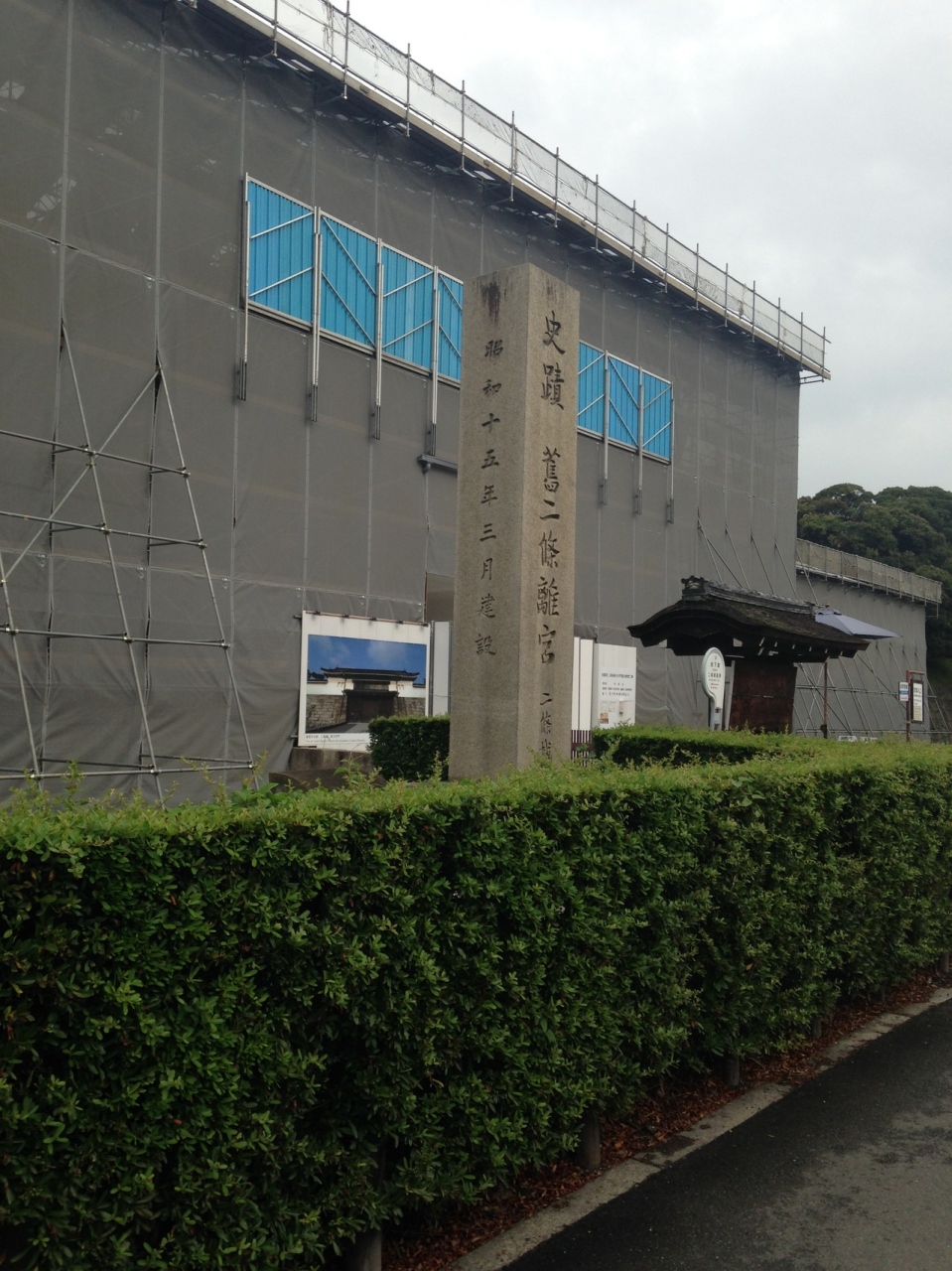徳川家康が上洛時の宿舎として築城。家康と秀頼の二条城会見、慶喜の大政奉還の発表が行われた。二の丸御殿は、武家風書院造の代表的な建築で、各部屋の襖絵は狩野派の作品。廊下は鶯張りといわれ、各所に施された欄間彫刻、飾金具などの装飾が華麗な桃山文化を伝える。二の丸庭園は豪壮な石組みの書院造庭園。本丸御殿は明治中期に京都御所の旧桂宮御殿を移した公家風の瀟洒な建物で、本丸庭園は、芝庭風築山式庭園になっている。