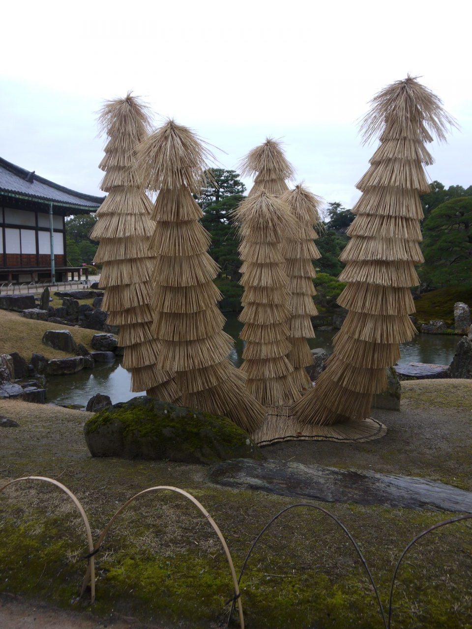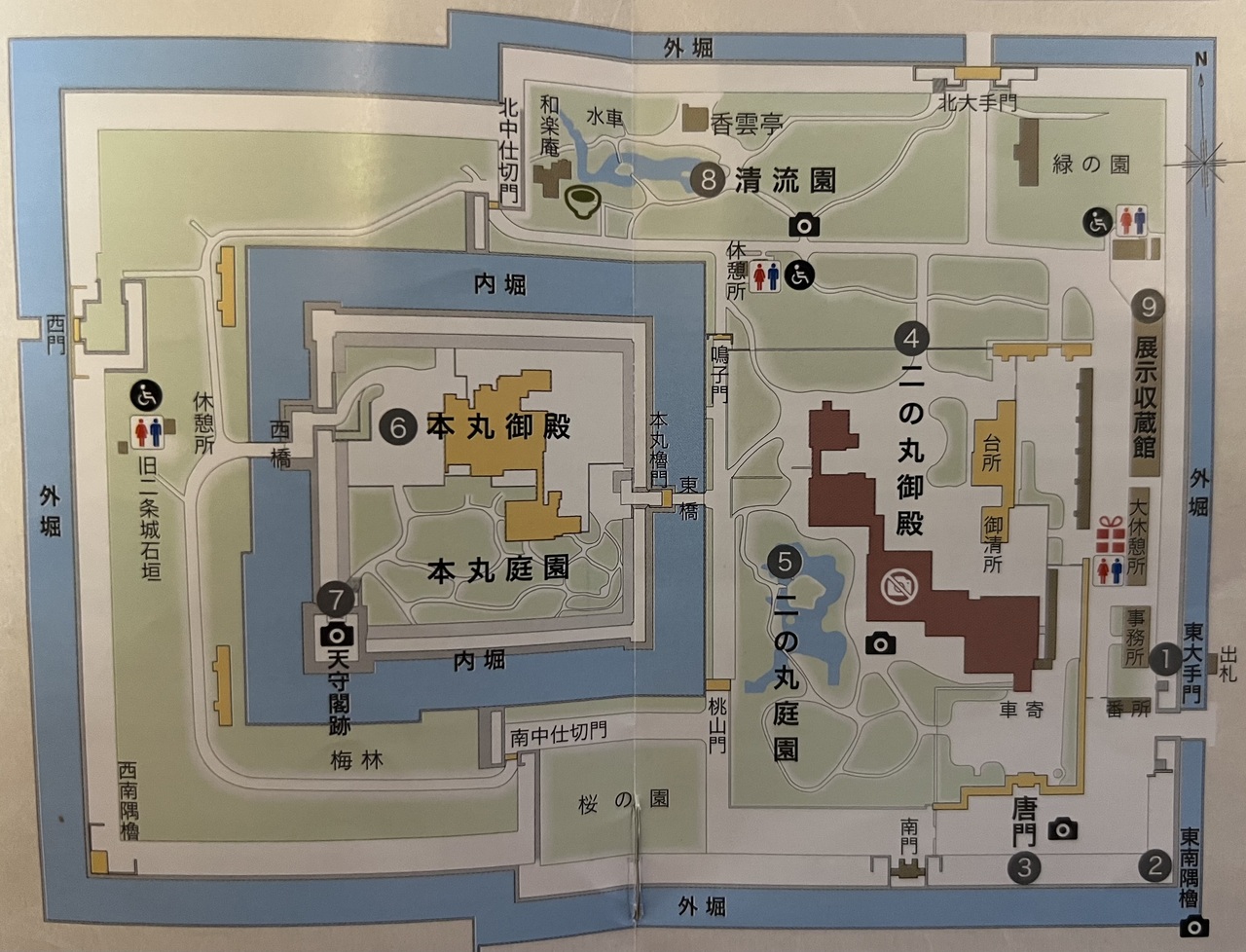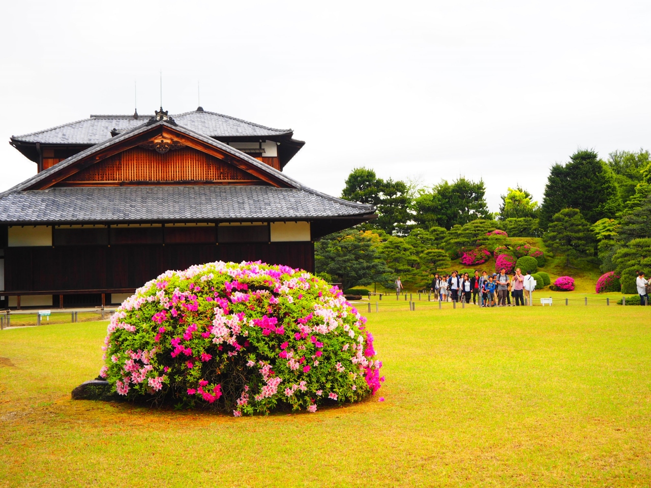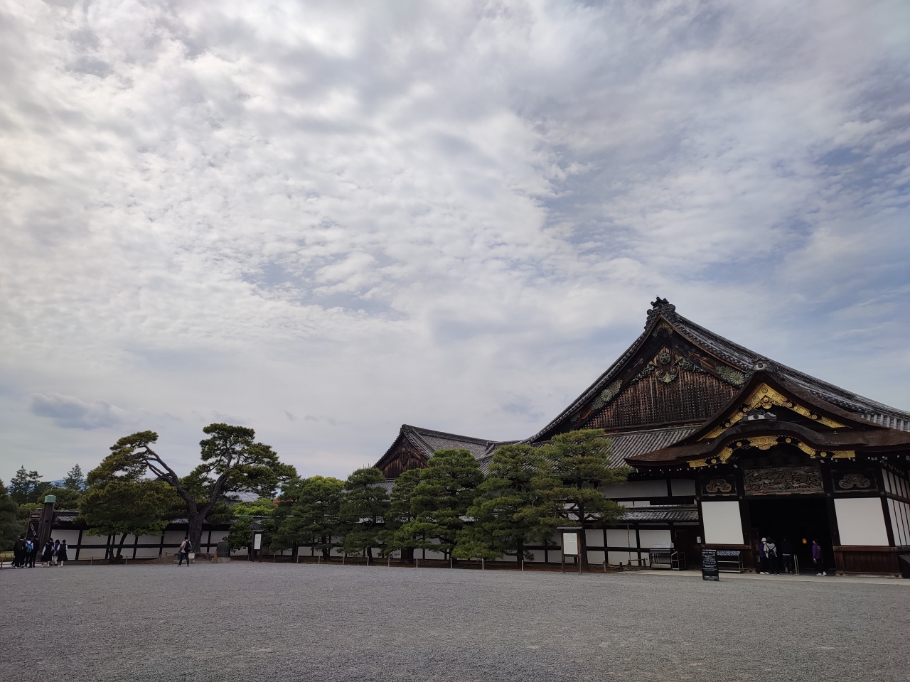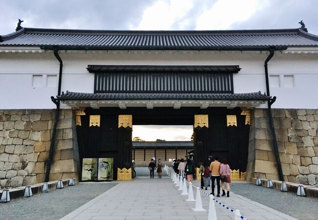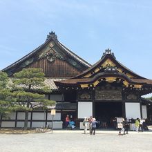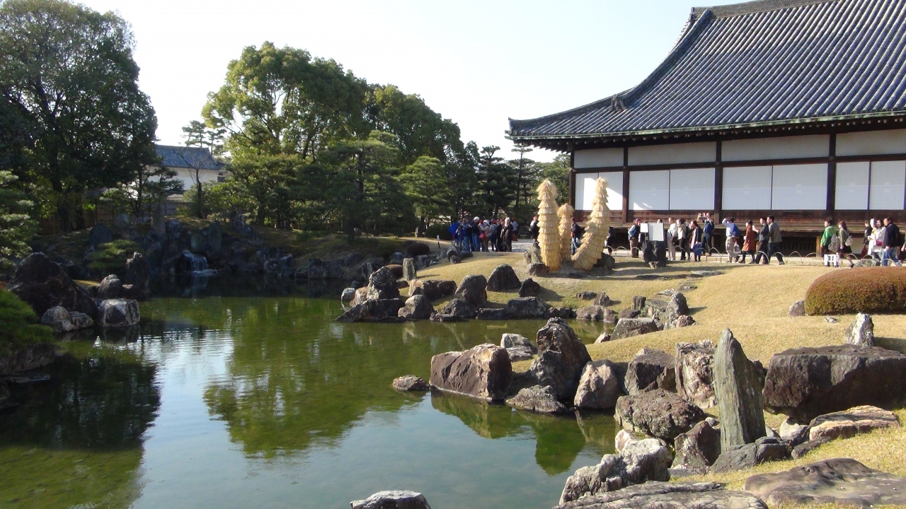 徳川家康が上洛時の宿舎として築城。家康と秀頼の二条城会見、慶喜の大政奉還の発表が行われた。二の丸御殿は、武家風書院造の代表的な建築で、各部屋の襖絵は狩野派の作品。廊下は鶯張りといわれ、各所に施された欄間彫刻、飾金具などの装飾が華麗な桃山文化を伝える。二の丸庭園は豪壮な石組みの書院造庭園。本丸御殿は明治中期に京都御所の旧桂宮御殿を移した公家風の瀟洒な建物で、本丸庭園は、芝庭風築山式庭園になっている。
