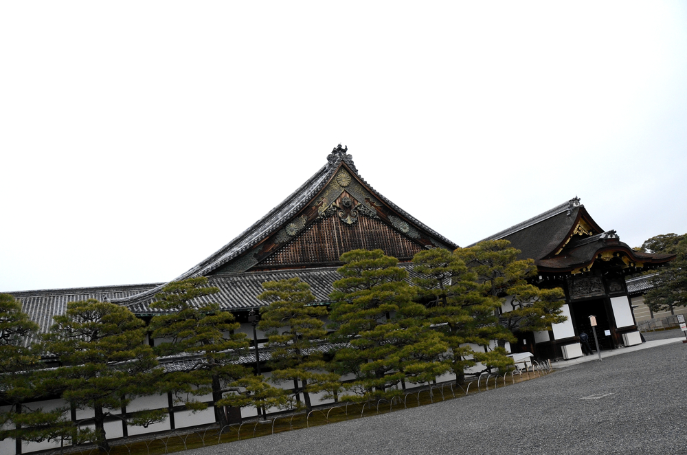 徳川家康が上洛時の宿舎として築城。家康と秀頼の二条城会見、慶喜の大政奉還の発表が行われた。二の丸御殿は、武家風書院造の代表的な建築で、各部屋の襖絵は狩野派の作品。廊下は鶯張りといわれ、各所に施された欄間彫刻、飾金具などの装飾が華麗な桃山文化を伝える。二の丸庭園は豪壮な石組みの書院造庭園。本丸御殿は明治中期に京都御所の旧桂宮御殿を移した公家風の瀟洒な建物で、本丸庭園は、芝庭風築山式庭園になっている。