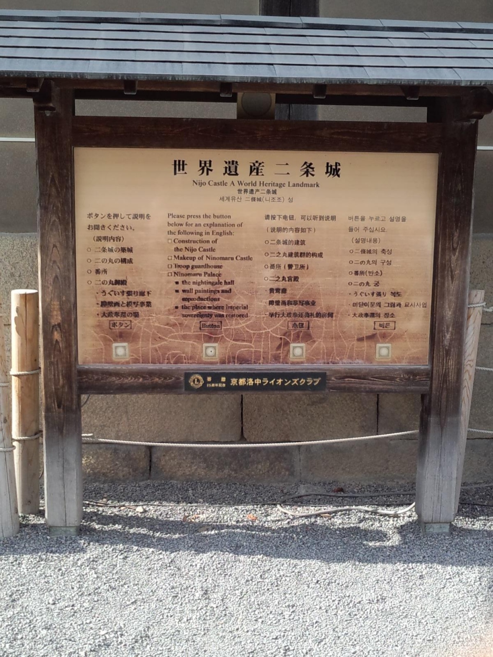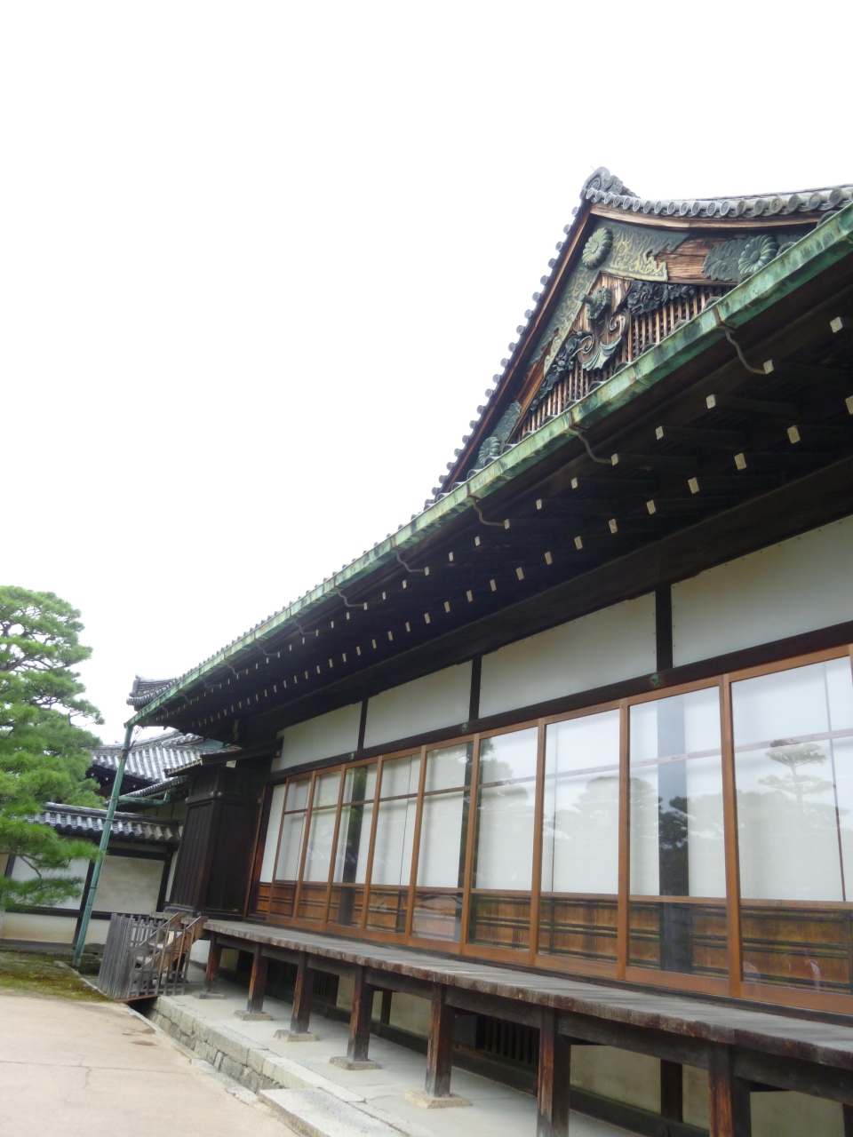 徳川家康が上洛時の宿舎として築城。家康と秀頼の二条城会見、慶喜の大政奉還の発表が行われた。二の丸御殿は、武家風書院造の代表的な建築で、各部屋の襖絵は狩野派の作品。廊下は鶯張りといわれ、各所に施された欄間彫刻、飾金具などの装飾が華麗な桃山文化を伝える。二の丸庭園は豪壮な石組みの書院造庭園。本丸御殿は明治中期に京都御所の旧桂宮御殿を移した公家風の瀟洒な建物で、本丸庭園は、芝庭風築山式庭園になっている。