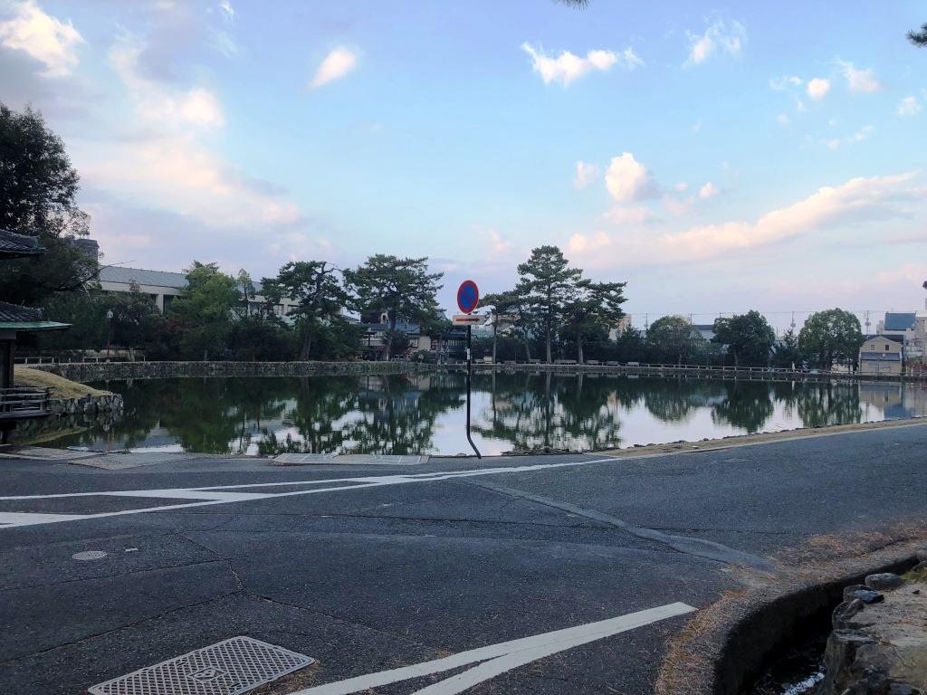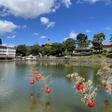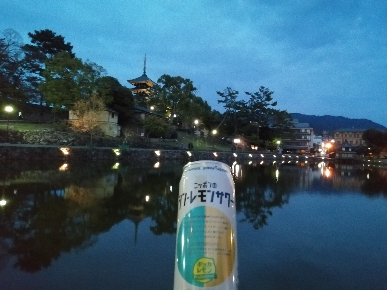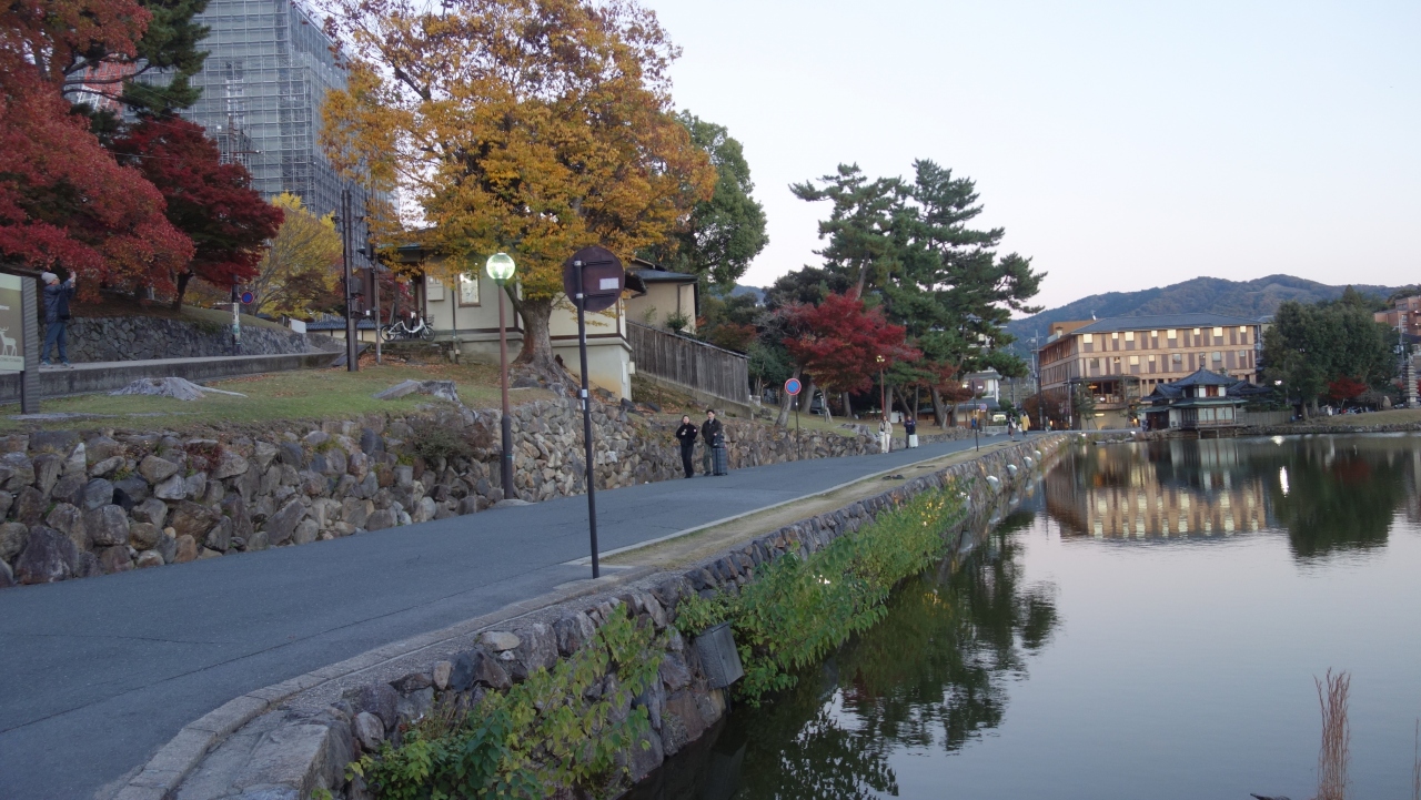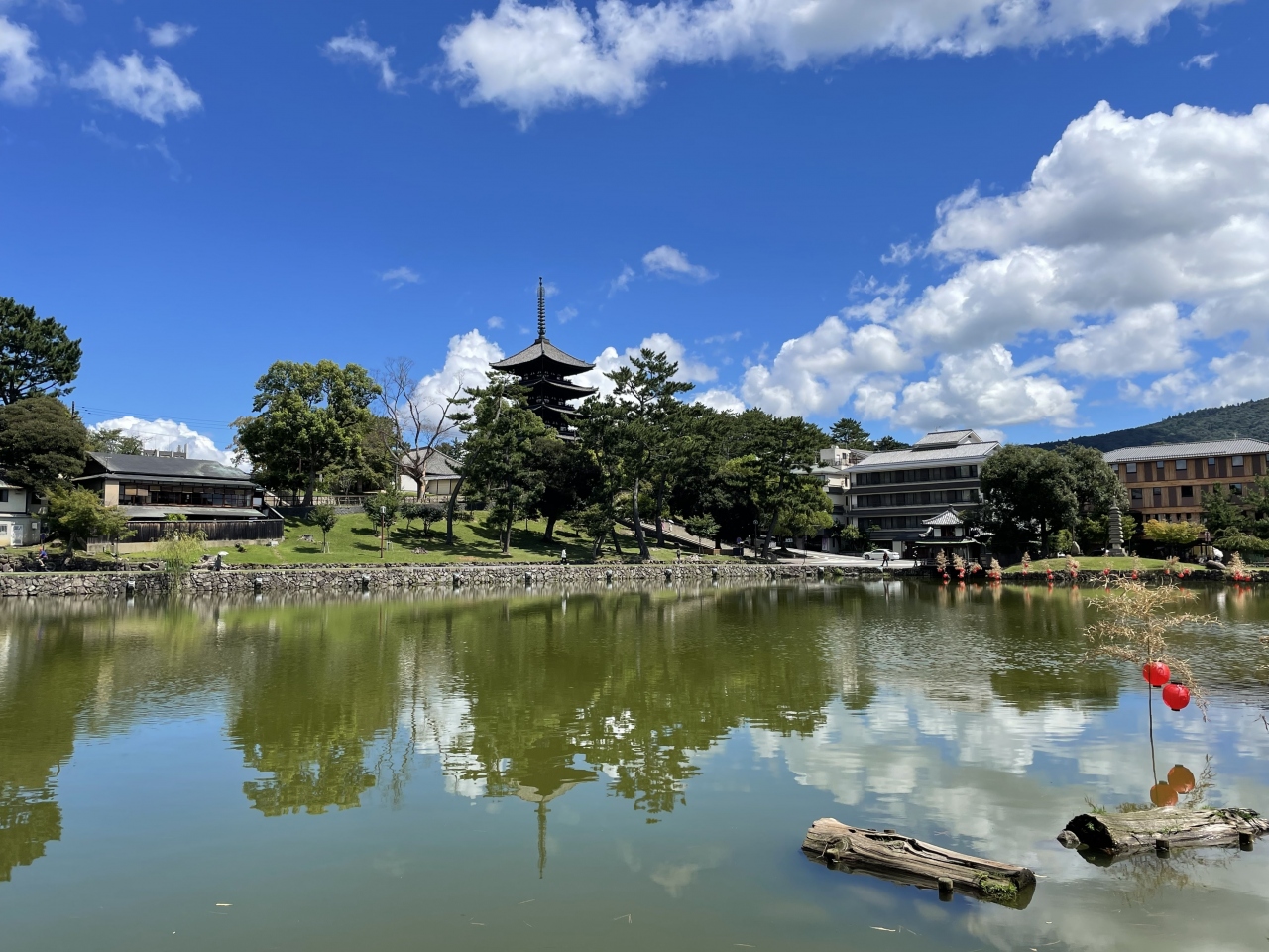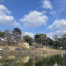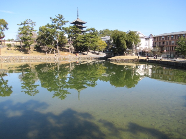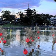 現在、修理中ですが、ライトアップされた興福寺の五重塔が池に写る風景は奈良八景の一つだそうです。