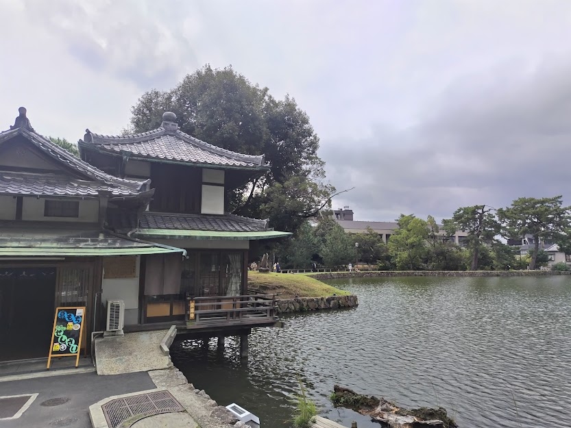 「猿沢池」は、「興福寺」の「放生池」だったもので、奈良公園にある周囲360メートルの小さな池です。もともと「猿沢池」は、「興福寺」の瓦の材料として粘土が採られた場所が池となったものです。「猿沢池」の外周は、一周を歩けるようになっており南西にはベンチなどが設置されています。現在、修理保存中の「興福寺」の「五重塔」が周囲の柳と一緒に水面に映る風景はとても美しく、奈良八景のひとつになっています。また、甲羅干しをする亀でも知られています。そして、奈良時代に、帝の寵愛が衰えたことに悲嘆した釆女が身投げをしたとの言い伝えもあり、池畔には祭神を釆女とする「釆女神社」、「悲恋の采女と衣掛柳の伝説碑」、「きぬかけ柳の碑」などがあります。ちなみに「采女」とは、昔、朝廷に仕え主に天皇の食膳の奉仕をした下級の女官のことです。毎年中秋の名月に「采女祭」が行われています。「采女祭」は、平装束をまとった行列が「三条通り」や商店街の通りを巡ったのち、「猿沢池」に管絃船が浮かべられるそうです。また、「きぬかけ柳の碑」は、采女が入水する際にその衣をかけたのがきぬかけ柳の石碑だそうです。その他、「猿沢池」から「興福寺」の「五重塔」へ通じる「五十二段」の階段の下には、采女のはかなさを詠んだ「会津八一歌碑」もあります。歌碑には、「わぎもこが きぬかけやなぎ みまくほり いけをめぐりぬ かささしながら」と刻まれていました。その意味は、「采女が愛を失って入水する前に掛けたと伝えられている衣掛柳を見たいと思って猿沢の池をめぐり歩いた。折からの雨に傘をさしながら。」ということだそうです。「猿沢池」の南東側には、トイレとデッキを越えた先には、コンビニもあります。「西側」の「釆女神社」の隣には「スターバックス奈良猿沢池店」もありました。しかし、私が一番気になったのは、うどん屋の「衣掛茶屋」です。古風というか古民家風の風情ある建物で、「猿沢池」に古の建物が建っているような感じさえしました。