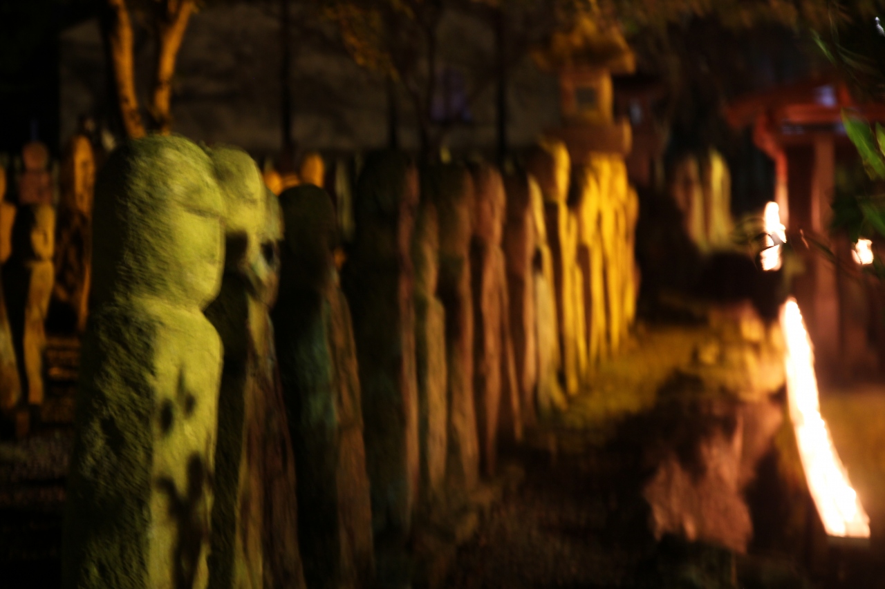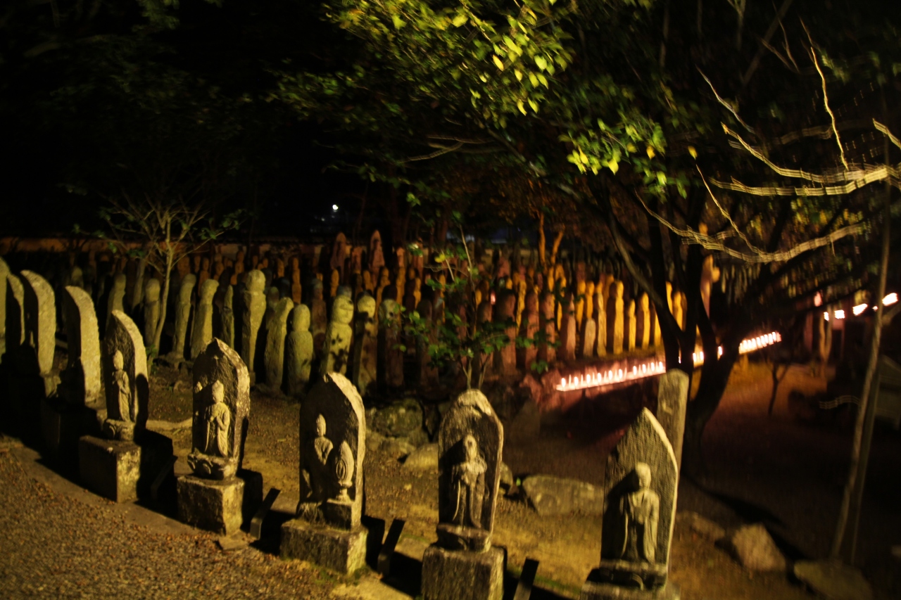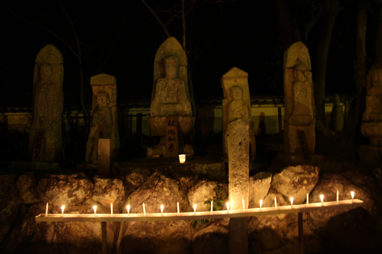 大晦日の深夜23時から年明けの2時までは、点灯会(てんとうえ)が行われ、羅漢さんの周囲に並べられた無数のろうそくの灯が、淡く羅漢さんたちを照らします。この日は、参拝者ひとりひとりにろうそくと願い事を書く紙カップが渡されます。また、寒い深夜に昆布茶の接待もあり、この暖かいお茶で見も心も温まります。