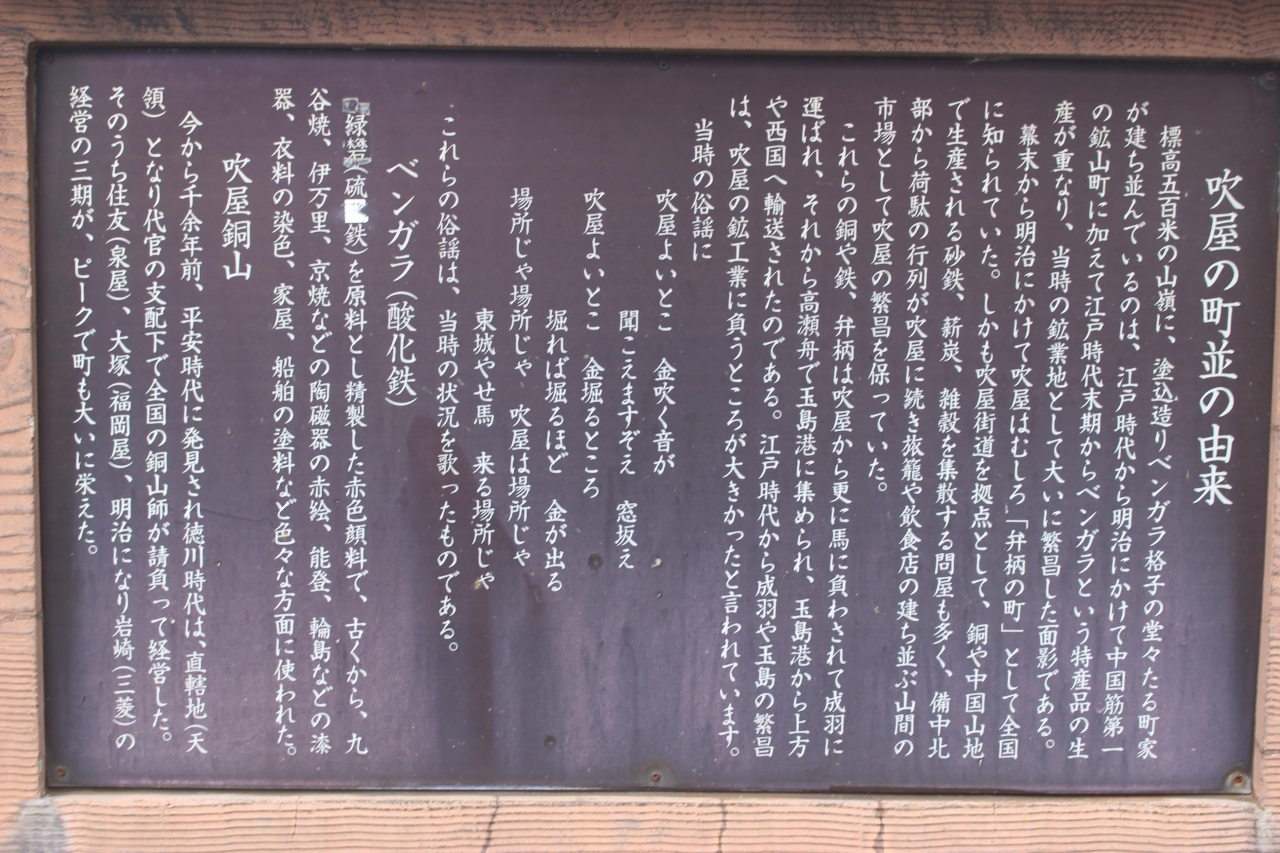 標高550mの山合いに、塗込造りベンガラ格子の堂々とした町家が建ち並んでいるこの町は、江戸時代から明治にかけて、中国筋第一の銅山町に加えて江戸末期からベンガラという特産品の生産が重なり、商業地として大いに栄えた面影を色濃く残している。 県の「ふるさと村」にも指定されている。 町並みは国選定「伝統的建造物群保存地区」となっている。