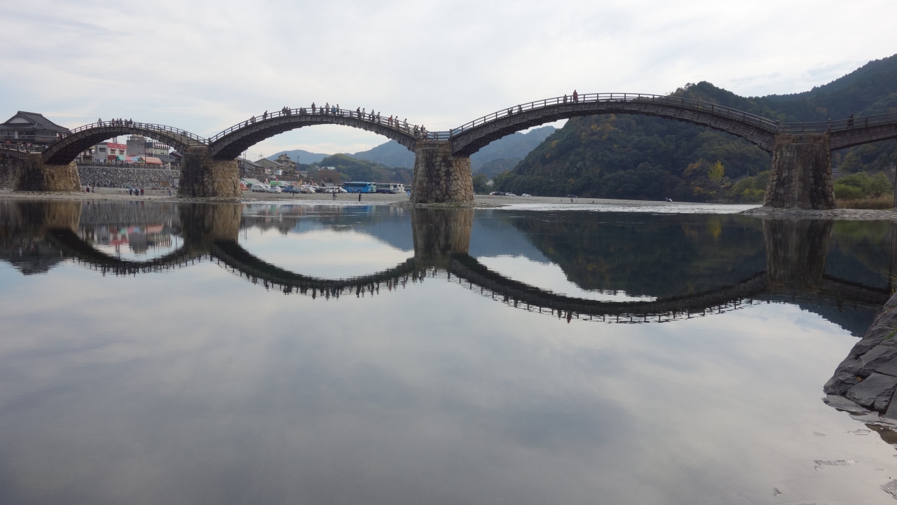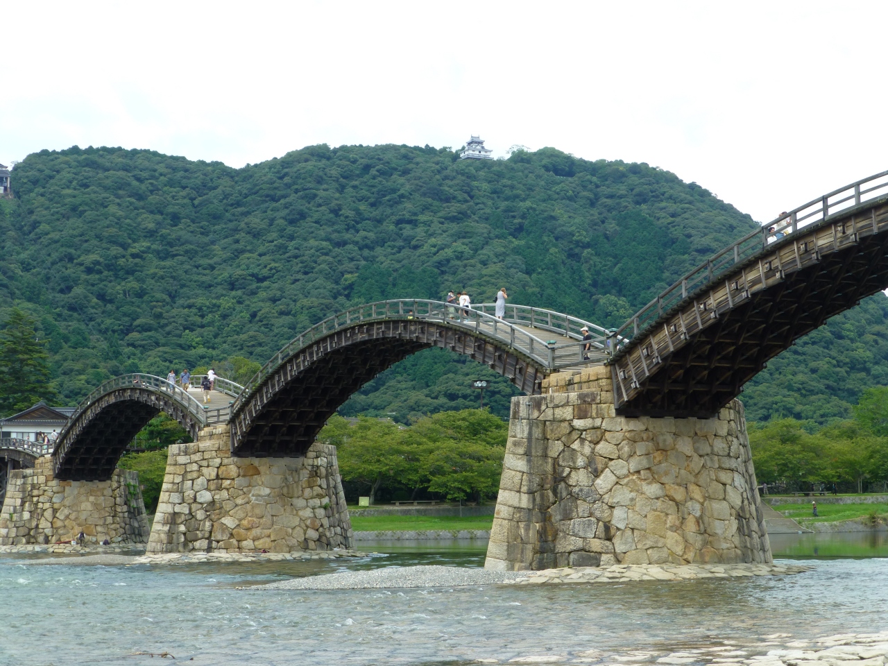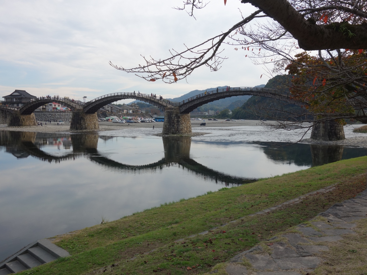 JR岩国駅前から出ているいわくにバスで錦帯橋へ。15分ほどで錦帯橋近くのバス停に到着、川の岸辺にある遊歩道から斜め前方に見...  続きを読むえる錦帯橋は圧巻。実際に橋を歩いてみると、斜めから見えた錦帯橋の景色とは全く違って見える。五連のアーチの角度がきつい部分は、滑り止めのため緩やかな階段状になっている。橋の上から見える錦川の表情も素晴らしい。シラサギが川面の小魚を待ち構えている。橋上からは、ロープウェイや岩国城が見える景色も素晴らしい。   閉じる
