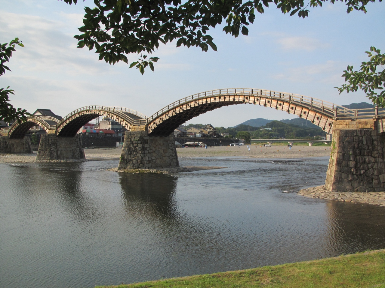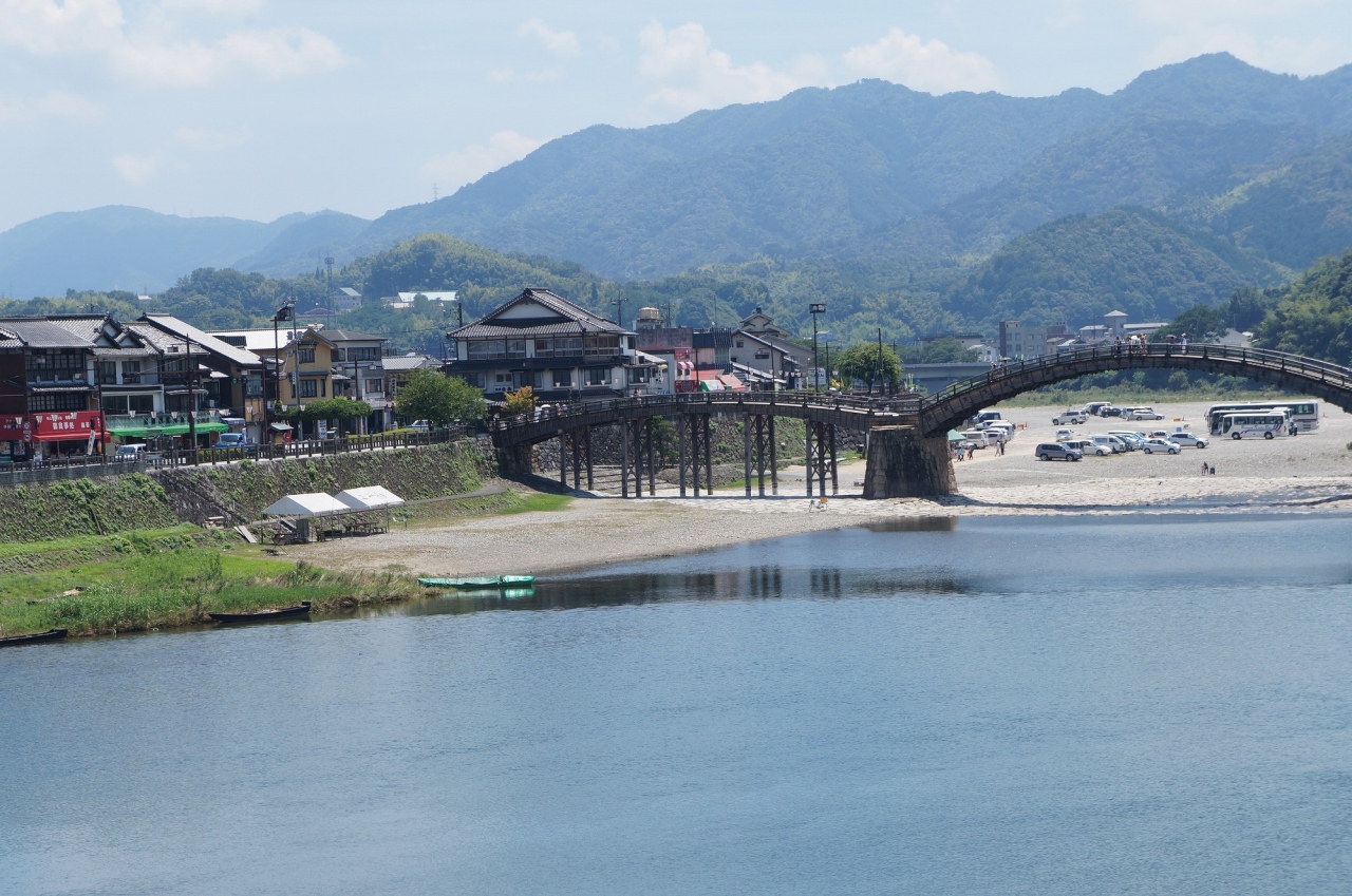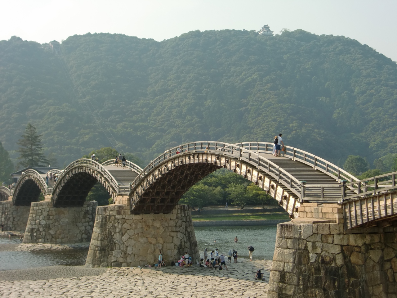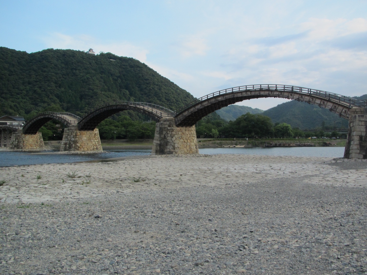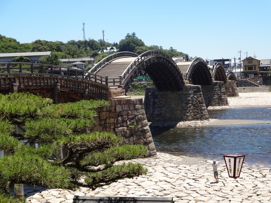 JR岩国駅前から出ているいわくにバスで錦帯橋へ。15分ほどで錦帯橋近くのバス停に到着、川の岸辺にある遊歩道から斜め前方に見...  続きを読むえる錦帯橋は圧巻。実際に橋を歩いてみると、斜めから見えた錦帯橋の景色とは全く違って見える。五連のアーチの角度がきつい部分は、滑り止めのため緩やかな階段状になっている。橋の上から見える錦川の表情も素晴らしい。シラサギが川面の小魚を待ち構えている。橋上からは、ロープウェイや岩国城が見える景色も素晴らしい。   閉じる