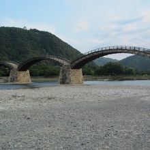 川幅約200mの錦川にかかる5連の木造橋で、中央の3連がアーチ橋となっている。