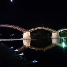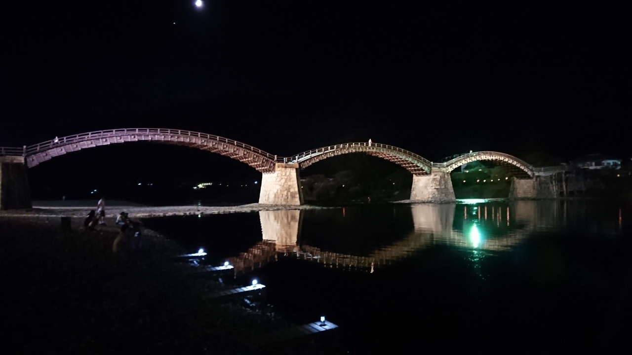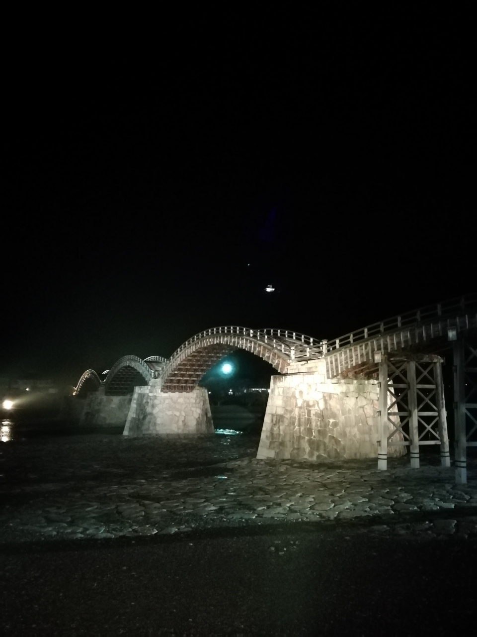 山口県の県境、錦川に架かる橋です。五つのアーチからなる橋で通称「五橋」と呼ばれているようで、地酒の五橋もここから取られたと...  続きを読むの事。観光スポットですから日中は通行料を取られますが夜間は無料?で渡れます。後で気づきましたが夜間料金を入れる箱が用意されてました。入れている人は誰もいませんでしたが。ライトアップもされており、遠くに見える岩国城がまた、なんとも云えない景色です、是非。  閉じる