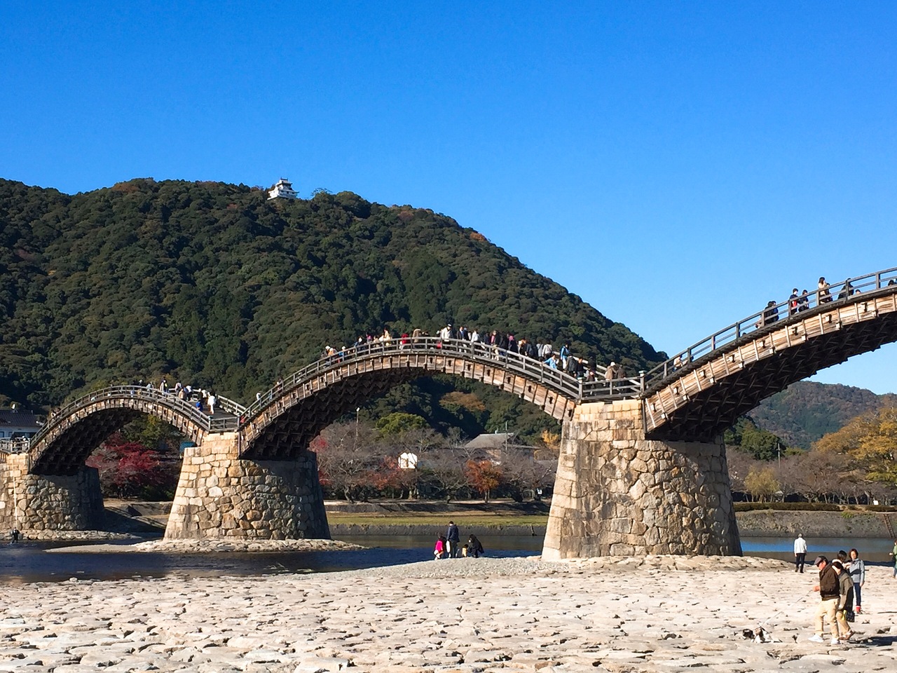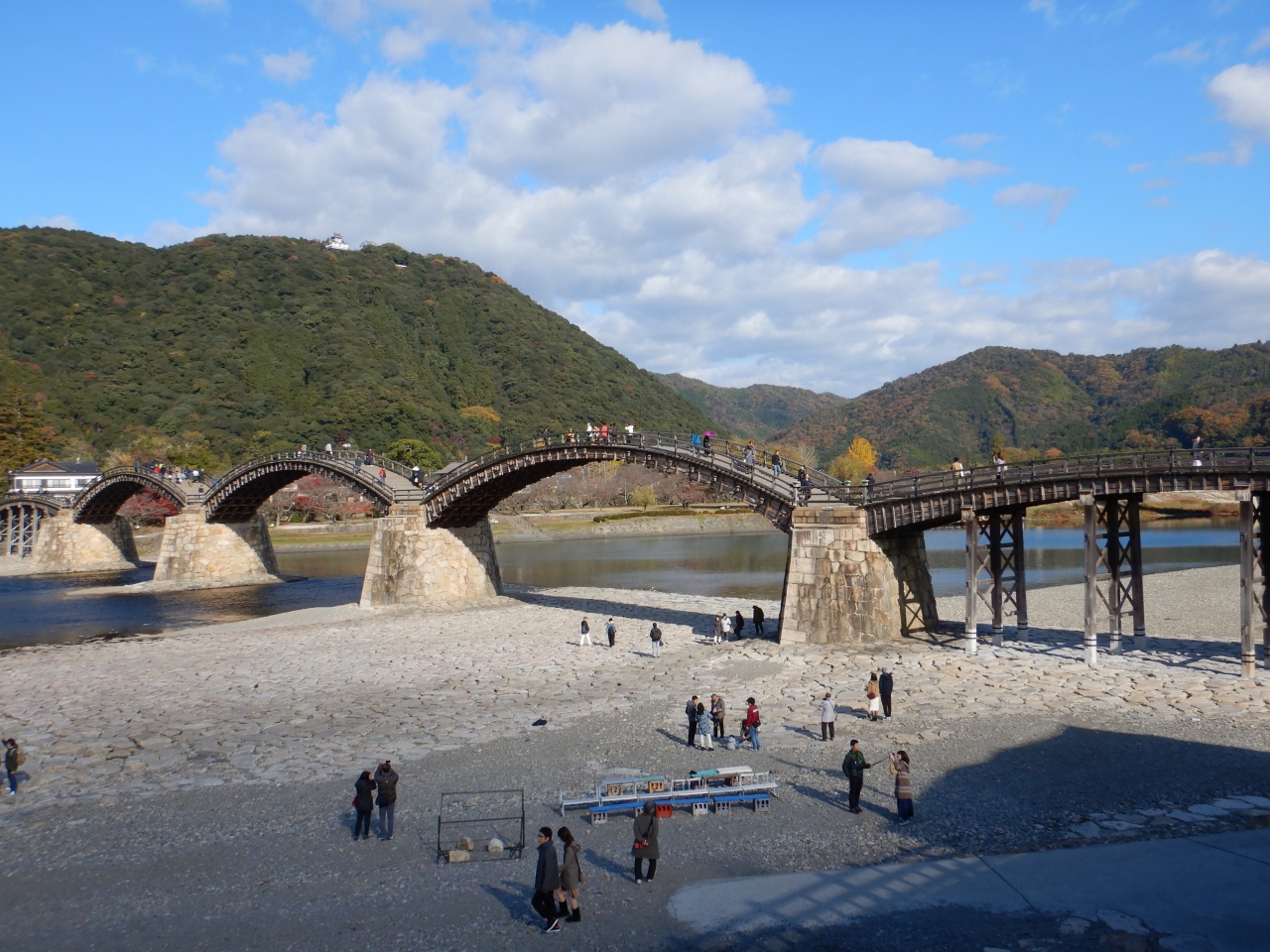 JR岩国駅前から出ているいわくにバスで錦帯橋へ。15分ほどで錦帯橋近くのバス停に到着、川の岸辺にある遊歩道から斜め前方に見...  続きを読むえる錦帯橋は圧巻。実際に橋を歩いてみると、斜めから見えた錦帯橋の景色とは全く違って見える。五連のアーチの角度がきつい部分は、滑り止めのため緩やかな階段状になっている。橋の上から見える錦川の表情も素晴らしい。シラサギが川面の小魚を待ち構えている。橋上からは、ロープウェイや岩国城が見える景色も素晴らしい。   閉じる
