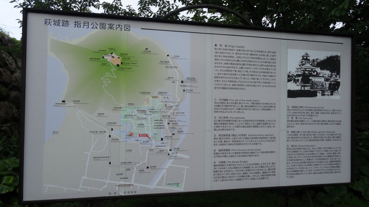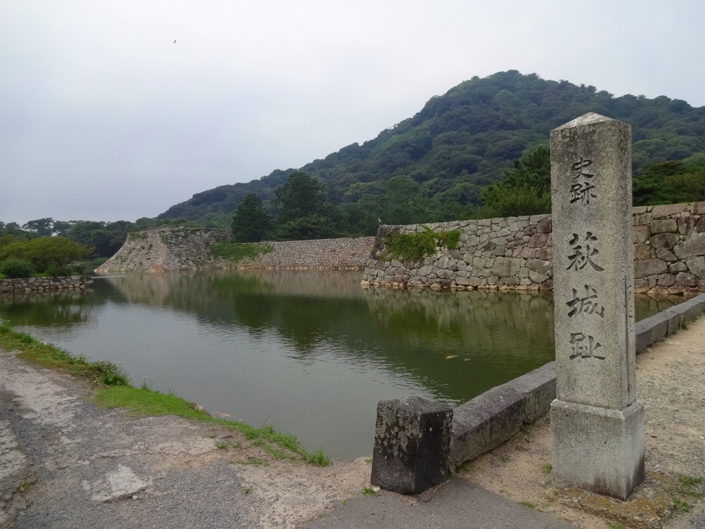 天守閣等の建物はすべて残っていませんが、石垣や堀が残っており、本丸跡が指月公園として整備されています。また、園内には梨羽家茶室や家老福原家書院、志都岐山神社等がありましたが、全般的に木がうっそうとしげっており、天気が悪い日は、やや怖いです。