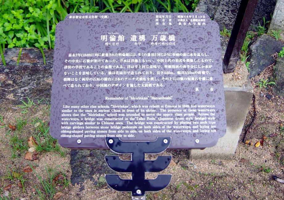 指月公園内の志都岐山神社隣の旧福原家書院横の池に架かっている橋は明倫館に架かっていた万歳橋と言われるアーチ状の橋です。