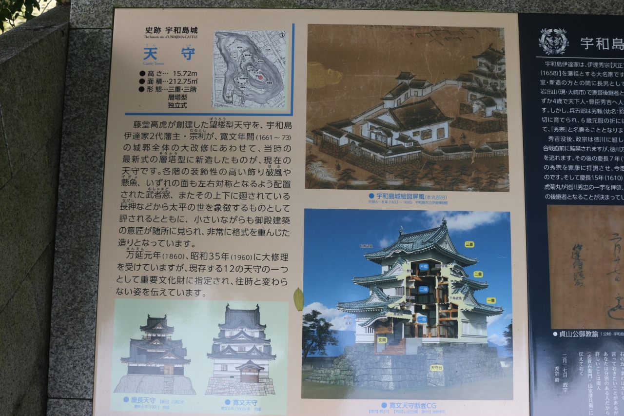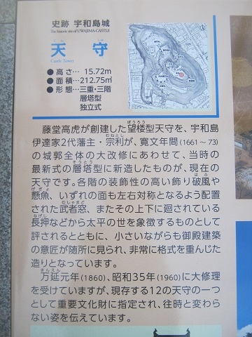 宇和島観光のハイライトといえば、やはりこちらの宇和島城かなと思います。江戸時代に築城された現存する十二天守のうちの一つとし... 続きを読むての知名度は抜群だと思いますが、実は江戸時代の最初に、著名な藤堂高虎が築いた天守とは別に、伊達2代藩主によって1660年代に建て替えられていて、現在見られるのはこちらの天守ということになります。