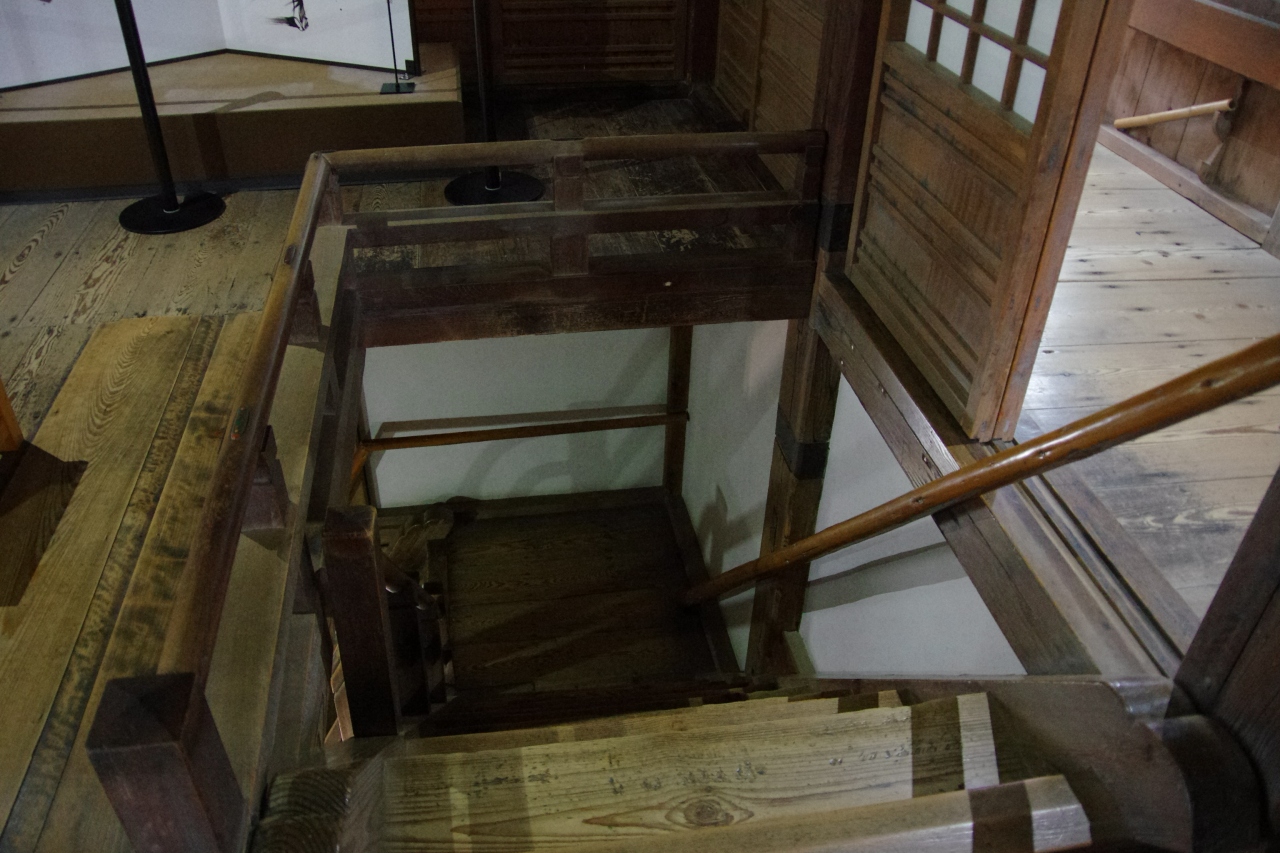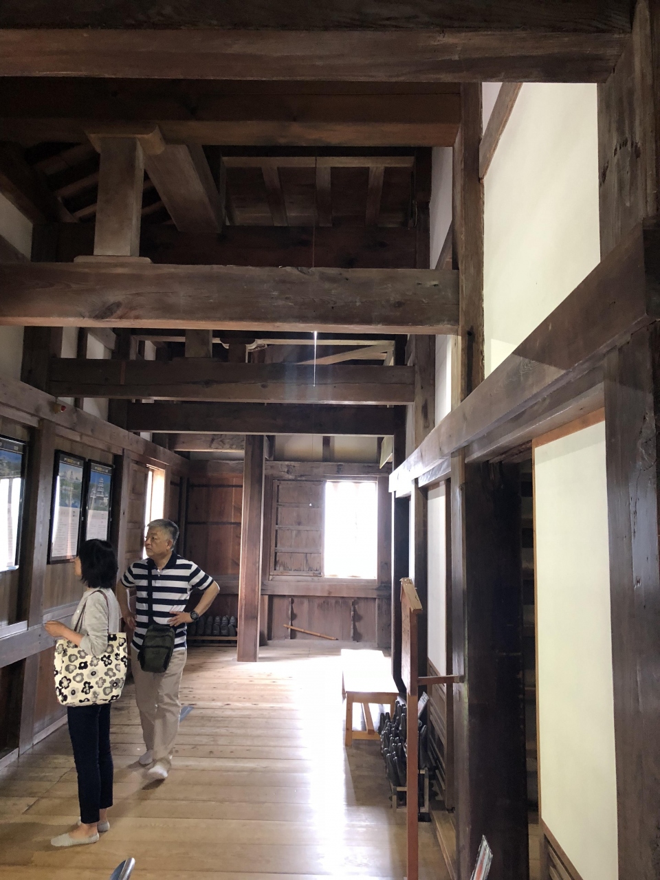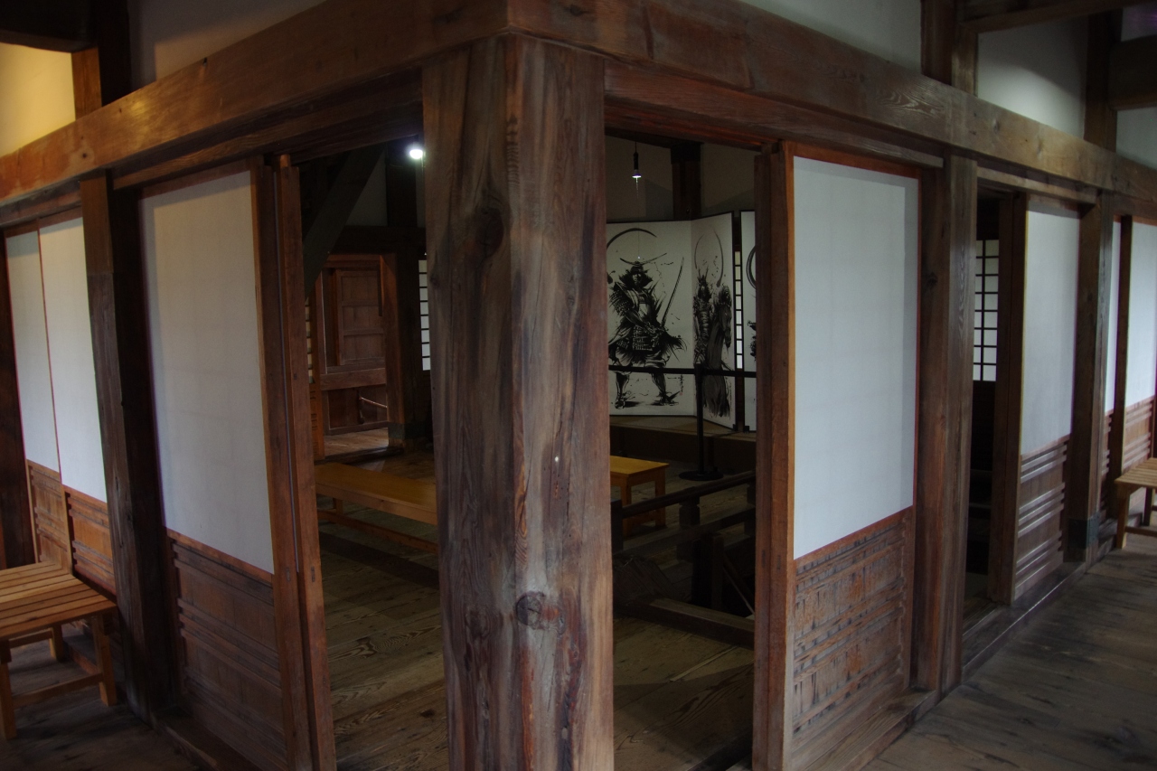 天守自体はかなりこじんまりしていて、外履きも袋で持ち歩き方式(犬山城、姫路城など)や下駄箱に入れる式(松江城、丸亀城)ではなく、入り口にぬぎっぱなし方式。