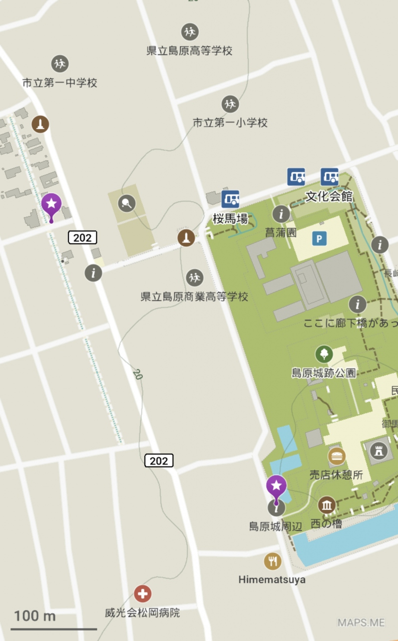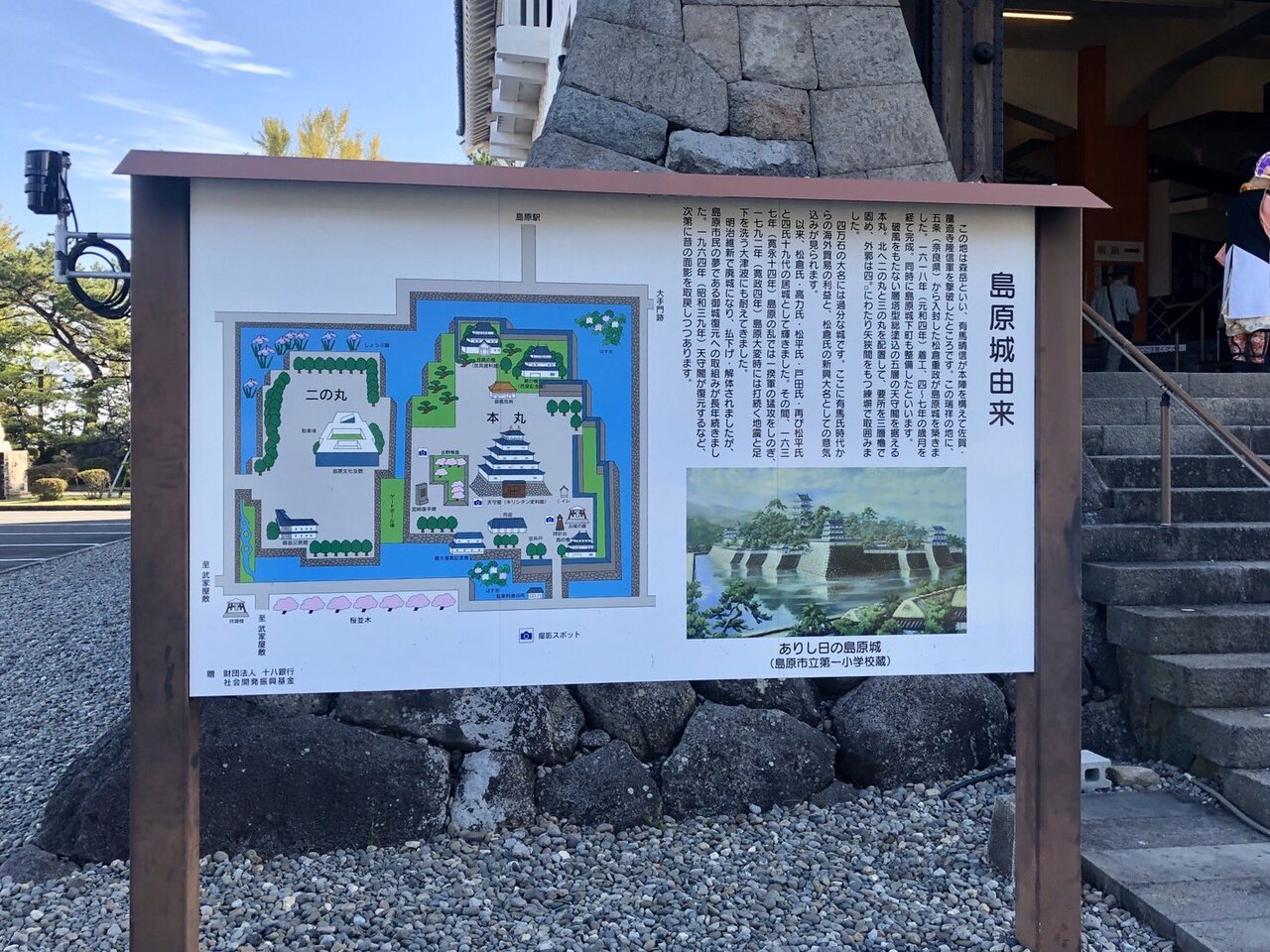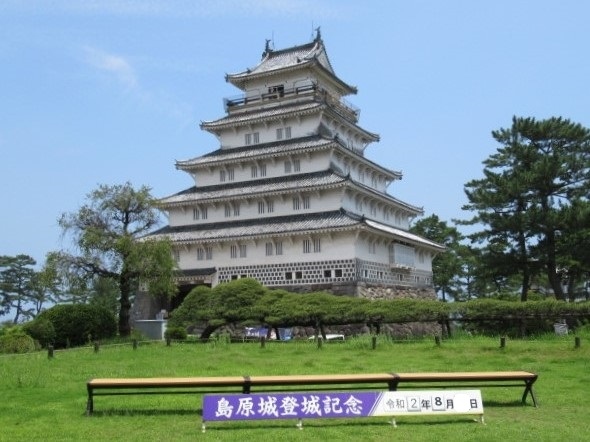通称は森岳城。元和4年(1618)から松倉重政が7年の歳月を費やして島原半島中央部の森岳に築城。子の勝家は島原の乱の責任を問われて所領没収・断罪。以後,高力忠房,松平忠房らが城主となり,松平氏の時代に明治維新を迎えた。昭和39年に,天守閣が復元されたほか,巽の櫓や丑寅の櫓が復元され,それぞれ北村西望記念館や民具資料館になっている。◎松倉重政(1573-1630)江戸初期の大名。家康に仕え,大坂の陣の後は島原領主。領内キリシタンの弾圧は有名。その苛政は島原の乱の因ともなった。平成26年度に、島原城復元50周年を迎えた。