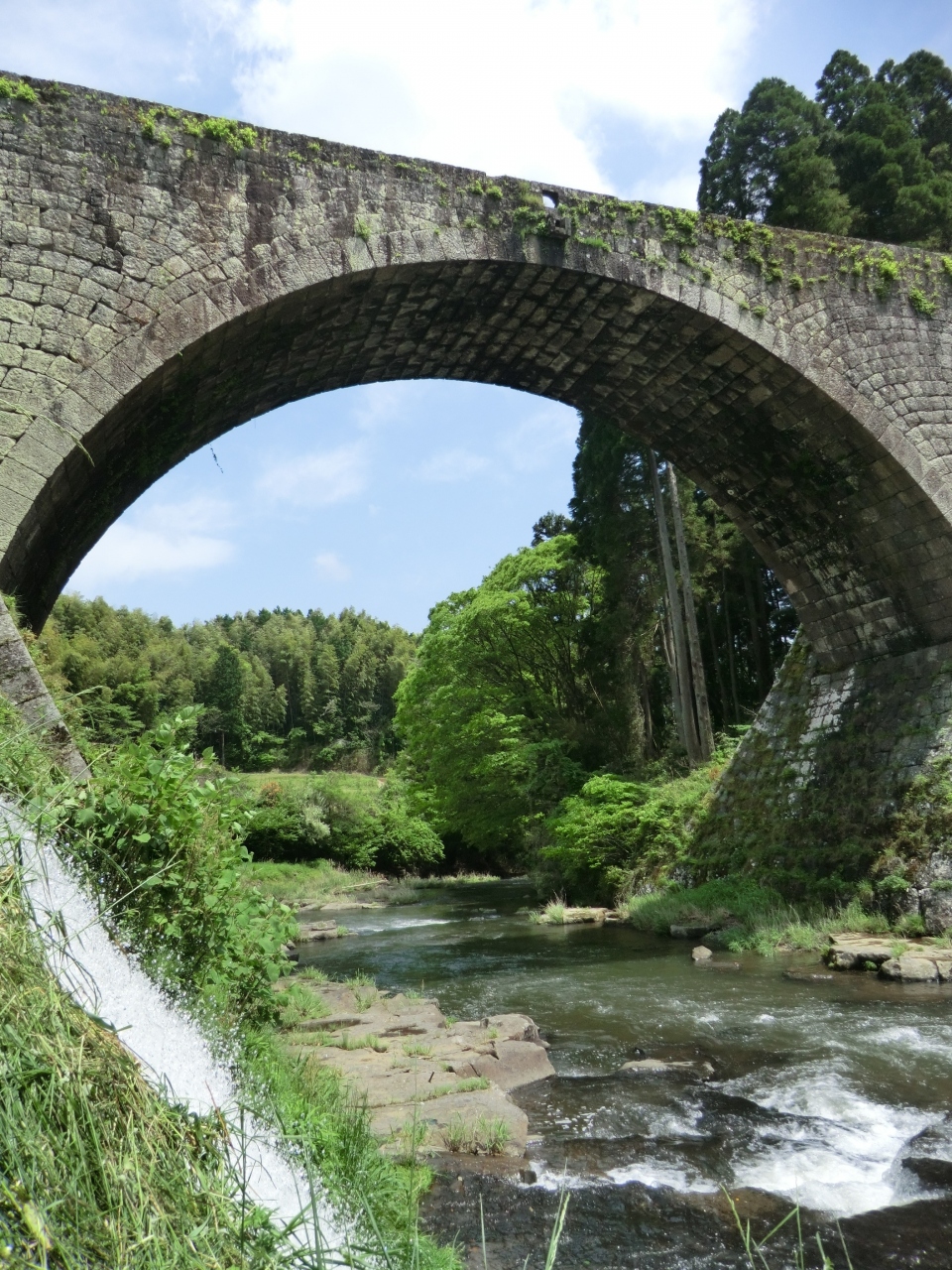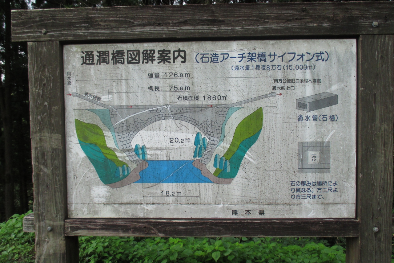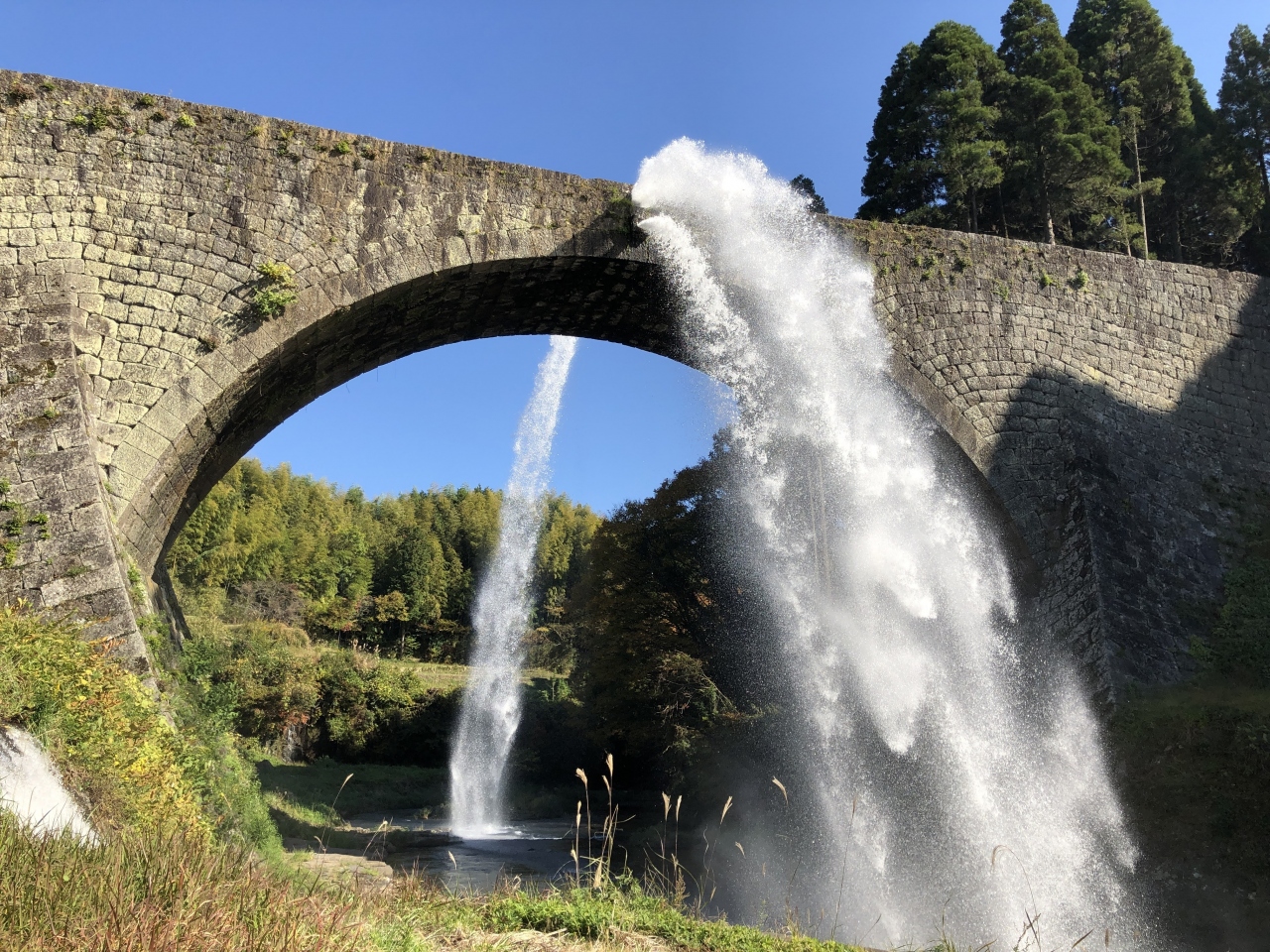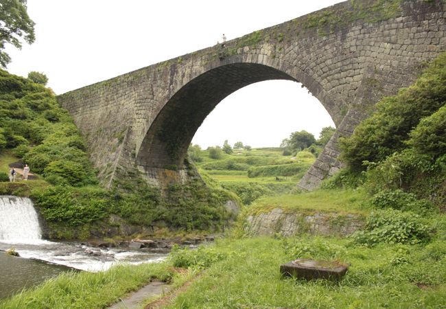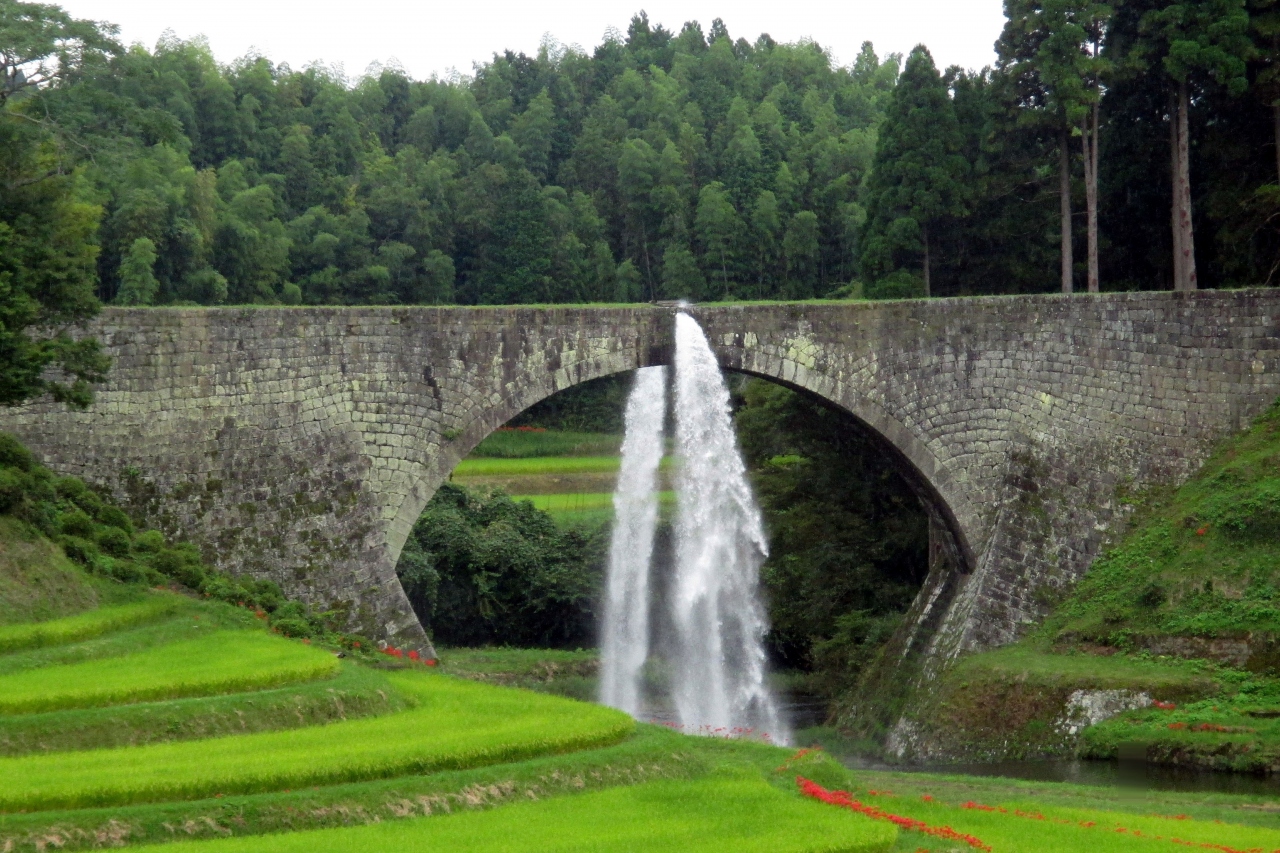 嘉永7年(1854年)、水不足に悩む白糸台地に水を送るため、矢部の惣庄屋布田保之助が全力を傾けて造った日本最大級の石造アーチ水路橋である。種山石工の技術を結集したこの橋は、高さ約20m、橋上の幅6,3m、アーチの水路28,18mで中央には飲用と潅漑用の3本の水道が通っている。水道は一方の高い所に取水口を設け、平坦な橋を通り、その勢いで対岸の高い所に水を吹き上げる逆サイホンの原理を応用、一昼夜で15,000立方mの水を送り、100haの水田を潤す力を備えている。水圧や地震に充分耐え得るような鞘石垣や鎖石の工法を用いた高度な技術力と、均整のとれた美しさが高く評価され、昭和35年には国の重要文化財に指定された。
