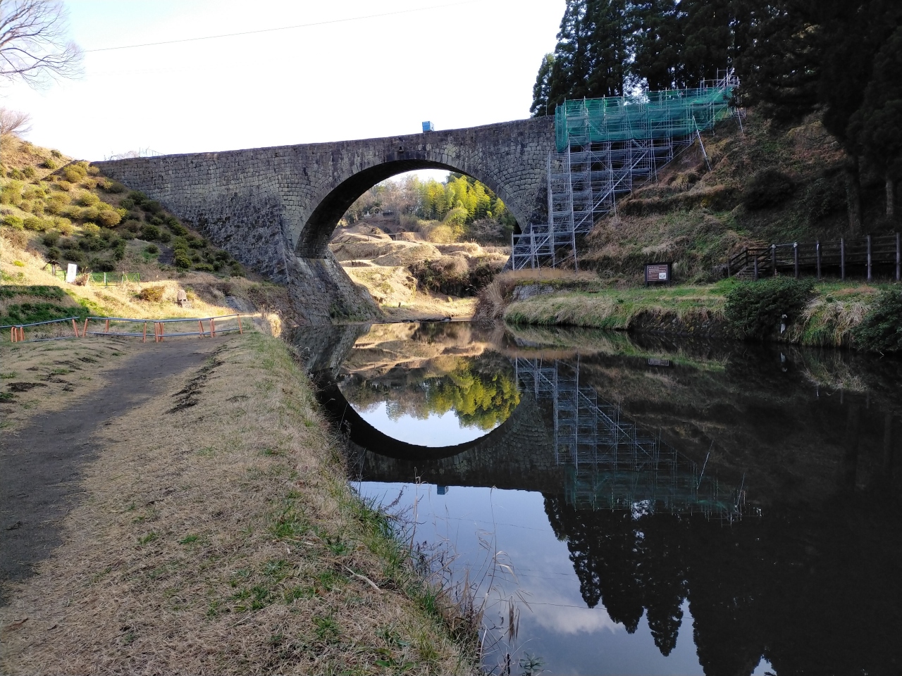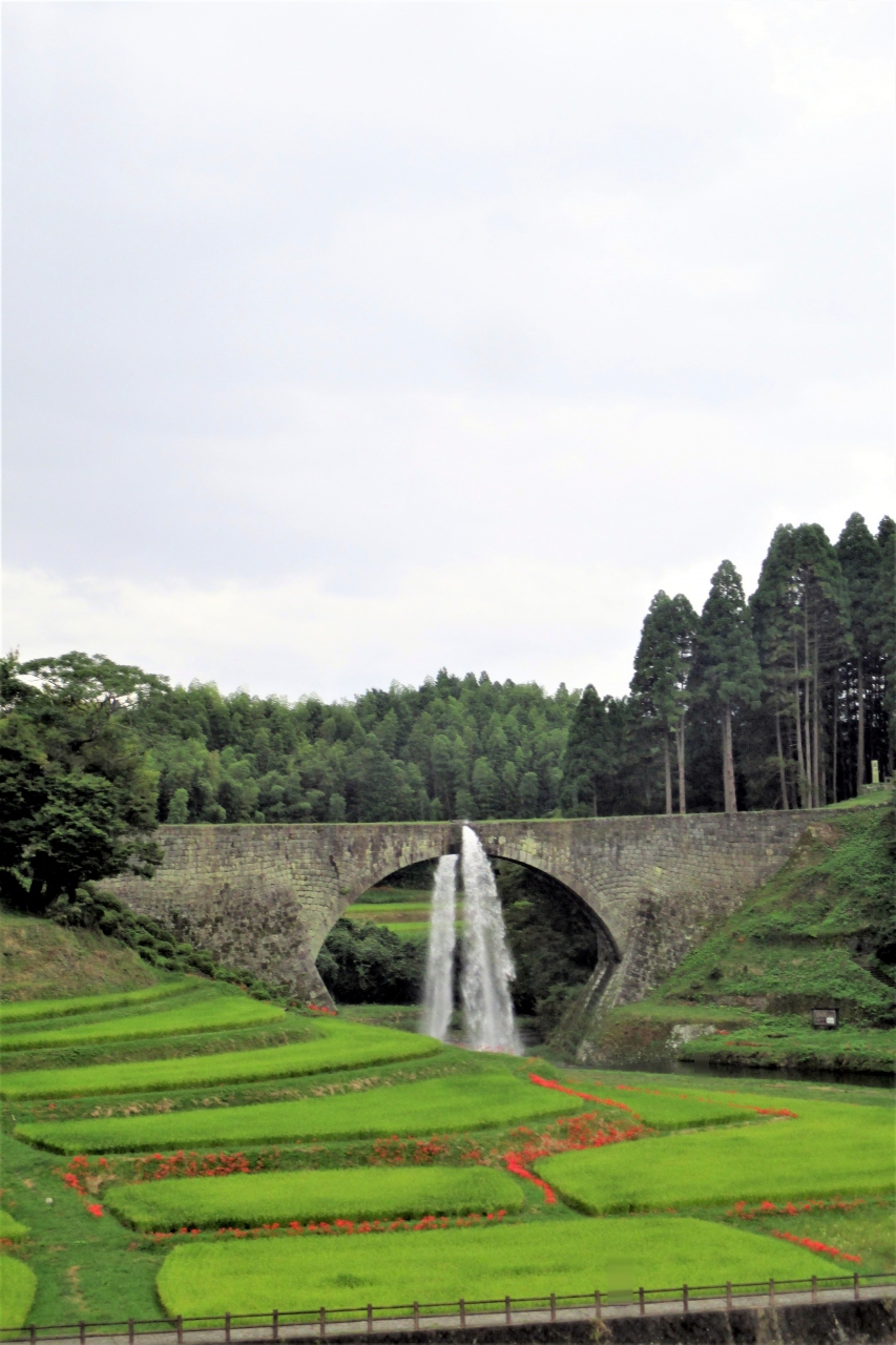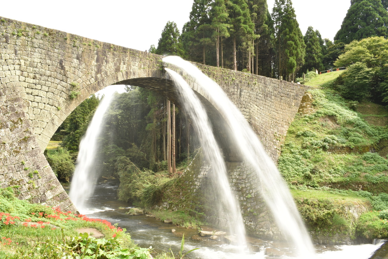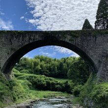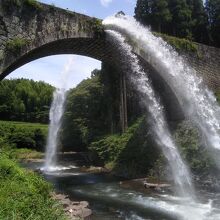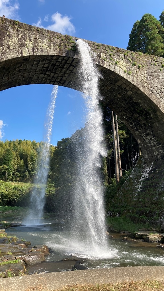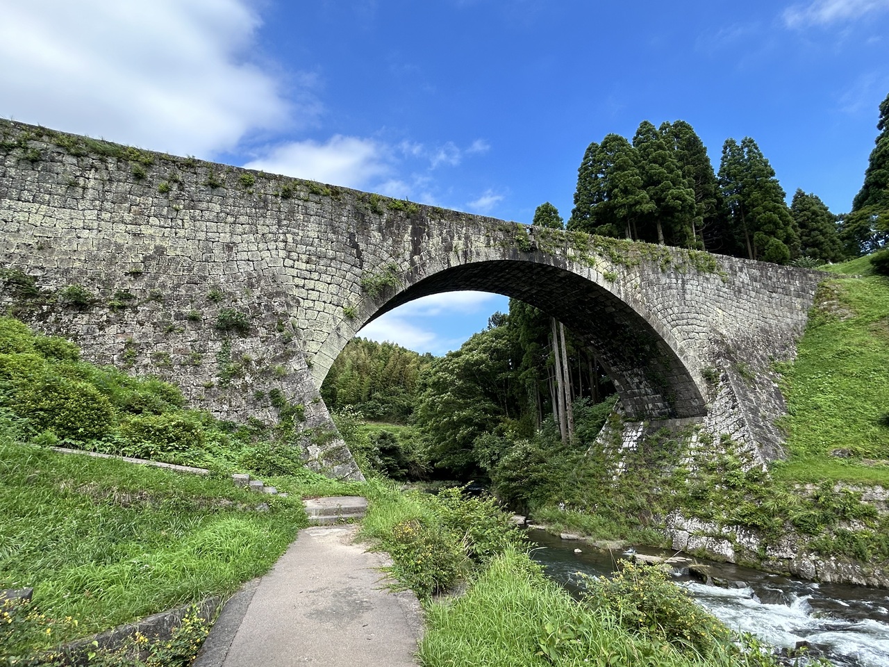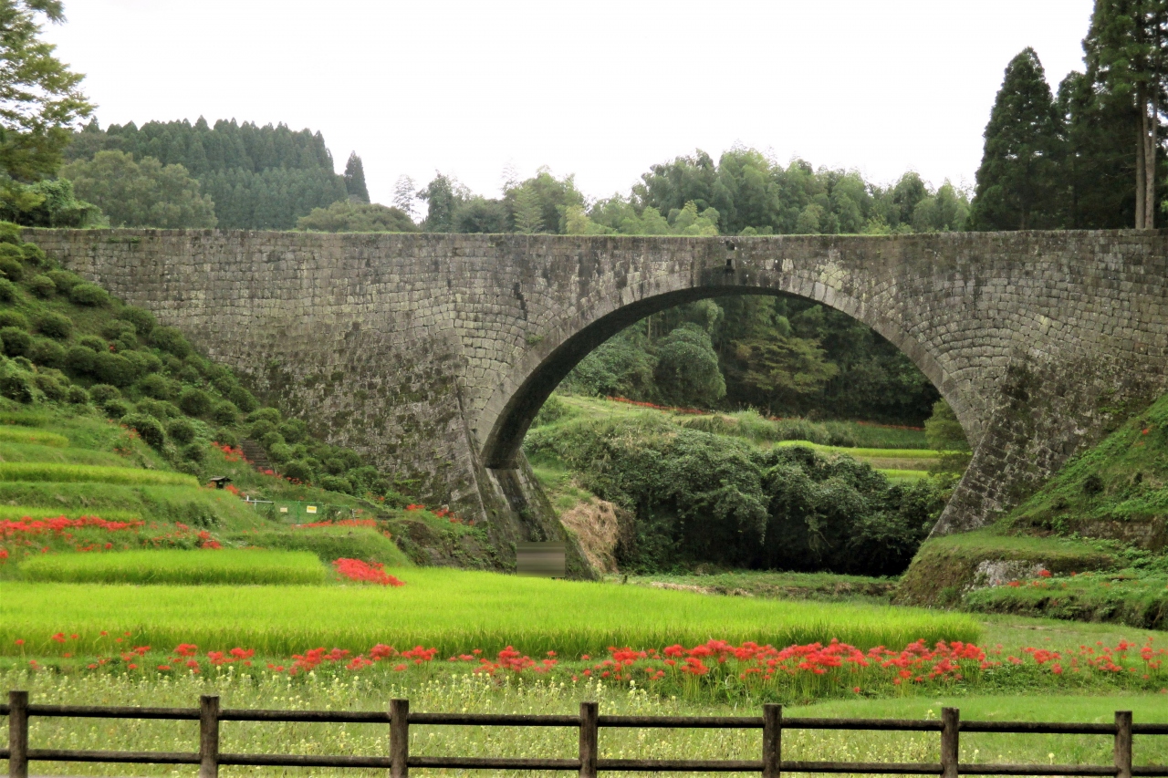 嘉永7年(1854年)、水不足に悩む白糸台地に水を送るため、矢部の惣庄屋布田保之助が全力を傾けて造った日本最大級の石造アーチ水路橋である。種山石工の技術を結集したこの橋は、高さ約20m、橋上の幅6,3m、アーチの水路28,18mで中央には飲用と潅漑用の3本の水道が通っている。水道は一方の高い所に取水口を設け、平坦な橋を通り、その勢いで対岸の高い所に水を吹き上げる逆サイホンの原理を応用、一昼夜で15,000立方mの水を送り、100haの水田を潤す力を備えている。水圧や地震に充分耐え得るような鞘石垣や鎖石の工法を用いた高度な技術力と、均整のとれた美しさが高く評価され、昭和35年には国の重要文化財に指定された。