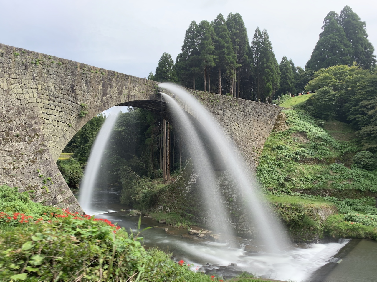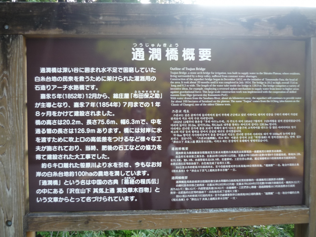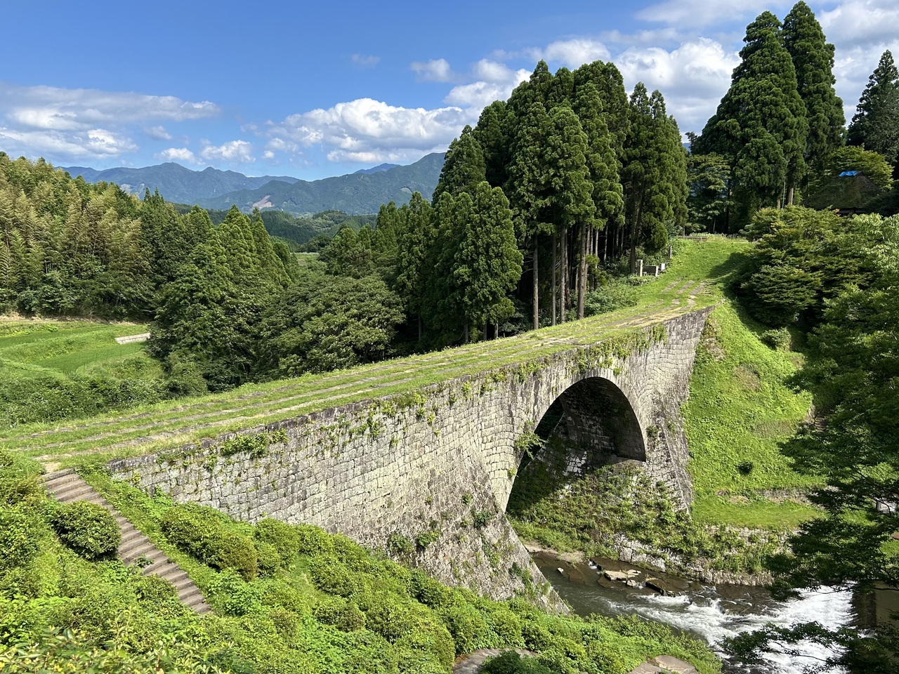 今年国宝になったという事で、高千穂から山鹿温泉に行く道中に寄ってみる事にしましたが、ナビで案内された駐車場から通潤橋が見え... 続きを読むる場所まで行くのはかなりのアップダウンのある道を通って行かなくてはならず、暑い夏場に行くには不適当な場所だと思った。また案内板がほとんど無く本当に着くのかどうか不安なまま歩く事になった。途中、60m級の立派な滝があるが、そこからまだまだ歩かねばならない。やっとこさ橋が見える所に到着したかと思えば、橋の向こうに見える道の駅通潤からの方が美しく見えるばかりでなく、車で行けるので疲れる事もない。現地駐車場でこういう告知をちゃんとして欲しいと思った。 あと、水を放流する際には事前予約で橋の上から眺める事が出来るらしく、我々が着いた駐車場は橋の上に行く為のものであること。通常は道の駅から眺めるので充分なのに時間と体力を無駄にした気がして残念でした。 閉じる