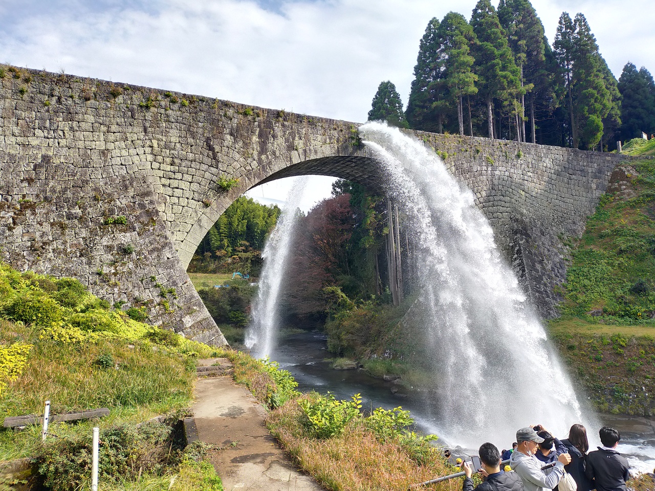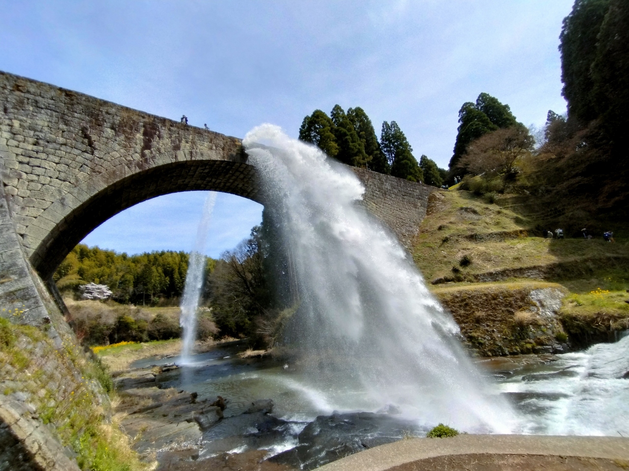 橋の下で待ち構えているところに、放水が始まると風にあおられてというか空気の抵抗を受けてというか。白く煙った太い水の塊りが次々とスローモーションのように落ちてきました。写真とかでは当然見たことはありましたが、その迫力は轟音と合わせて、まったく想像以上のすごさ。自然の滝や川の流れとかでは味わえない痛快さがあって、それはこうして実際に見ないと分からないものでしょう。敢えて言えば黒部ダムの観光放水もありますけど、あちらはスケールが大きすぎてなにか現実感が乏しいですからね。いずれにしても、少し無理をしてでも行く価値ありのまさに熊本県を代表する名物スポットだと思います。 閉じる投稿日:2024/05/30