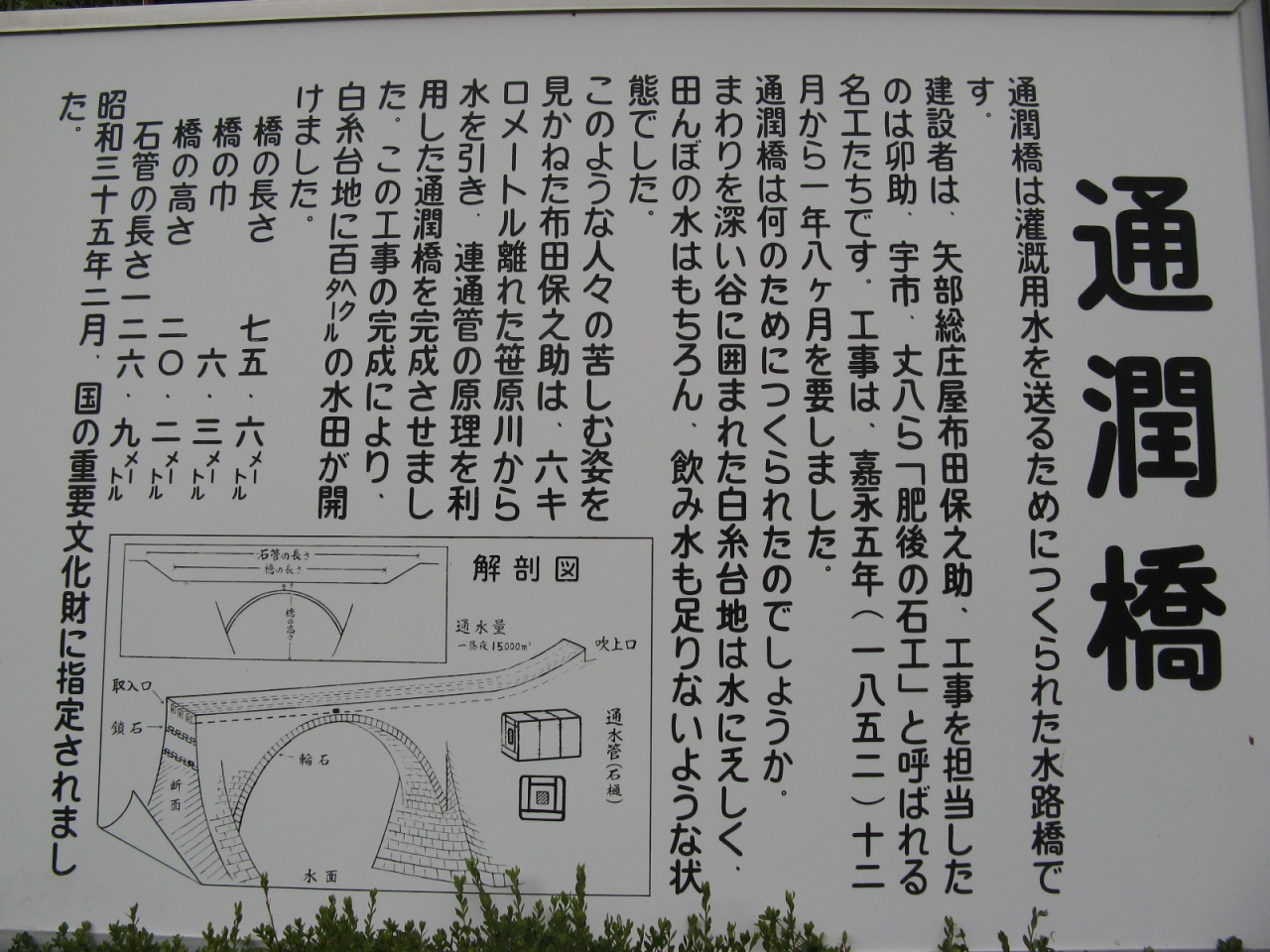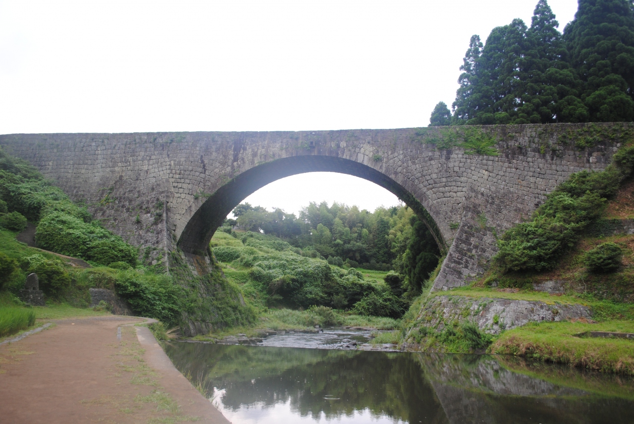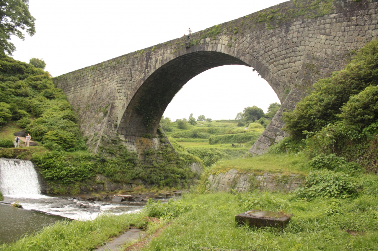 嘉永7年(1854年)、水不足に悩む白糸台地に水を送るため、矢部の惣庄屋布田保之助が全力を傾けて造った日本最大級の石造アーチ水路橋である。種山石工の技術を結集したこの橋は、高さ約20m、橋上の幅6,3m、アーチの水路28,18mで中央には飲用と潅漑用の3本の水道が通っている。水道は一方の高い所に取水口を設け、平坦な橋を通り、その勢いで対岸の高い所に水を吹き上げる逆サイホンの原理を応用、一昼夜で15,000立方mの水を送り、100haの水田を潤す力を備えている。水圧や地震に充分耐え得るような鞘石垣や鎖石の工法を用いた高度な技術力と、均整のとれた美しさが高く評価され、昭和35年には国の重要文化財に指定された。