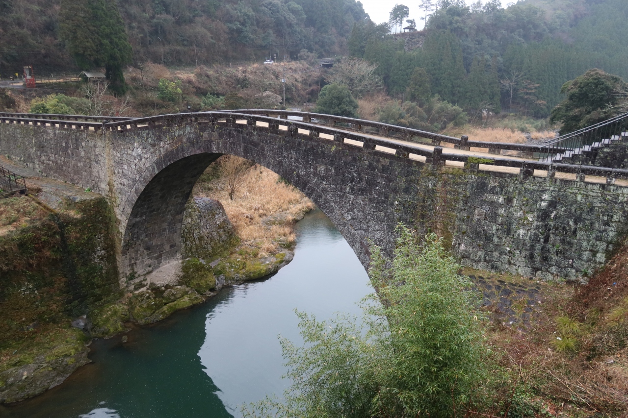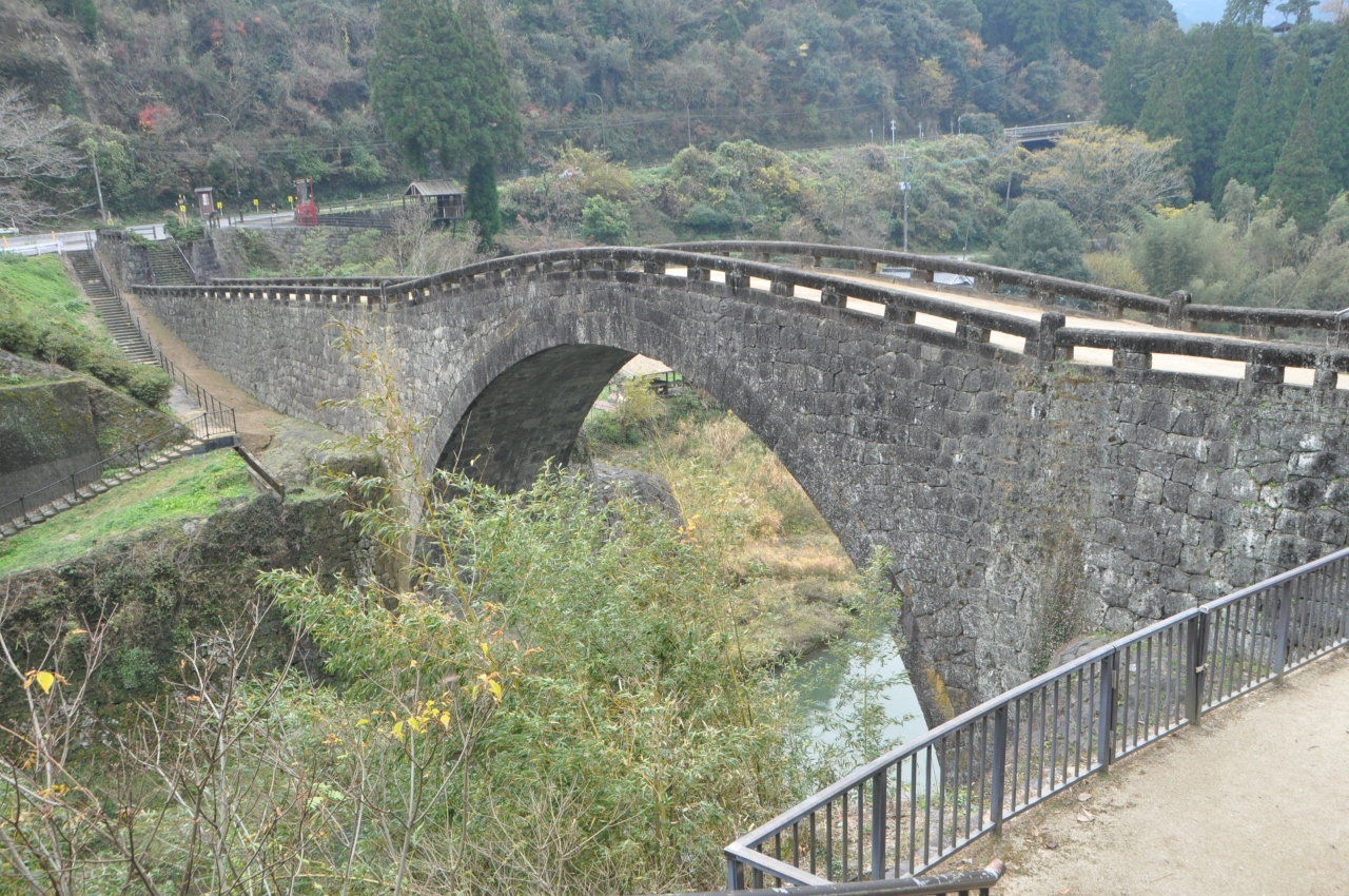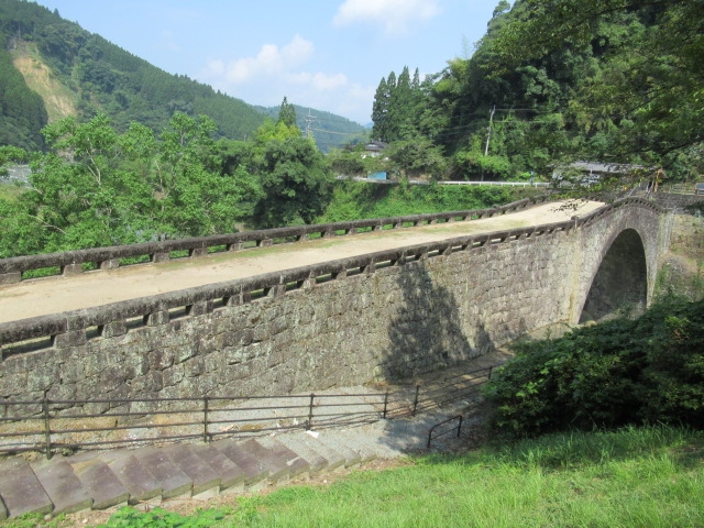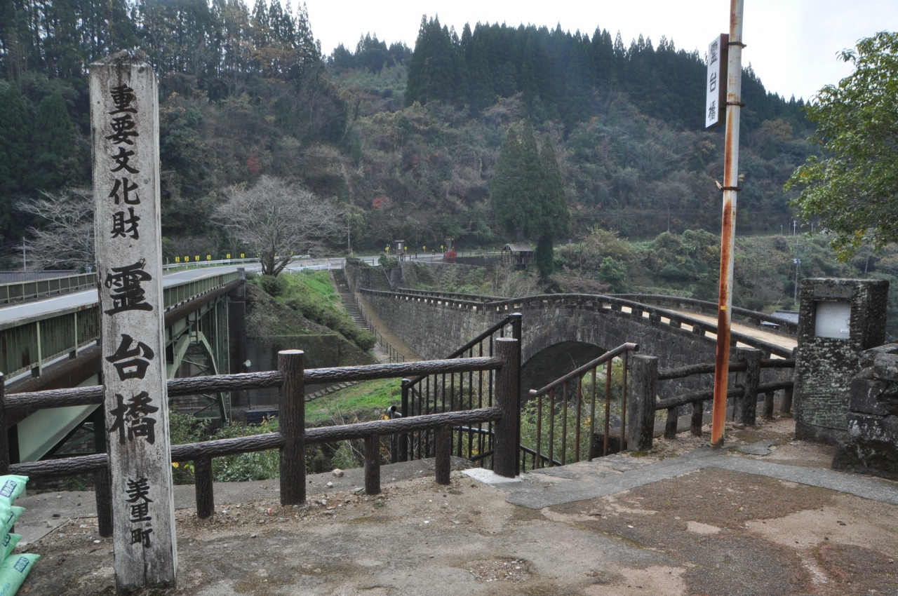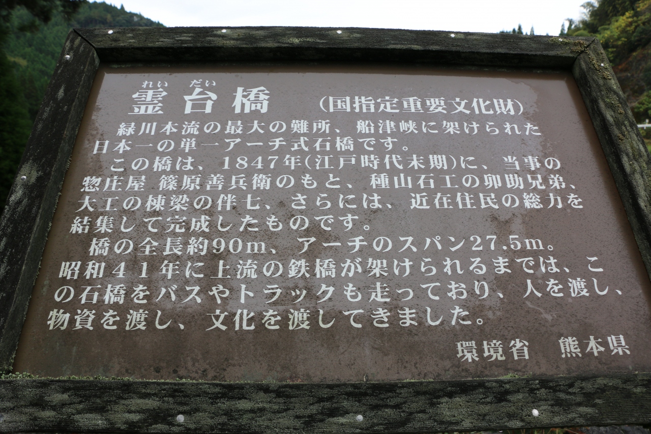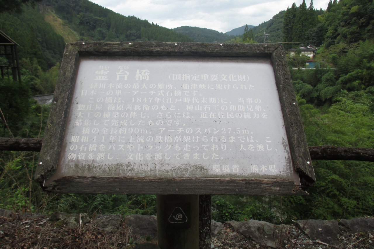 霊台橋は、美里町の清水というところにありました。格段に大きな橋!が第一印象です。架かっている川が緑川で、ほかの石橋の架かっ... 続きを読むている釈迦院川などとは比較出来ないほど大きな川でした。今はちょっと上流に船津ダムがありますが、江戸時代は遥かに大きな流れだったのでしょうね。築いたのは種山村の石工・卯助を頭領とし、地域一丸となって取り組んだそうです。緑川の水量の少ない冬期を工期の中心に置き、1846年(弘化3年)に起工して、翌1847年(弘化4年)に竣工と、わずか7ヶ月で完成させたそうです。霊台橋の名前は中国古典の難工事を短期間で成した文王霊台建造の様だと名付けられたそうです。橋の長さは約90m、幅は約5.5m、高さは約16mです。