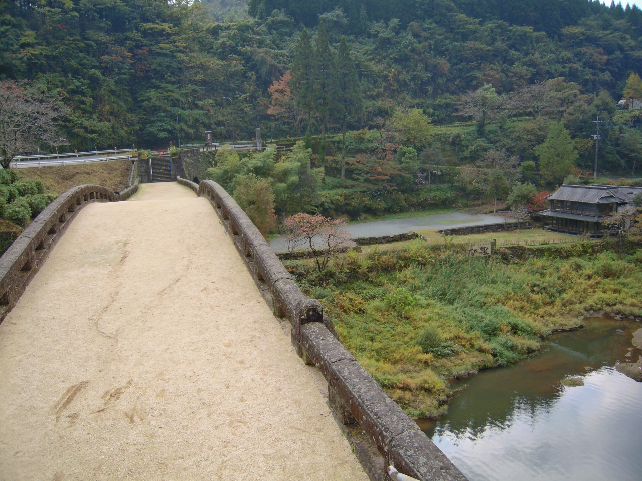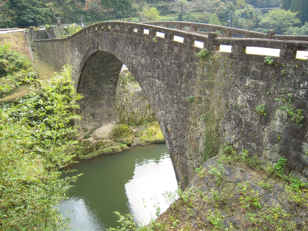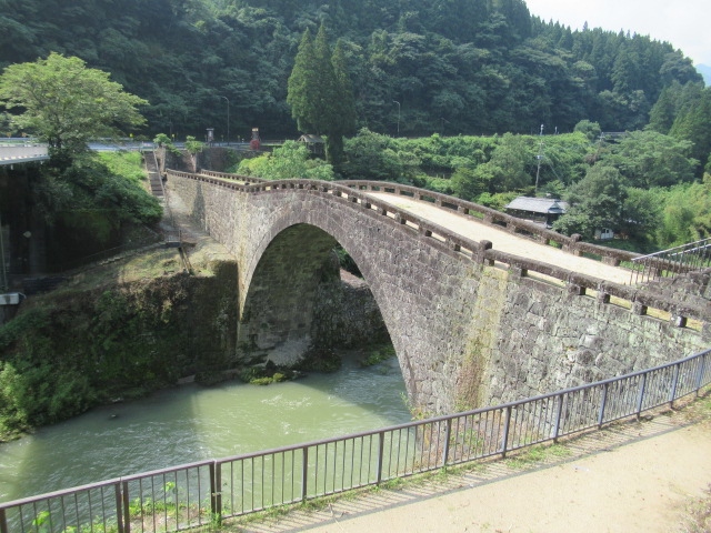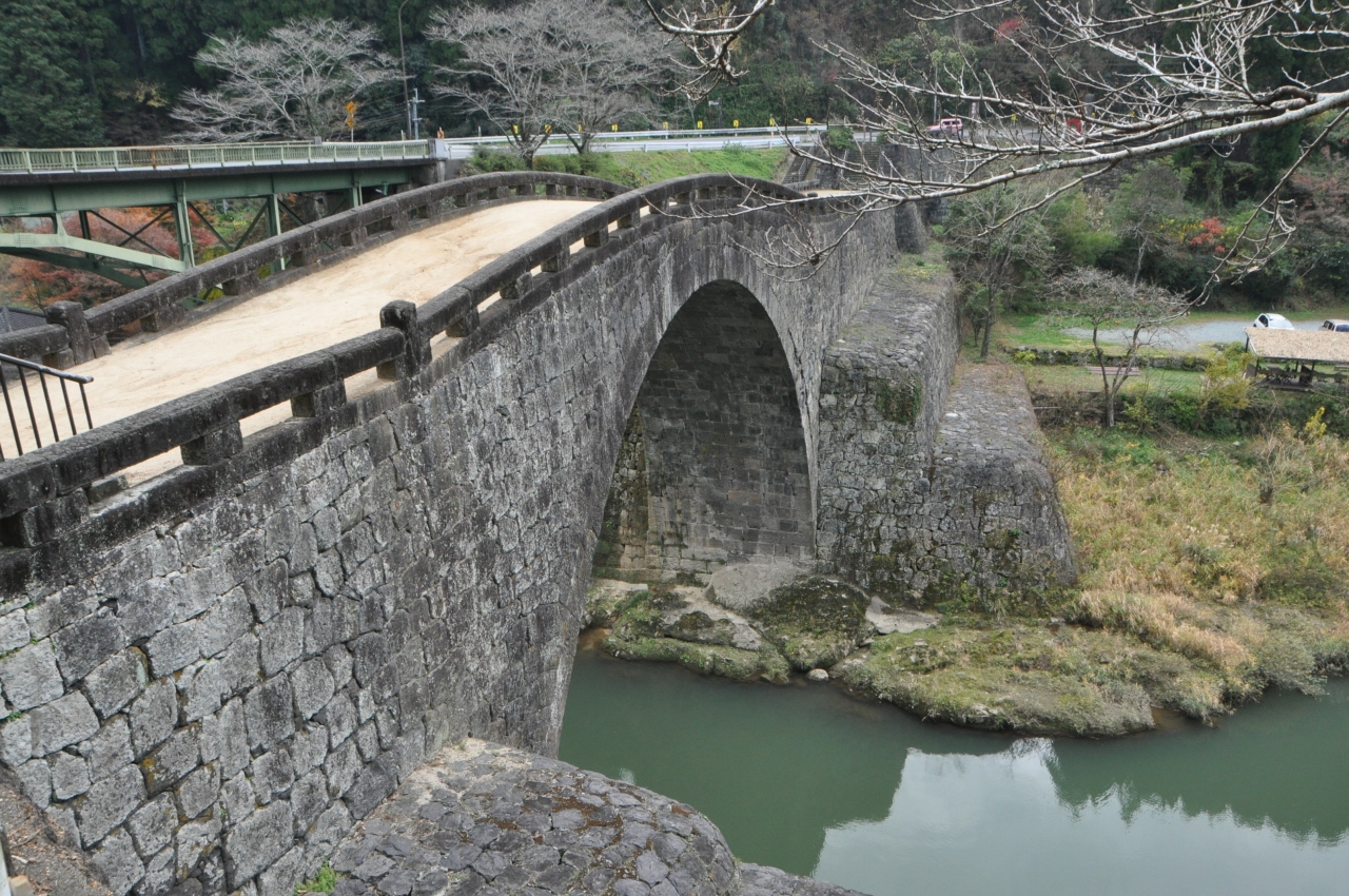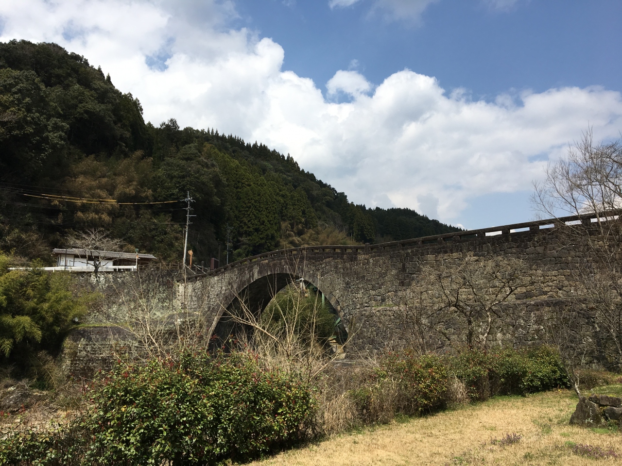 霊台橋は、美里町の清水というところにありました。格段に大きな橋!が第一印象です。架かっている川が緑川で、ほかの石橋の架かっ... 続きを読むている釈迦院川などとは比較出来ないほど大きな川でした。今はちょっと上流に船津ダムがありますが、江戸時代は遥かに大きな流れだったのでしょうね。築いたのは種山村の石工・卯助を頭領とし、地域一丸となって取り組んだそうです。緑川の水量の少ない冬期を工期の中心に置き、1846年(弘化3年)に起工して、翌1847年(弘化4年)に竣工と、わずか7ヶ月で完成させたそうです。霊台橋の名前は中国古典の難工事を短期間で成した文王霊台建造の様だと名付けられたそうです。橋の長さは約90m、幅は約5.5m、高さは約16mです。