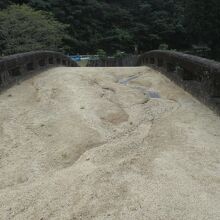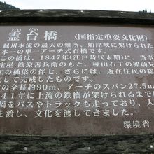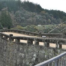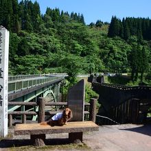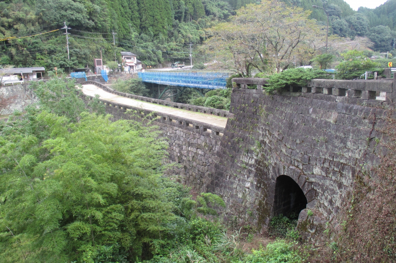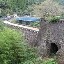 1900年(明治33年)に、車の通行のため石橋の上部を嵩上げしたそうです。1966年(昭和41年)に上流側に新霊台橋が架橋されたのを期に、1980年(昭和55年)から完成時の姿への復元工事が行われたとのことです。そのお陰で、今、目にするのは築造当時のままなのですね。一方、南側石垣に穴が見えましたが、1915年(大正4年)に内大臣森林鉄道のために開けられたものだそうです。鉄道は1962年(昭和37年)に廃止されたとのことですが、これは復元されていません。