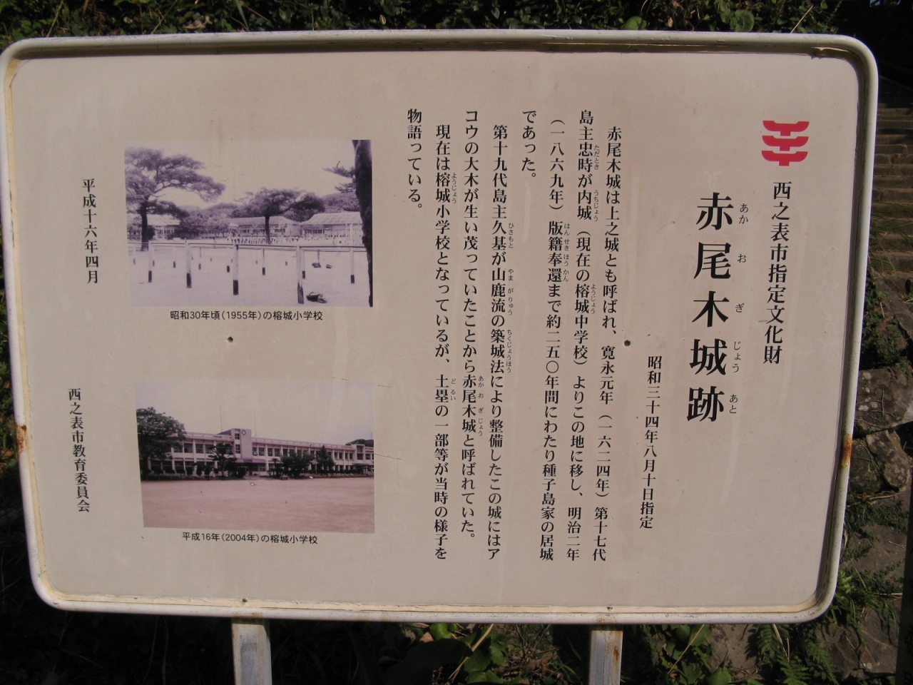 西之表港より歩いて約10分、榕城小学校周りが赤尾木城跡です。第17代島主忠時が寛永元年(1624年)に現在の榕城小学校に城... 続きを読むを構えて以来、明治2年(1869年)の版籍奉還まで種子島家の居城だったところです。