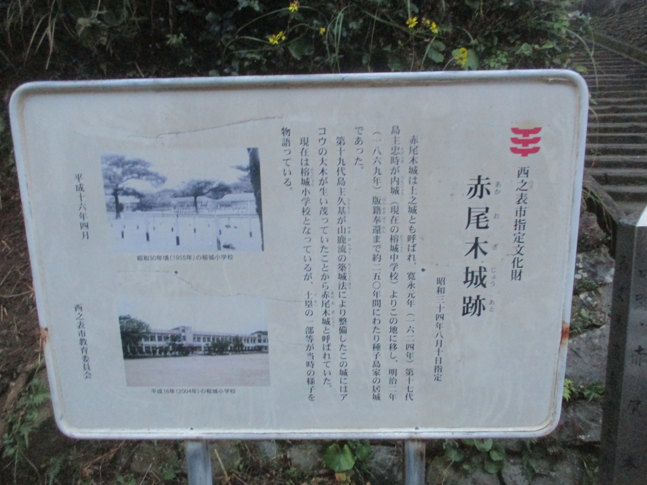 榕城小学校正門左側に赤尾木城跡の案内板(添付写真参照)があり、正門入口には当時のままの石積が残っており城跡を物語っていますが、それ以外には大掛かりな遺構は無く、ちょっと見、城跡と言う感じはありませんでした。