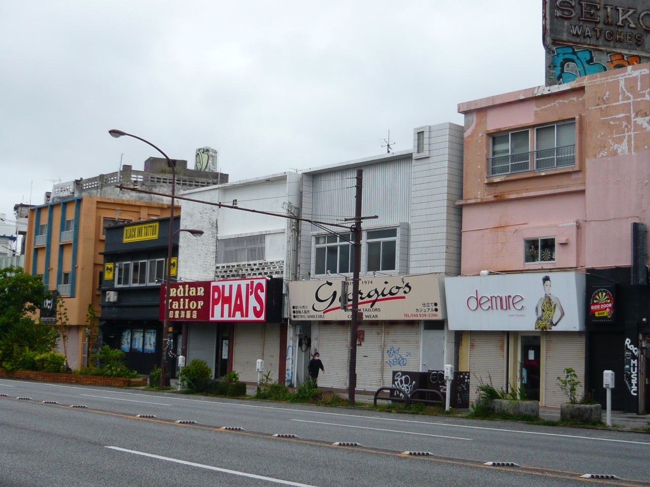 営業しているのは昔ながらの洋品店(オバーが店前でユンタクしてる)、怪しいせともの店、昭和っぽい化粧品店、占い店、謎の雑貨屋、理容室、ダンススタジオ(アメリカ人の父兄が前で子供を見守ってる)、タトゥーパーラー、ホテル(ドミトリーか?)、自転車屋(白人が経営・製作してる)、音楽教室などが点在しています。