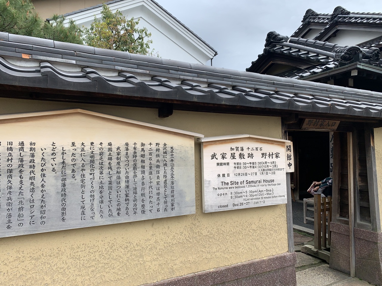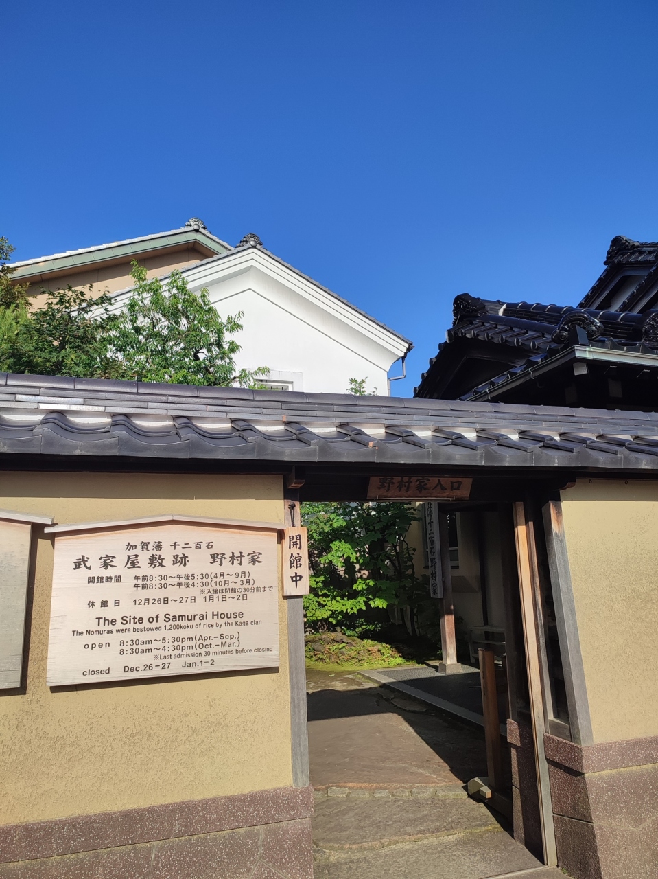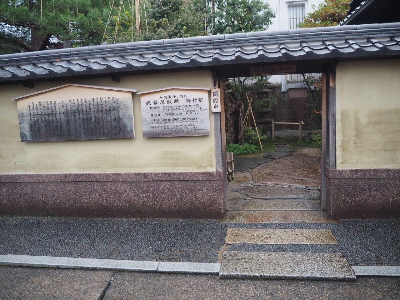 「長町武家屋敷跡野村家」へのアクセスは、「JR金沢駅東口」の7番のりばから「城下まち金沢周遊バス右回りルート」に乗り、「香... 続きを読む林坊」停留所で下車します。そこからバスの進行方向と同じ方向に30mほど進むと、最初の信号(表示名「日銀前」)があります。右折し横断歩道を渡り、110mほど進むと正面に「香林坊にぎわい広場」があります。そこを右折し30mほど進むと左手の角に駐車場があります。そこを左折し道なりに進むと「長町武家屋敷跡」になり、「長町武家屋敷跡野村家」はその一角にあります。 「武家屋敷跡 野村家」の見どころは、「上段の間」、総ヒノキ造りの「格天井」やギヤマン入りの「障子戸」、加賀藩のお抱え絵師による「襖絵」などが見どころです。樹齢400年以上の山桃やシイの古木が残り、濡縁にせまる曲水や落水、灯篭などが美しく配置された庭園は、2003年度の米国の庭園専門誌「ジャーナル・オブ・ジャパニーズ・ガーデニング誌」の日本庭園ランキングで3位に選ばれました。さらに「武家屋敷跡 野村家」は平成21年(2009年)発行の「ミシュラン・グリーンガイド・ジャポン」の格付けでも2つ星に選ばれており、海外からの観光客も多数訪れます。2階の茶室ではお抹茶をいただくことができます。また、「鬼川文庫」では野村家伝来の刀剣や前田家からの書状などさまざまな資料が展示されています。 01_【「長町武家屋敷跡野村家」の一口メモ】 ⑴ 所在地…〒920-0865 石川県金沢市長町1丁目3-32 電話:076-221-3553 ⑵ 入館時間…8:30〜17:30(10〜3月は8:30〜16:30、入館は左記の閉館の30分前まで)、 ⑶ 休館日…12月26日・27日、1月1日・2日休館 ⑷ 料金…①大人550円 ②高校生400円 ③小中生250円 ★人気スポットのため、ゆっくりと見たい方は朝がおすすめで、開館は8時30分です。 02_【「長町武家屋敷跡野村家」へのアクセス】 ⑴ JR「金沢駅」東口から徒歩27分1900m ⑵ バスを利用して「長町武家屋敷跡」へ ①城下まち金沢周遊バス右回りルート ・バス乗り場:「JR金沢駅東口」(7番のりば) ・12停留所目「片町」停留所の次の停留所) 所要時間約16分 ・9時から17時の間に1時間平均4便(始発8:35、終発18:05) ・「香林坊」停留所で下車し「長町武家屋敷跡」まで徒歩5分350m ⇒バスは「香林坊」停留所に停まるので下車した後、バスの進行方向と同じ方向に30mほど進むと、最初の信号(表示名「日銀前」)があります。右折し横断歩道を渡り、110mほど進むと正面に「香林坊にぎわい広場」があります。そこを右折し30mほど進むと左手の角に駐車場があります。そこを左折し道なりに進むと「長町武家屋敷跡」になります。 ②その他のバスによるアクセス ア 北陸鉄道路線バス・西日本JRバス「香林坊」バス停から徒歩約5分 イ まちバス「香林坊大和・アトリオ」「香林坊東急スクエア・日銀前」バス停から徒歩約5分 ウ 金沢ふらっとバス長町ルート「長町武家屋敷跡」バス停からすぐ 閉じる