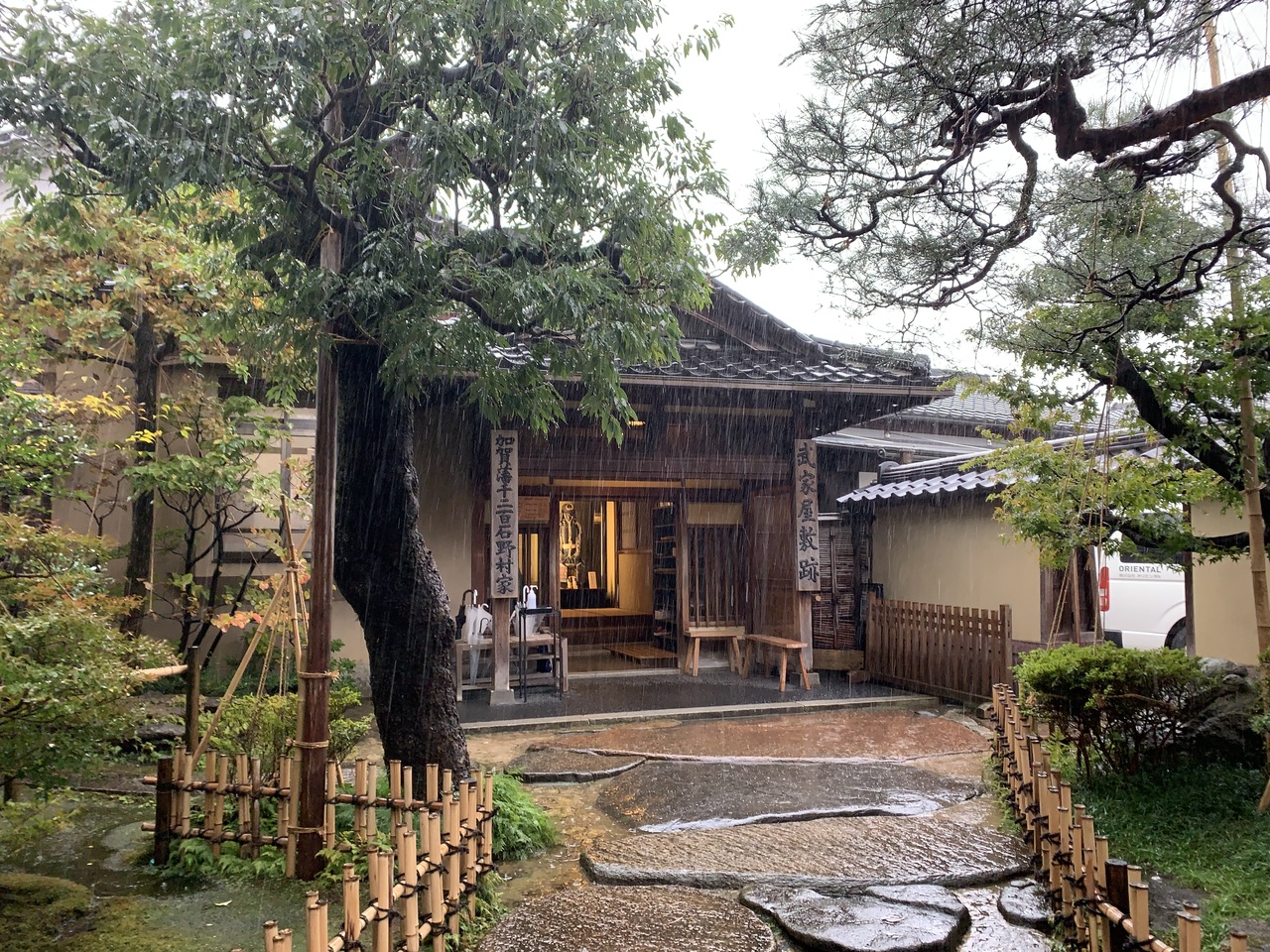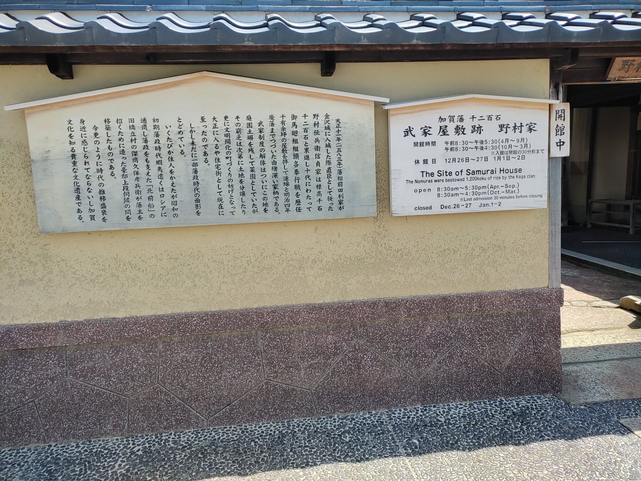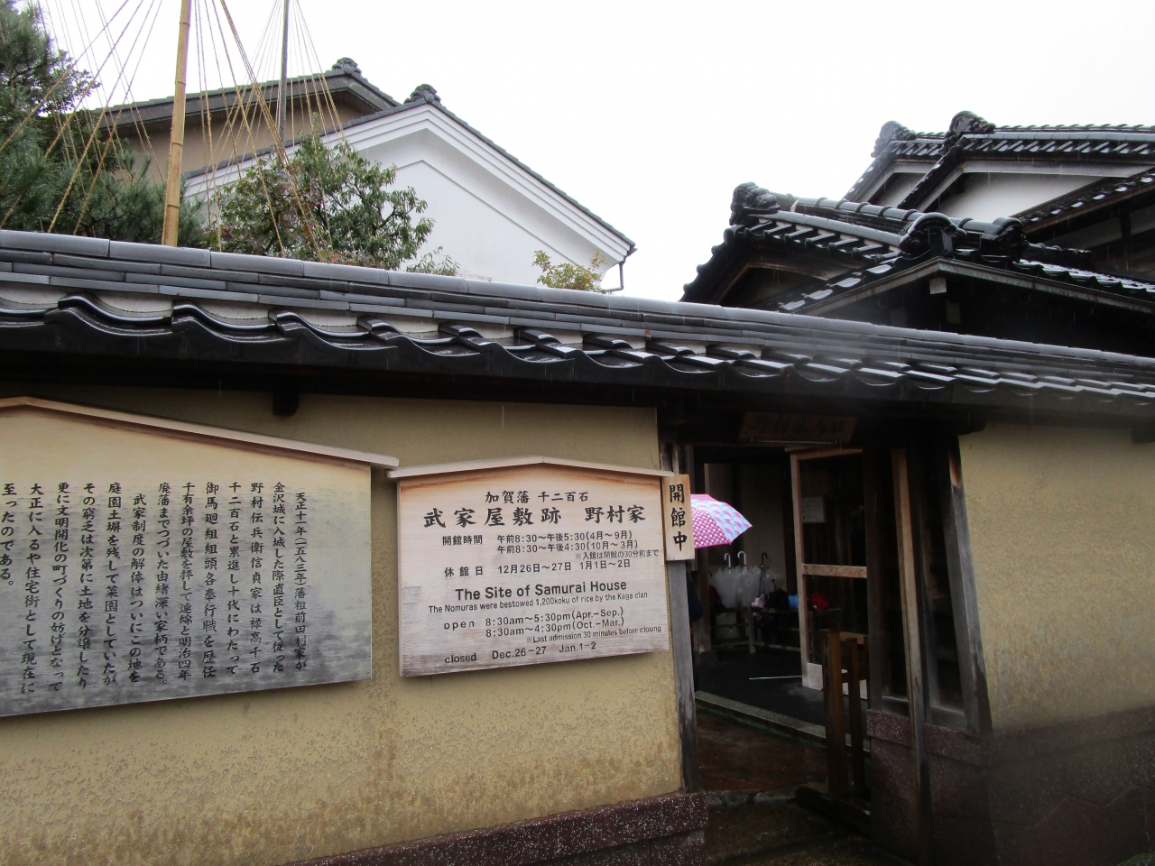 「長町武家屋敷跡野村家」へのアクセスは、「JR金沢駅東口」の7番のりばから「城下まち金沢周遊バス右回りルート」に乗り、「香... 続きを読む林坊」停留所で下車します。そこからバスの進行方向と同じ方向に30mほど進むと、最初の信号(表示名「日銀前」)があります。右折し横断歩道を渡り、110mほど進むと正面に「香林坊にぎわい広場」があります。そこを右折し30mほど進むと左手の角に駐車場があります。そこを左折し道なりに進むと「長町武家屋敷跡」になり、「長町武家屋敷跡野村家」はその一角にあります。 「武家屋敷跡 野村家」の見どころは、「上段の間」、総ヒノキ造りの「格天井」やギヤマン入りの「障子戸」、加賀藩のお抱え絵師による「襖絵」などが見どころです。樹齢400年以上の山桃やシイの古木が残り、濡縁にせまる曲水や落水、灯篭などが美しく配置された庭園は、2003年度の米国の庭園専門誌「ジャーナル・オブ・ジャパニーズ・ガーデニング誌」の日本庭園ランキングで3位に選ばれました。さらに「武家屋敷跡 野村家」は平成21年(2009年)発行の「ミシュラン・グリーンガイド・ジャポン」の格付けでも2つ星に選ばれており、海外からの観光客も多数訪れます。2階の茶室ではお抹茶をいただくことができます。また、「鬼川文庫」では野村家伝来の刀剣や前田家からの書状などさまざまな資料が展示されています。 01_【「長町武家屋敷跡野村家」の一口メモ】 ⑴ 所在地…〒920-0865 石川県金沢市長町1丁目3-32 電話:076-221-3553 ⑵ 入館時間…8:30〜17:30(10〜3月は8:30〜16:30、入館は左記の閉館の30分前まで)、 ⑶ 休館日…12月26日・27日、1月1日・2日休館 ⑷ 料金…①大人550円 ②高校生400円 ③小中生250円 ★人気スポットのため、ゆっくりと見たい方は朝がおすすめで、開館は8時30分です。 02_【「長町武家屋敷跡野村家」へのアクセス】 ⑴ JR「金沢駅」東口から徒歩27分1900m ⑵ バスを利用して「長町武家屋敷跡」へ ①城下まち金沢周遊バス右回りルート ・バス乗り場:「JR金沢駅東口」(7番のりば) ・12停留所目「片町」停留所の次の停留所) 所要時間約16分 ・9時から17時の間に1時間平均4便(始発8:35、終発18:05) ・「香林坊」停留所で下車し「長町武家屋敷跡」まで徒歩5分350m ⇒バスは「香林坊」停留所に停まるので下車した後、バスの進行方向と同じ方向に30mほど進むと、最初の信号(表示名「日銀前」)があります。右折し横断歩道を渡り、110mほど進むと正面に「香林坊にぎわい広場」があります。そこを右折し30mほど進むと左手の角に駐車場があります。そこを左折し道なりに進むと「長町武家屋敷跡」になります。 ②その他のバスによるアクセス ア 北陸鉄道路線バス・西日本JRバス「香林坊」バス停から徒歩約5分 イ まちバス「香林坊大和・アトリオ」「香林坊東急スクエア・日銀前」バス停から徒歩約5分 ウ 金沢ふらっとバス長町ルート「長町武家屋敷跡」バス停からすぐ 閉じる