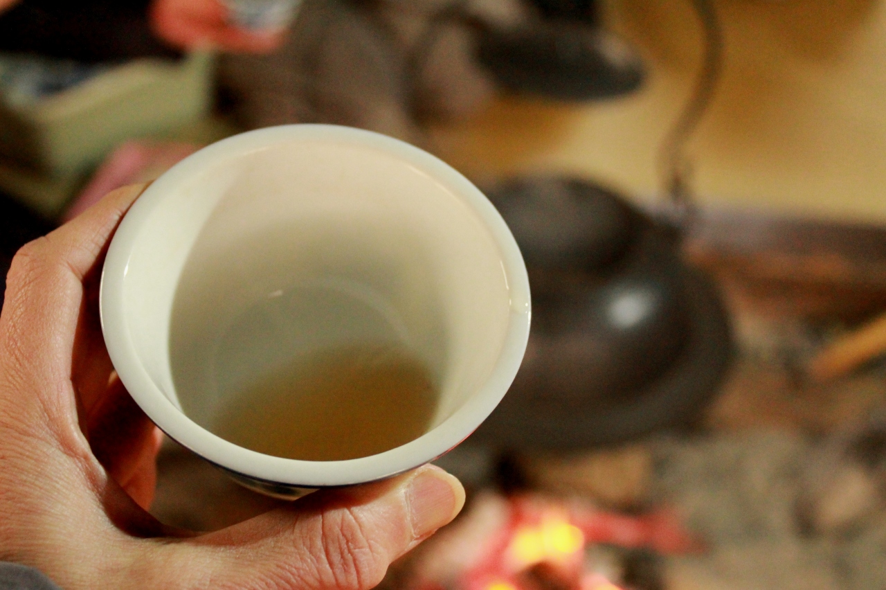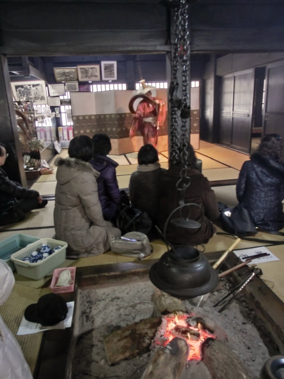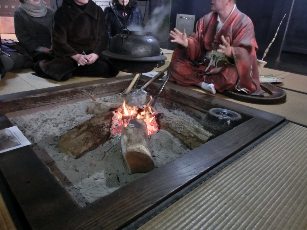 カワラケツメイ(薬草)のお茶も用意された“おえ”で囲炉裏を囲んで、ご当主さんが穏やかな口調で五箇山の生活の様子や民俗文化や合掌造りについて(約10~15分)語ってくれます。古代民謡「筑子(こきりこ)」の披露もあります。