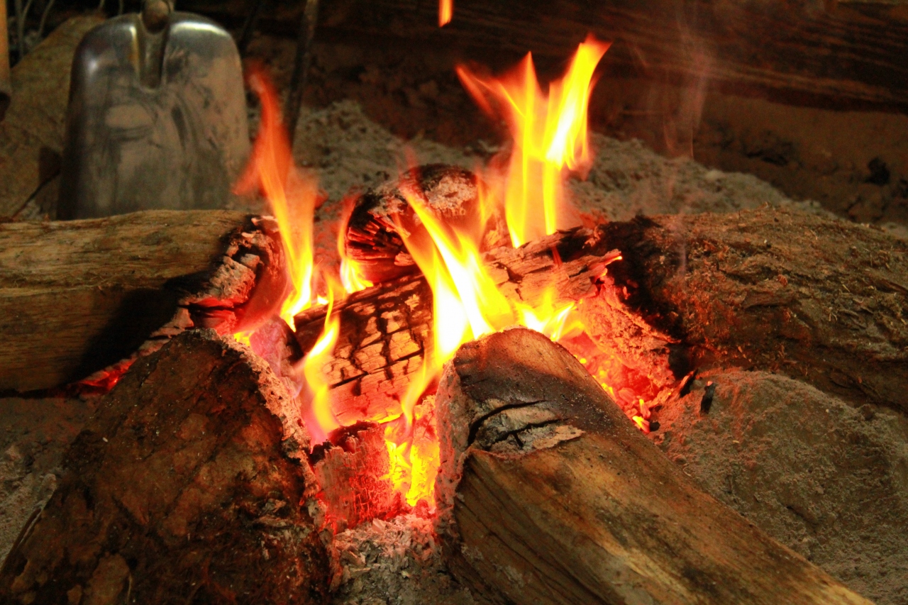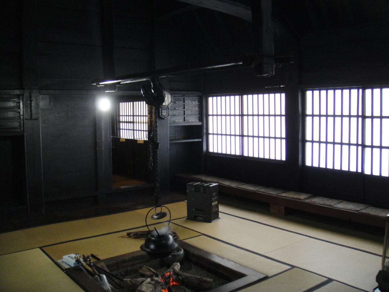 “おえ”といわれる居間には1年を通して囲炉裏が灯されています。囲炉裏はかつては、塩硝のもととなる土の灰汁(アク)を煮つめ、その火の熱で屋根裏まで温めて養蚕を営み、囲炉裏のススで、合掌造りの建物を守ってきたそうです。