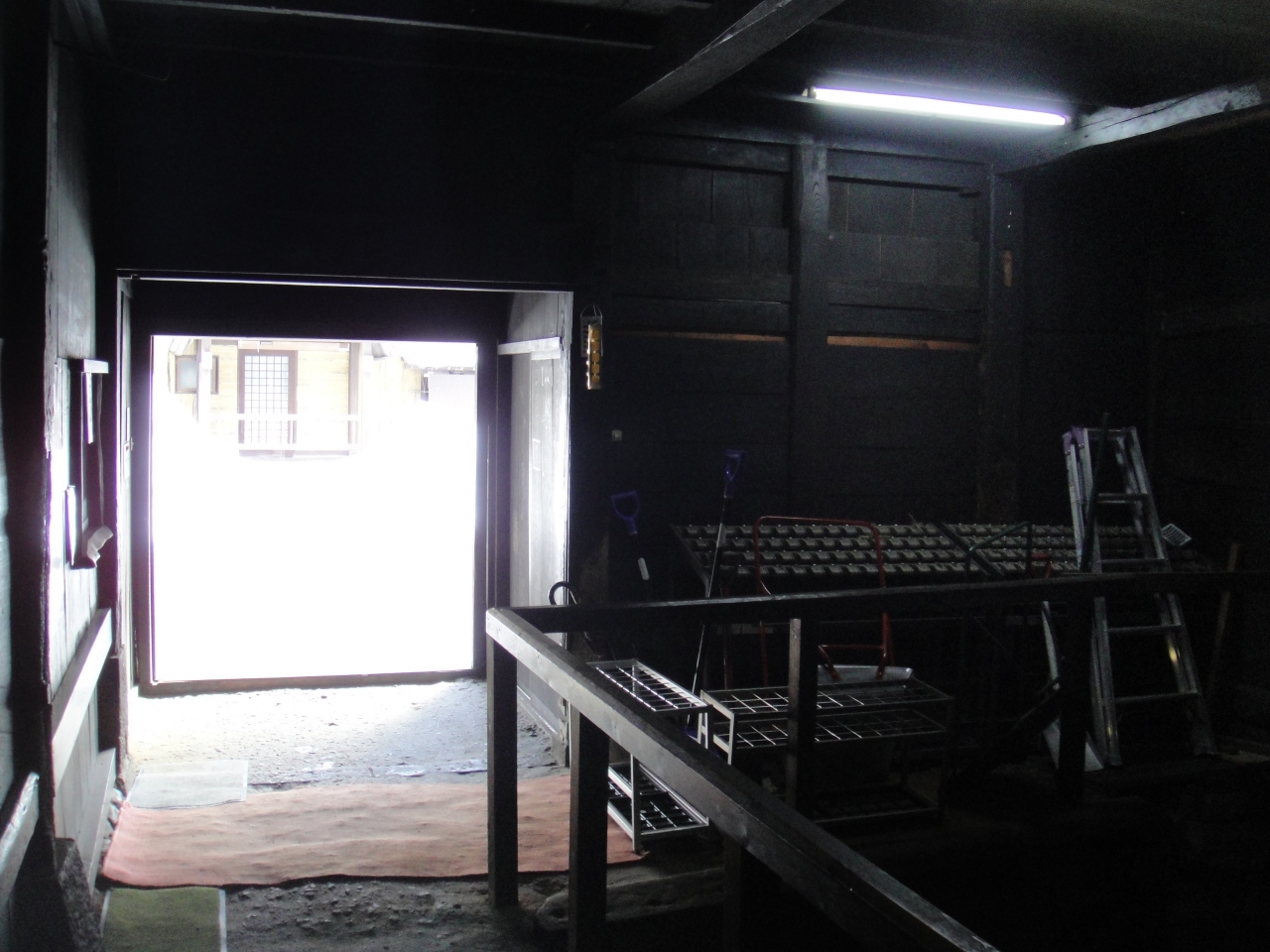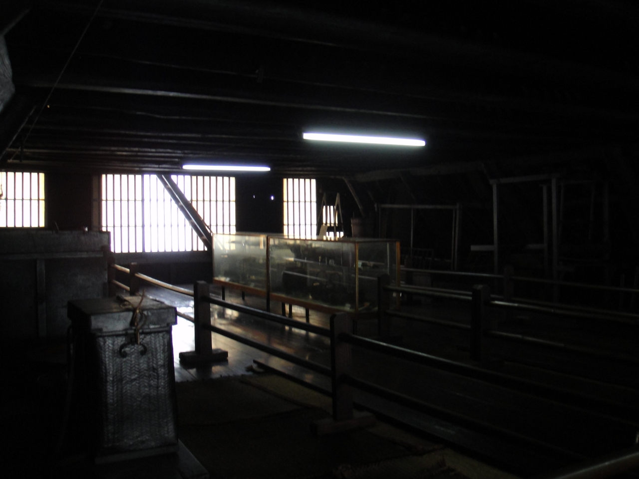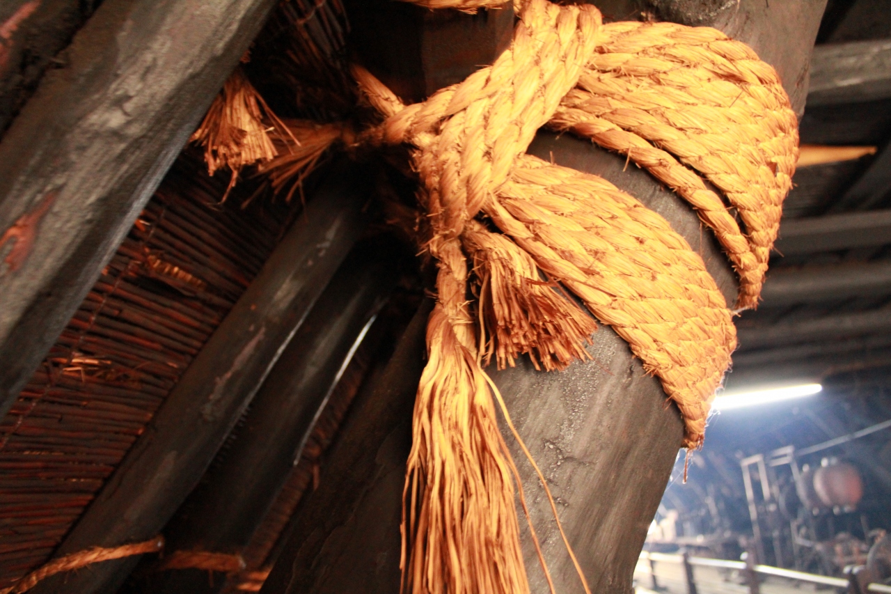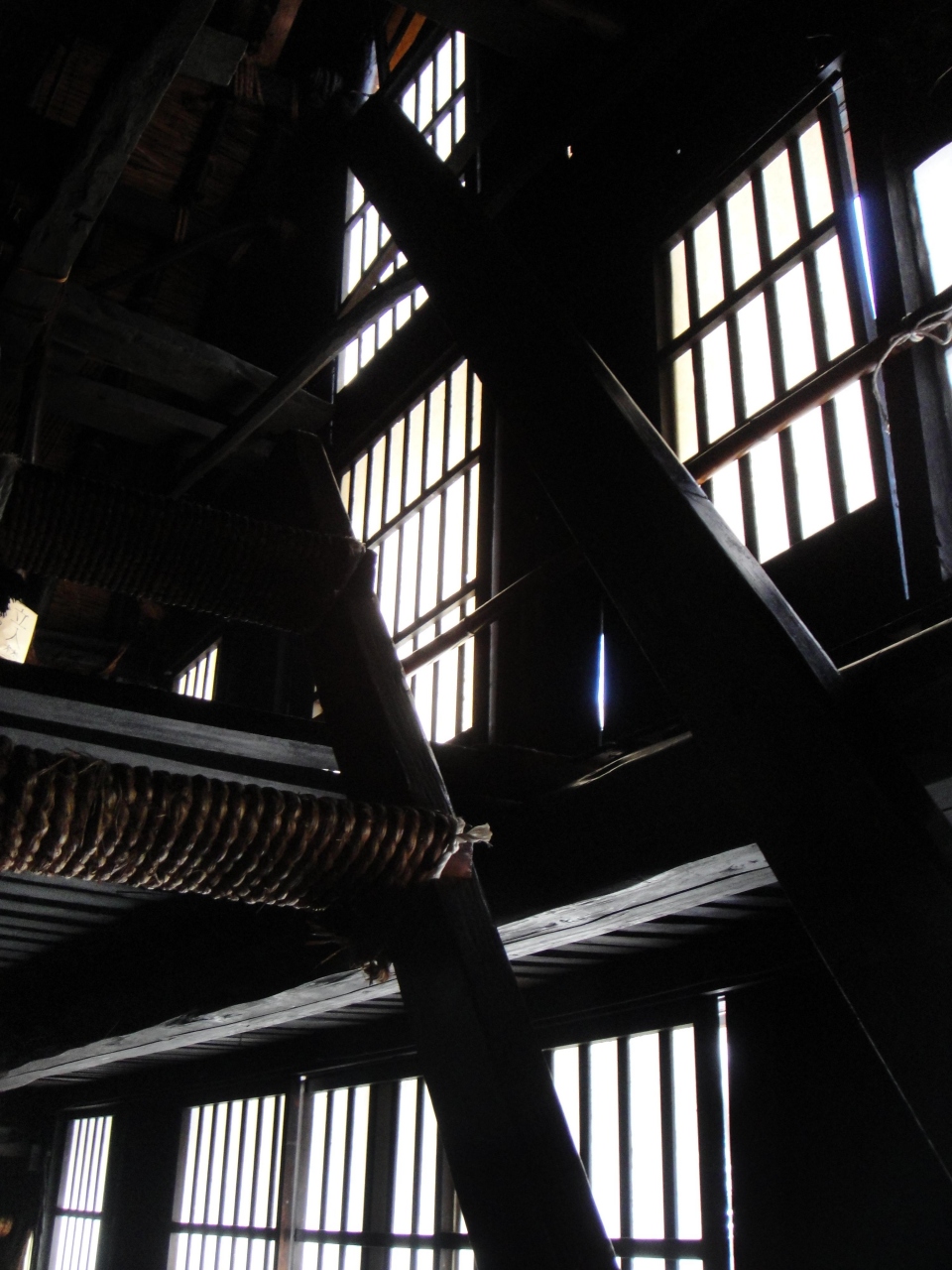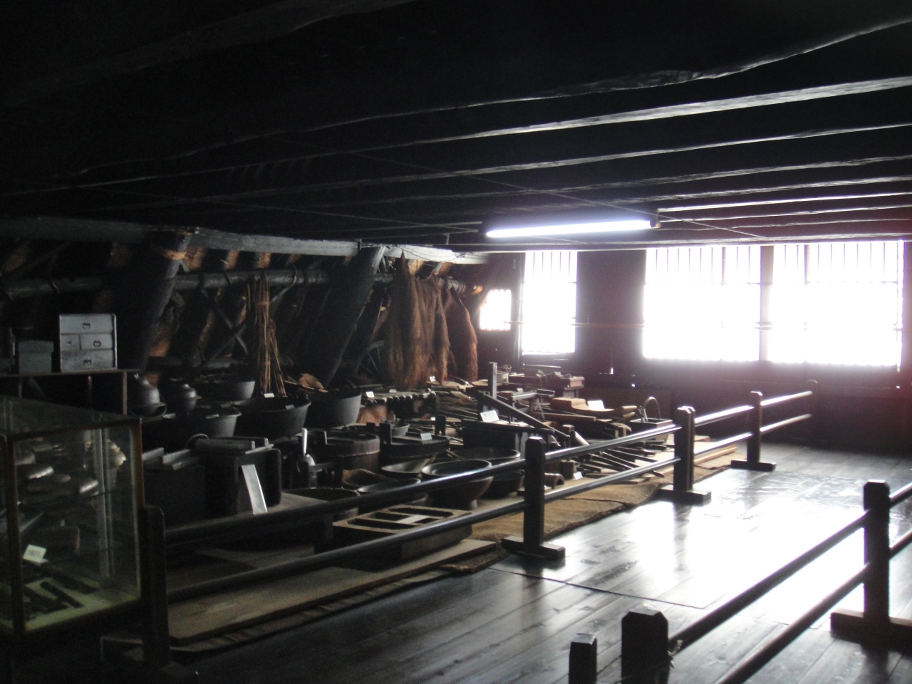 建物も、カスガイや釘などを一切使用せず、縄や自然に曲がった木などを使って結束して組み上げられています。是非2階、3階にも上がって(梯子利用)屋根の部分を見られることをおススメします。屋内には、五箇山の主産業であった煙硝製造・和紙製造や日常生活に使われた諸用具なども、展示されています。