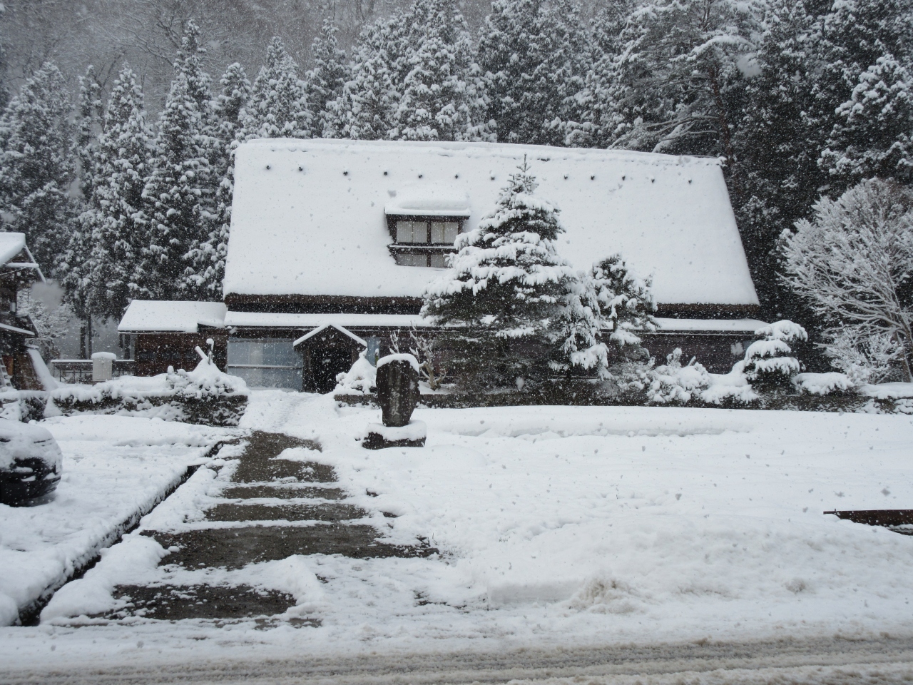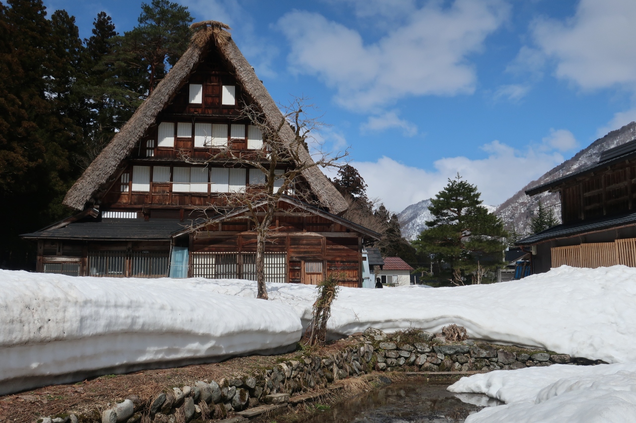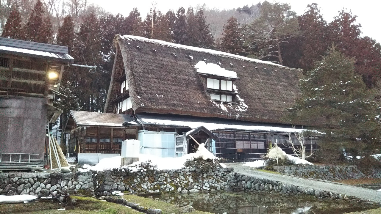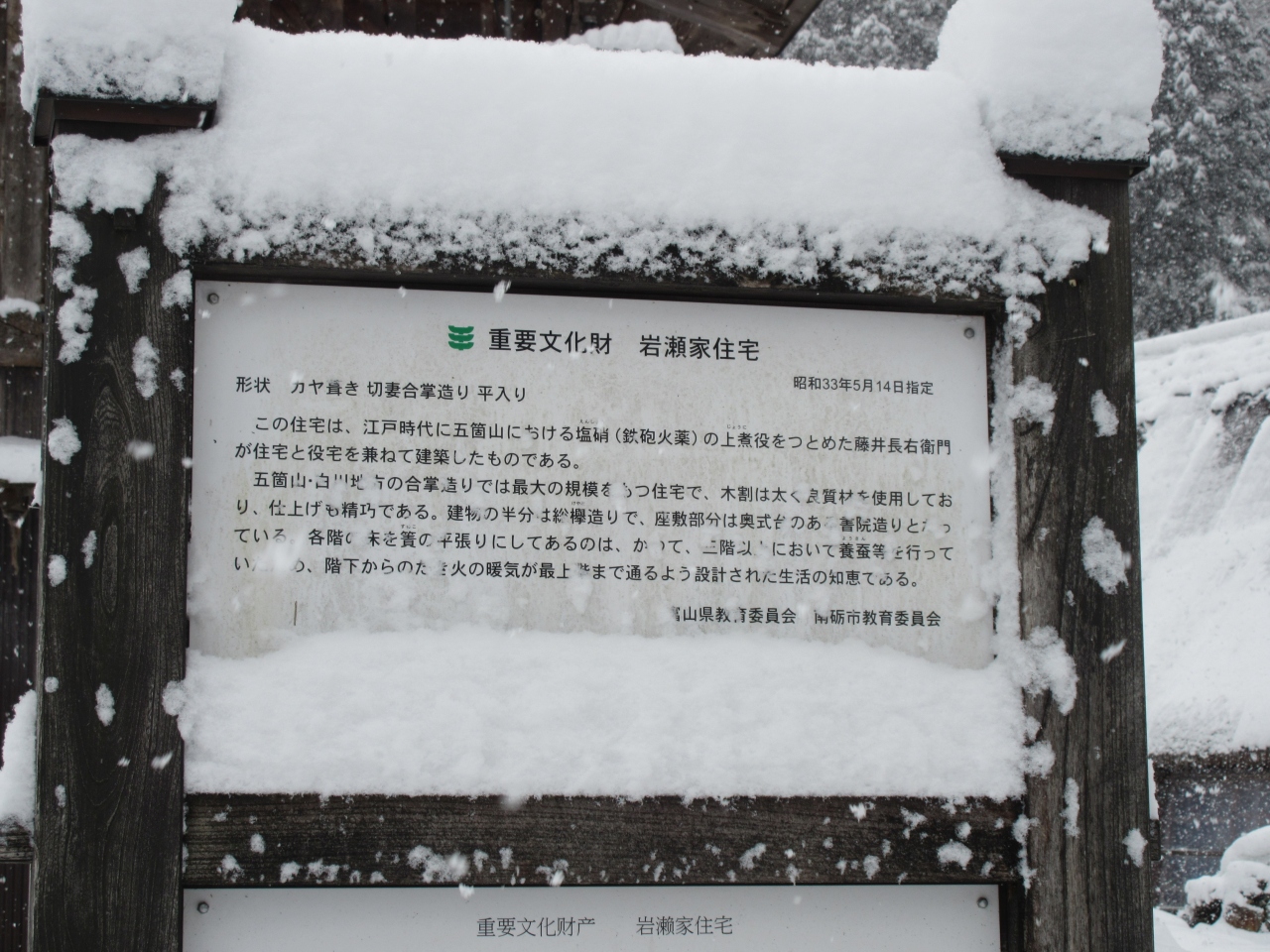 湿気が多く重たい雪が降る五箇山では、他の地域に... 続きを読む比べ雪を落としやすい急な屋根と、玄関が妻側(正面)にある家屋が多いのが特徴です。