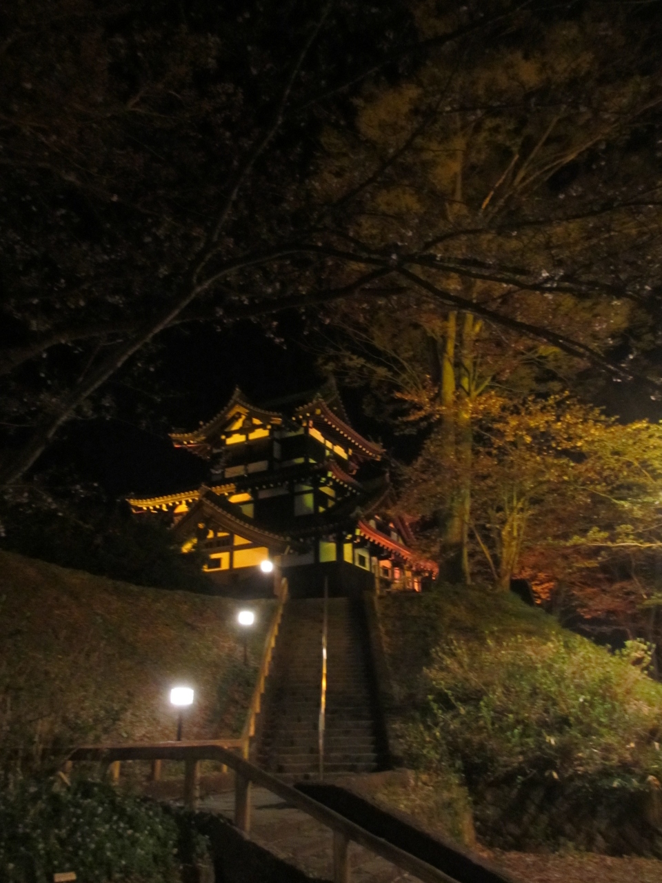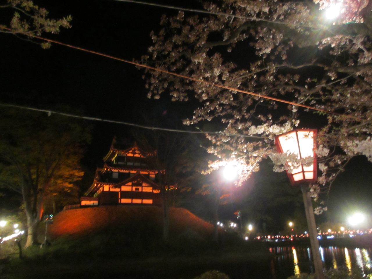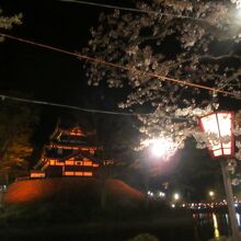 夜桜の名所に建つ三重の櫓