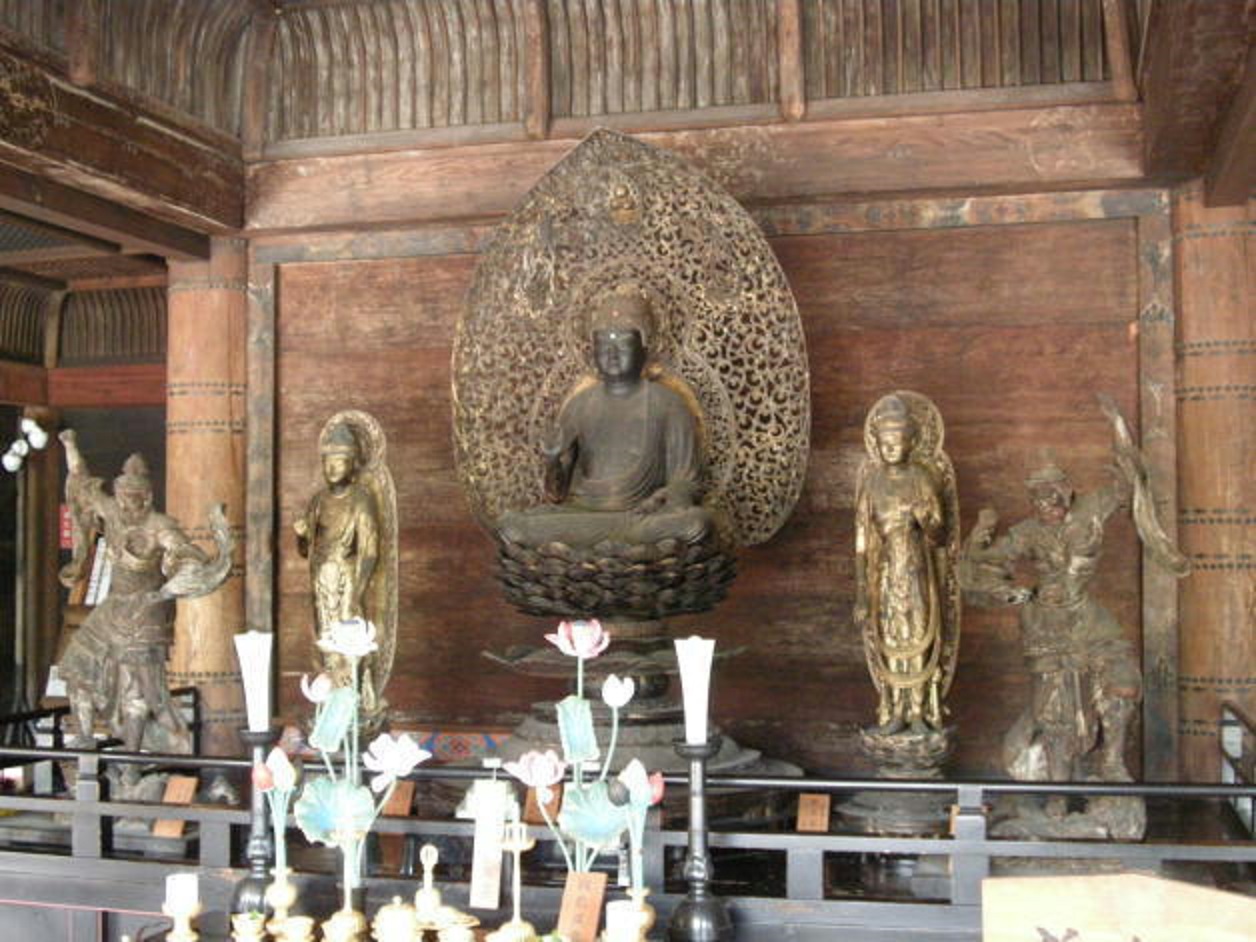 杮葺(こけらぶき)の阿弥陀堂が建造物として国宝に指定され、堂内には阿弥陀三尊(国重文)、持国・多聞天王(国重文)が安置されている。