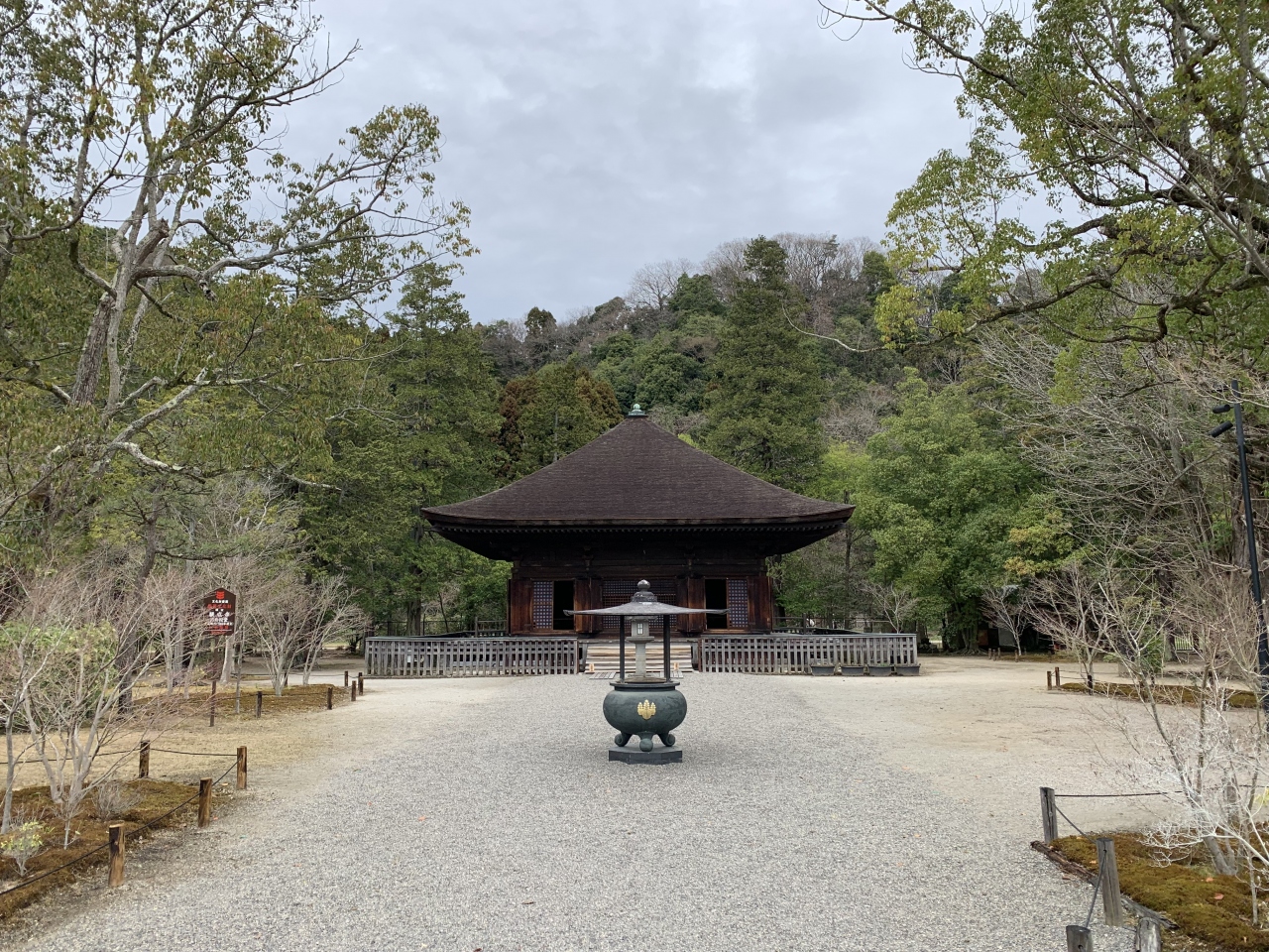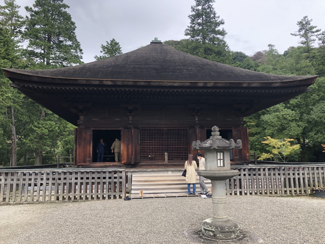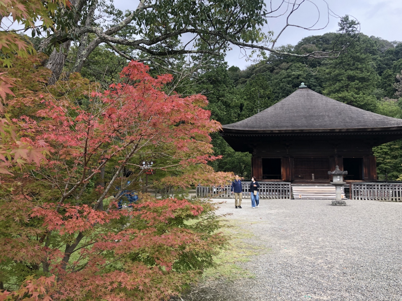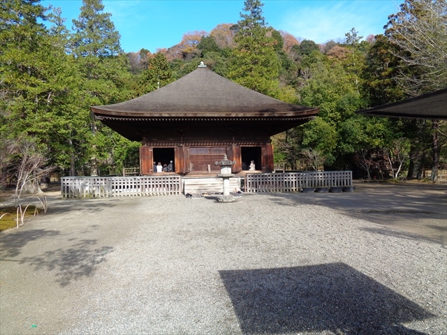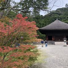 大型バスも停まり、紅葉目当ての観光客もあちこちにいる。右に小御堂跡、左に中ノ坊跡があった大きな原っぱを通って阿弥陀堂に向うと、ちょうど前の組が堂内の説明中で14:25まで待つことになった。