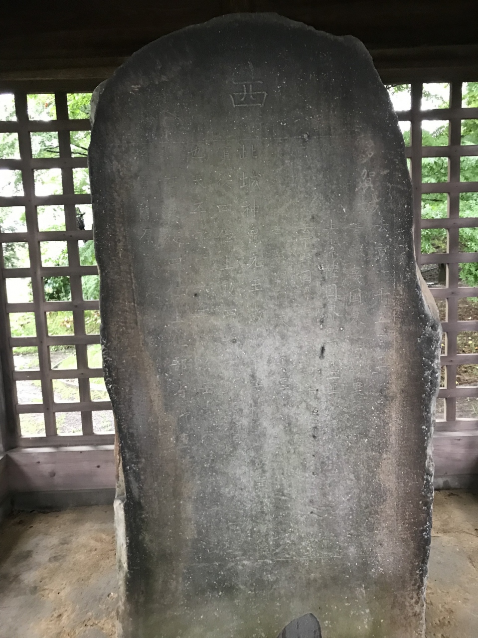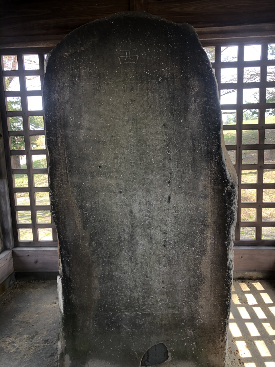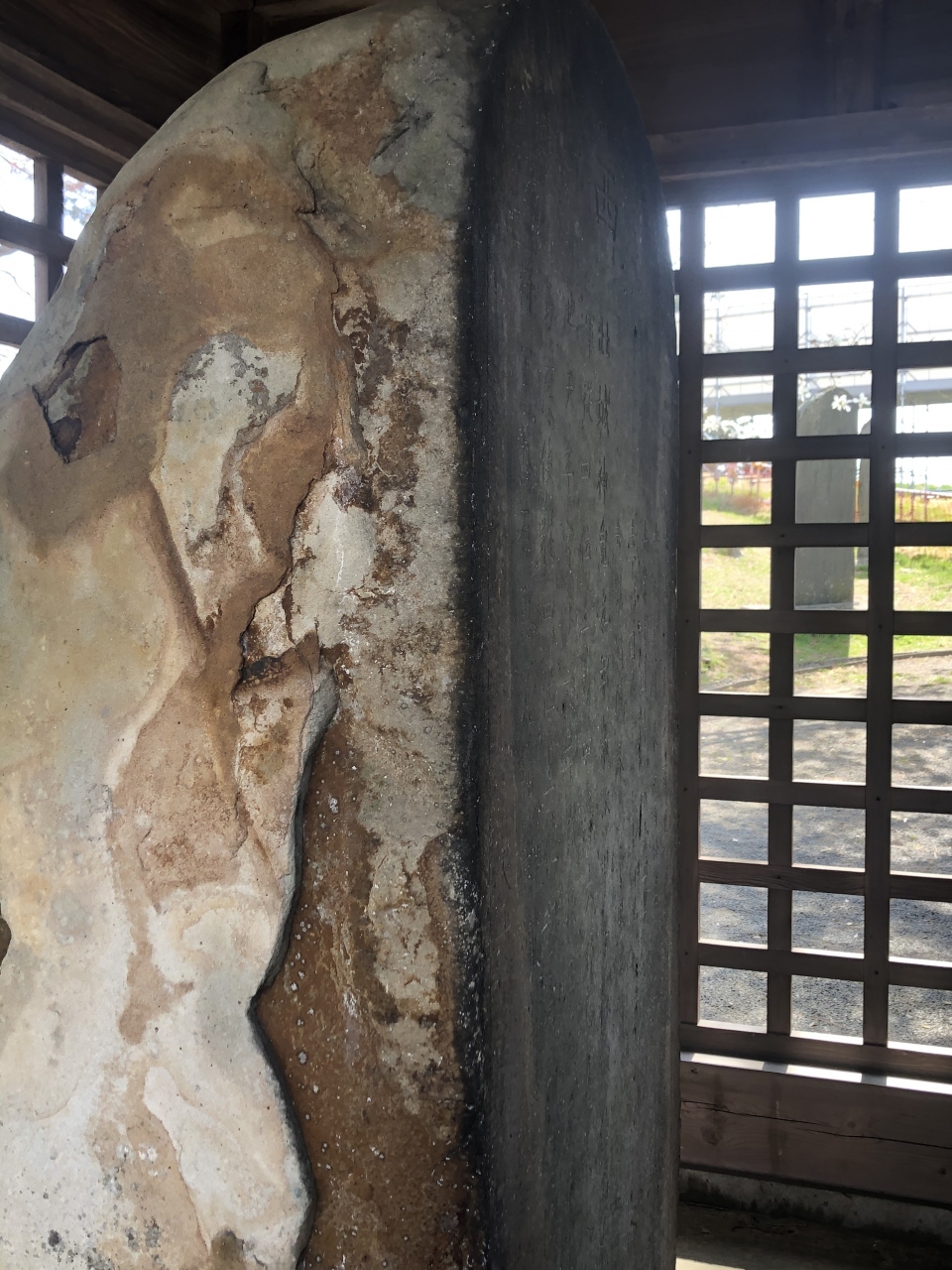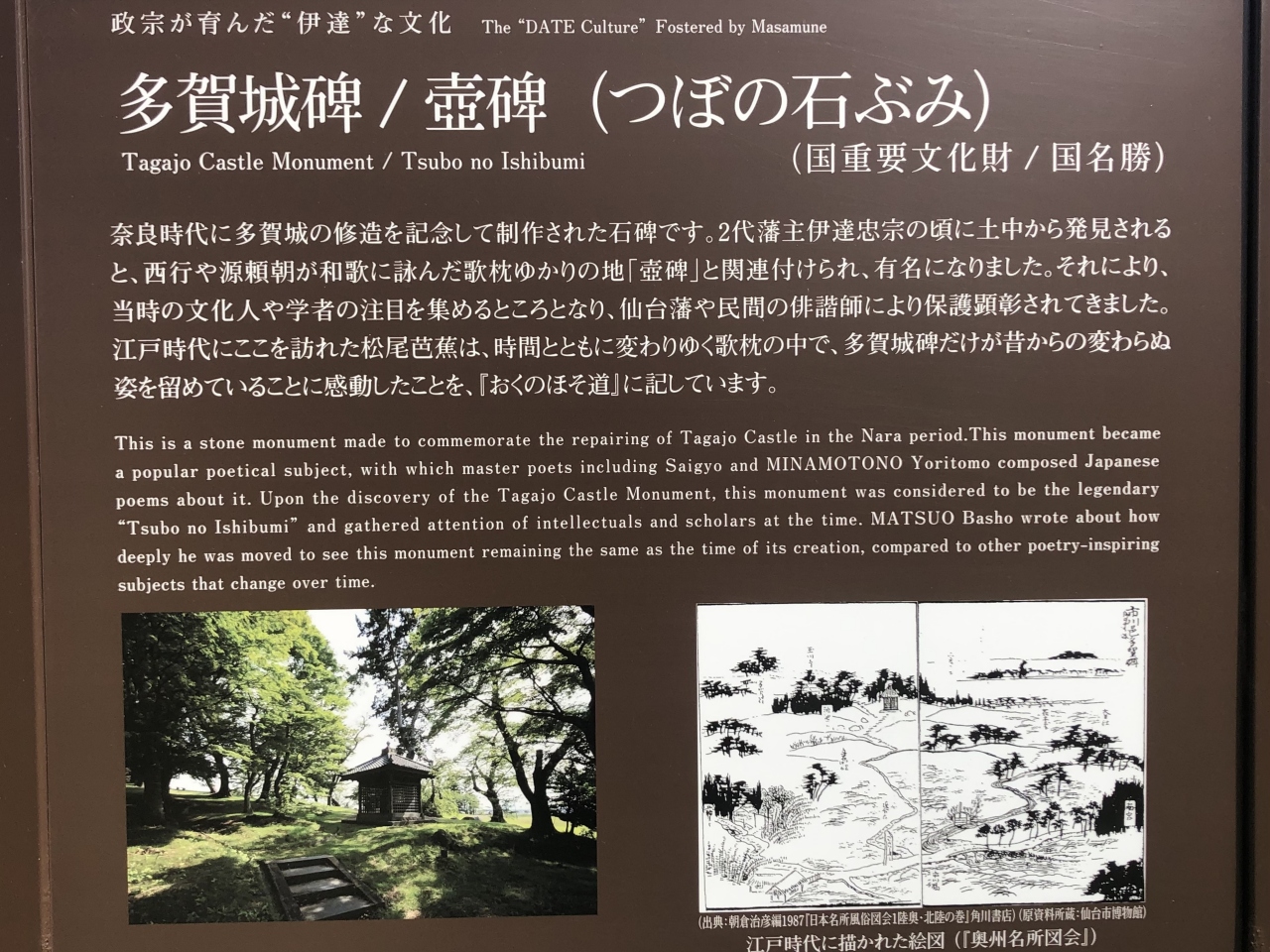 壺の碑とは8世紀に作られた記念碑であるが、芭蕉たちはこれを陸奥の奥にあるという歌枕「壺の碑」と勘違い?誤伝?したものらしい。現在は小さな建物の中に納められ、文字を読むことができる。