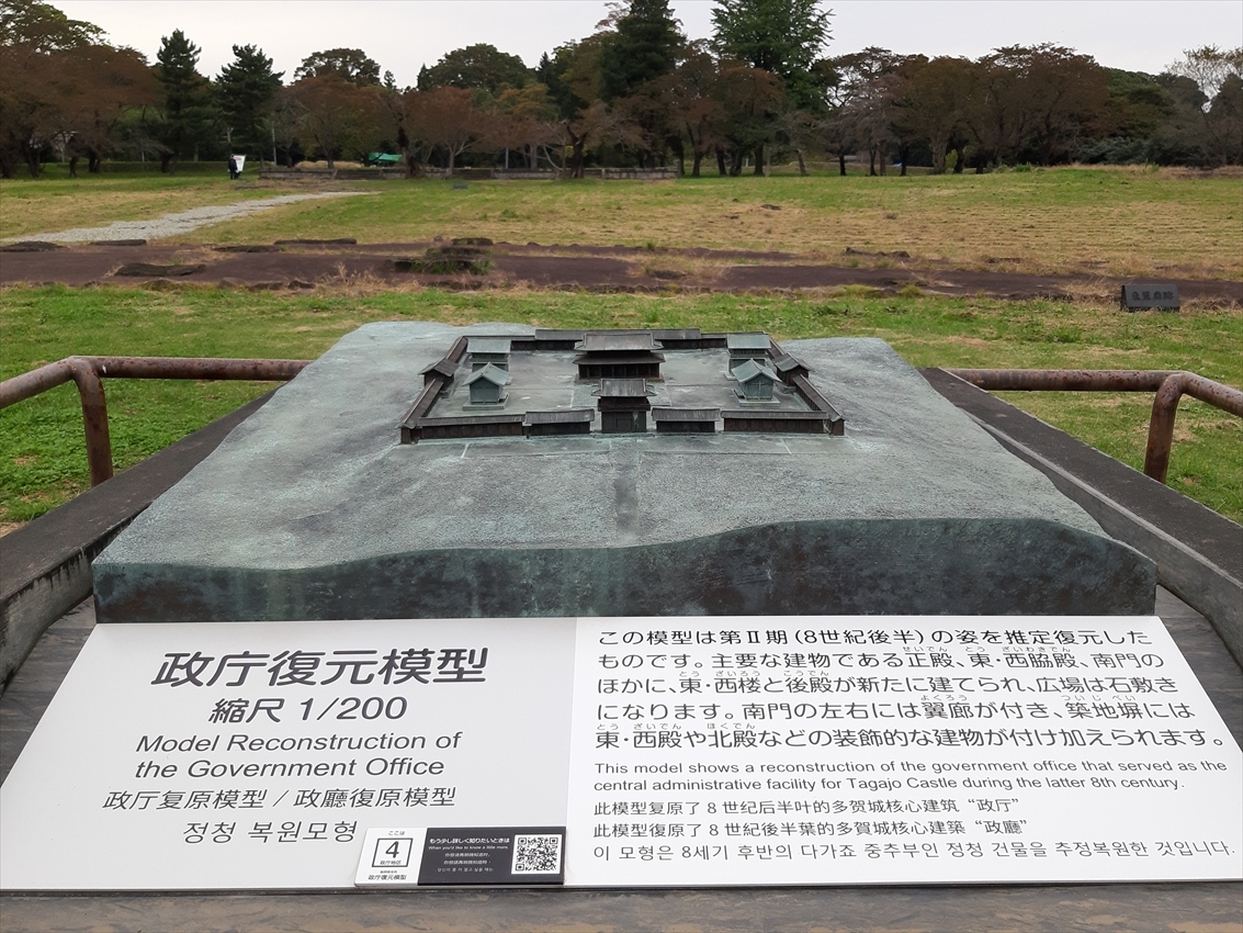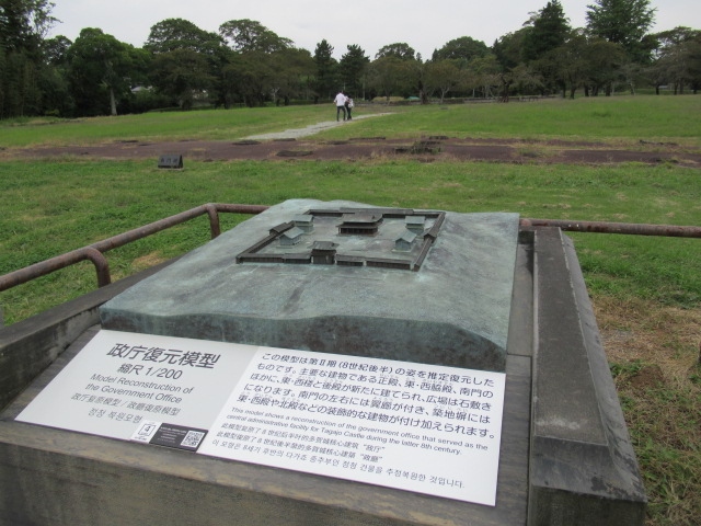 およそ1㎞四方の広さがあったという“城跡”は、石垣や櫓、天守閣などの建物などは全くなくて、緑に覆われた丘に基壇や礎石が所どころ見える程度です。政庁跡や廃寺跡など重要な政務や儀式を行った場所の跡には小さな復元模型や説明板がありますが、全容を想像してもなかなかその大きさを実感できませんでした。奈良平城京の大極殿が復元されたように、建物の一部でも復元されれば見ごたえがあるだろうにと思いました。