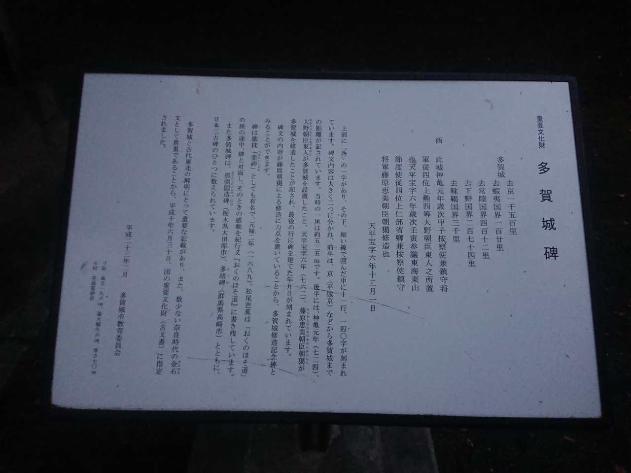 多賀城跡にある多賀城碑、奥の細道で芭蕉達はこれを「壺の碑」と勘違い