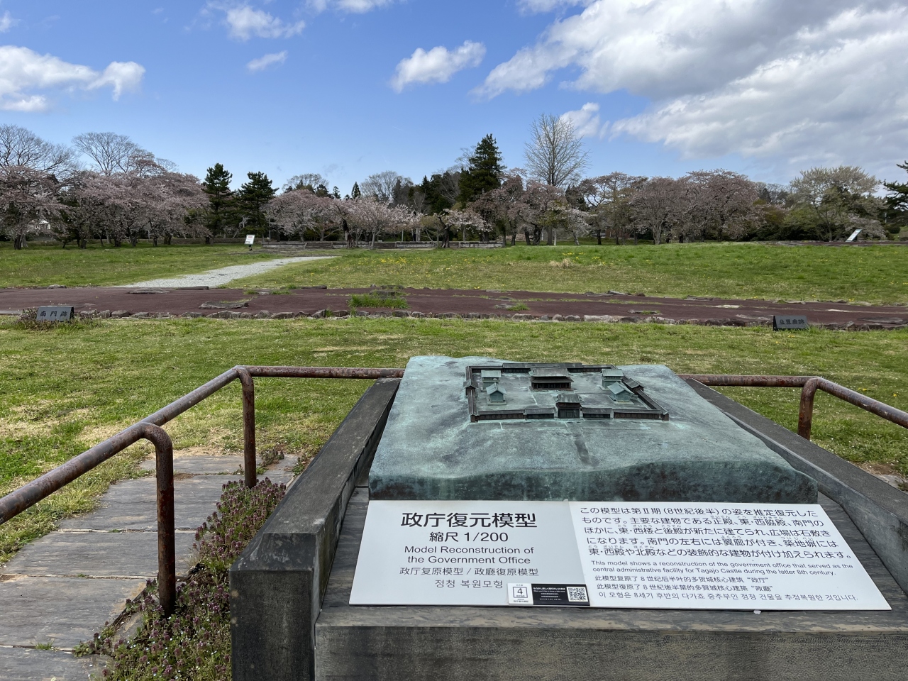 多賀城は724年に創建され、陸奥国府や鎮守府が置かれた場所で、平城宮跡、太宰府跡とともに日本三大史跡と呼ぶ人もいる。江戸時代初め、多賀城碑の発見により遣跡が多賀城跡であることが判明して以来、多くの学者によって研究され、その重要性が知られてきた。現在は国の史跡に指定された。広大な敷地の中に建屋の基礎が点在し、満開の桜がひときわ見事だった。 閉じる投稿日:2021/04/06