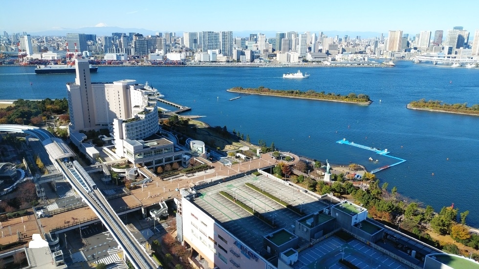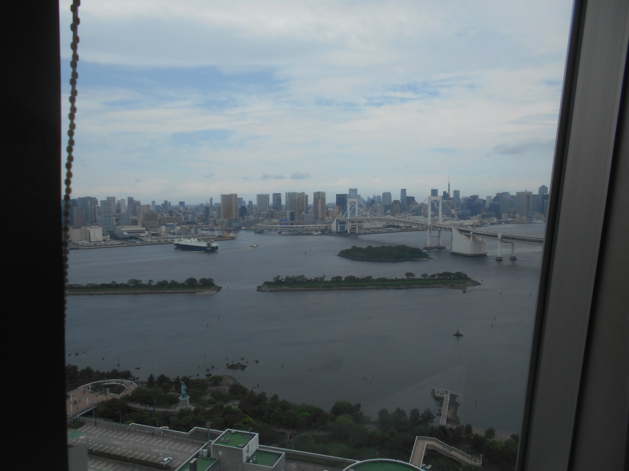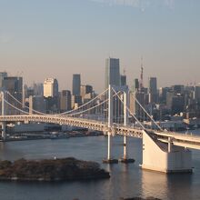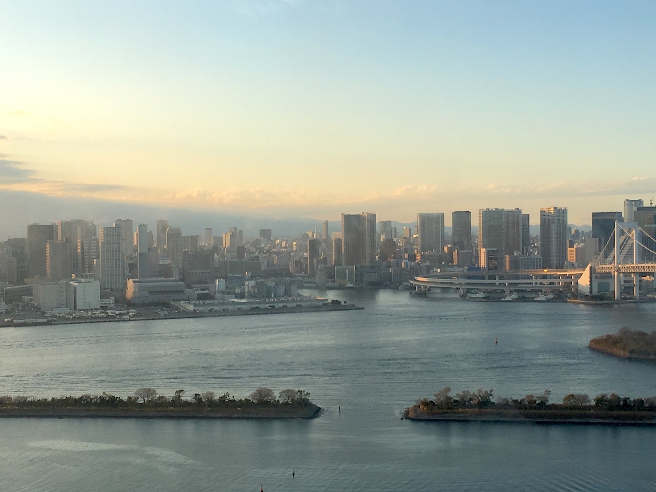 東京タワー、東京スカイツリー、レインボーブリッジ、お台場海浜公園と臨海都市を270度見渡せる球体の展望室に上がりました。