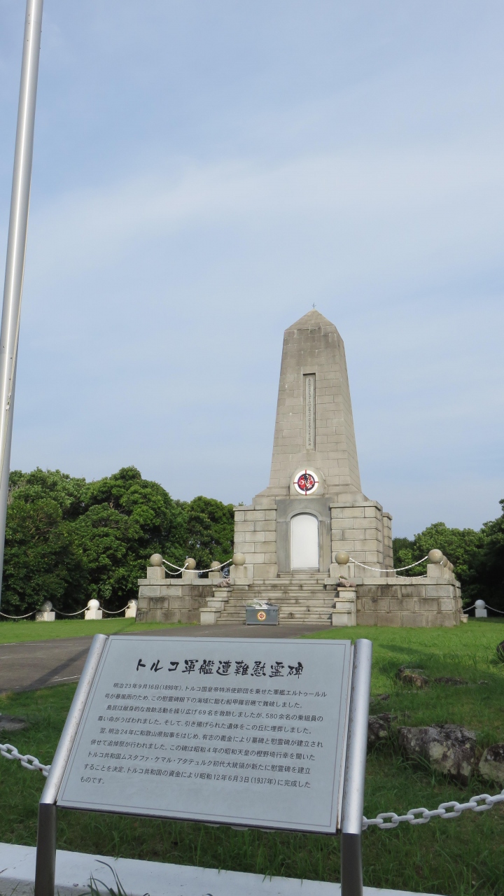 大島の一番奥にトルコ軍艦遭難綺麗碑とトルコ記念館がある。広い駐車場に車を停めて、高低差はないものの、結構距離を歩かなくては... 続きを読むならない。途中トルコ記念館の前を通ると日土両国旗が掲げられている。プレートはトルコ国旗と旭日旗が合わさったデザインになっている。反日韓国人が騒ぎそうだ。さらに奥に進むと左に「フェネル(Fener)」というトルコ雑貨の店がある。フェネルとはトルコ語で灯台を意味するらしい。そしてその先の右側にトルク軍艦遭難慰霊碑がある。思っていたより3倍くらい大きい。昭和天皇がこの地に行幸することをしったトルコ側が資金を出して作ったそうだ。明治23年に串本沖でトルコ軍艦「エルトゥールル号」が座礁して遭難、587名の犠牲者を出したが、その際、付近の住民が台風の中、総出で救助を行い、69名の生存者を救助した。その後、生存者は日本海軍の船によってイスタンブールに送り返したという。この事件を機にいまだにトルコは親日国となっており、イラン・イラク戦争の際に戦時中のイラン在住の多くの日本人をトルコ航空機が恩返しとして帰国させてくれたことは記憶に新しい。今後も両国間の関係を大切にすべきだと考えて慰霊碑に参った。帰りに「フェネル」で粘っこいトルコアイス400円を食べた。